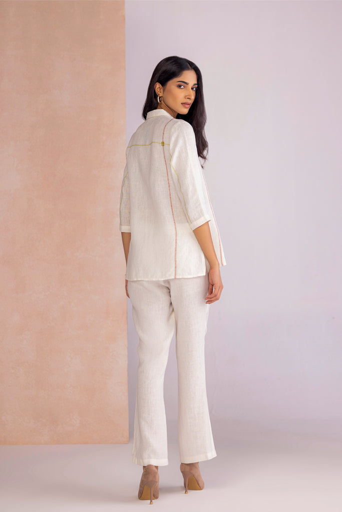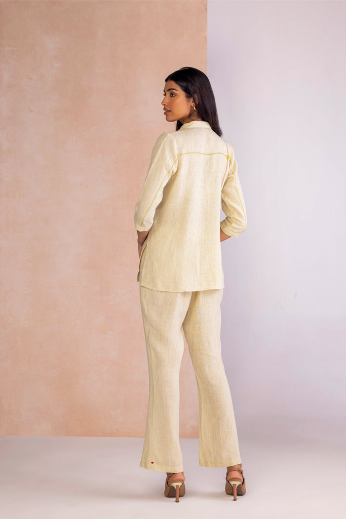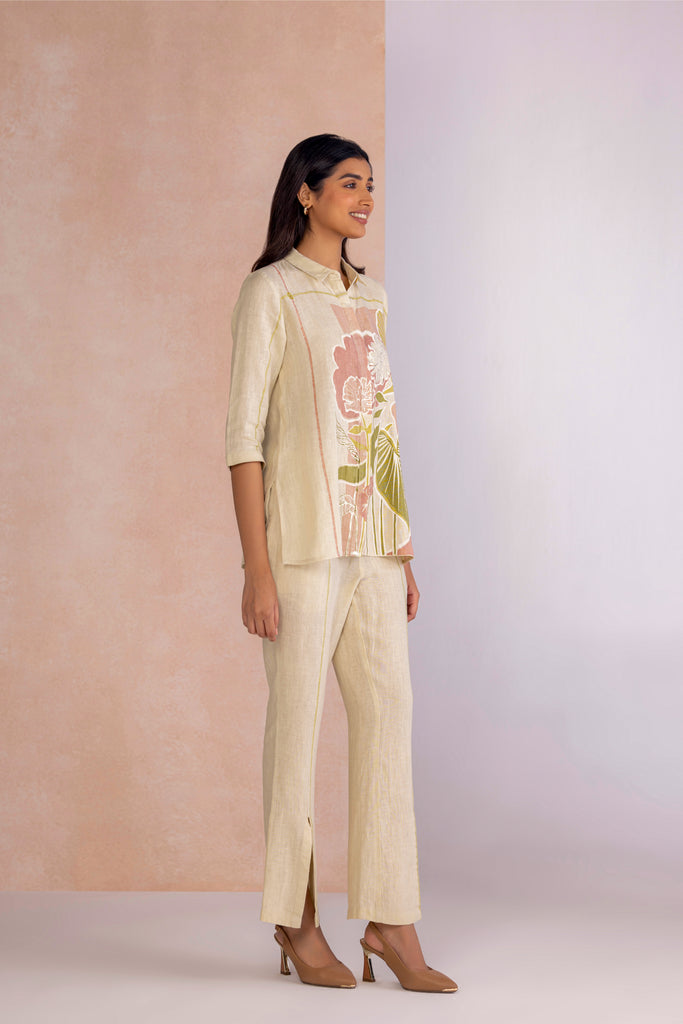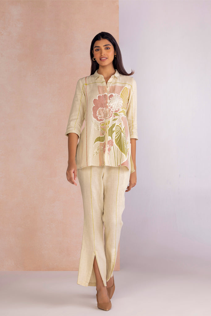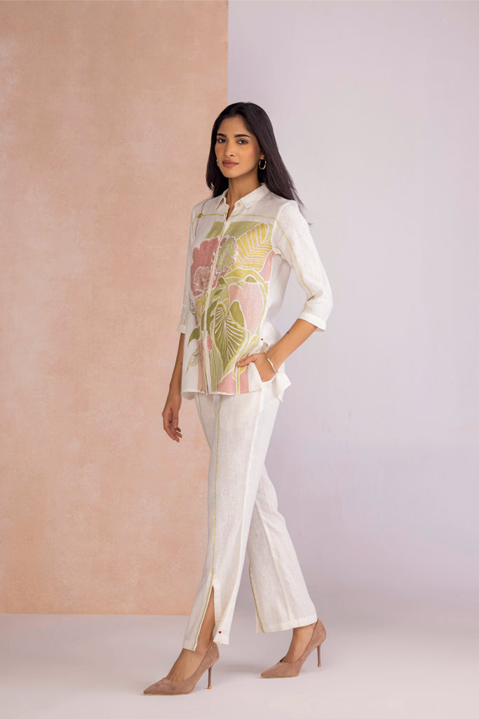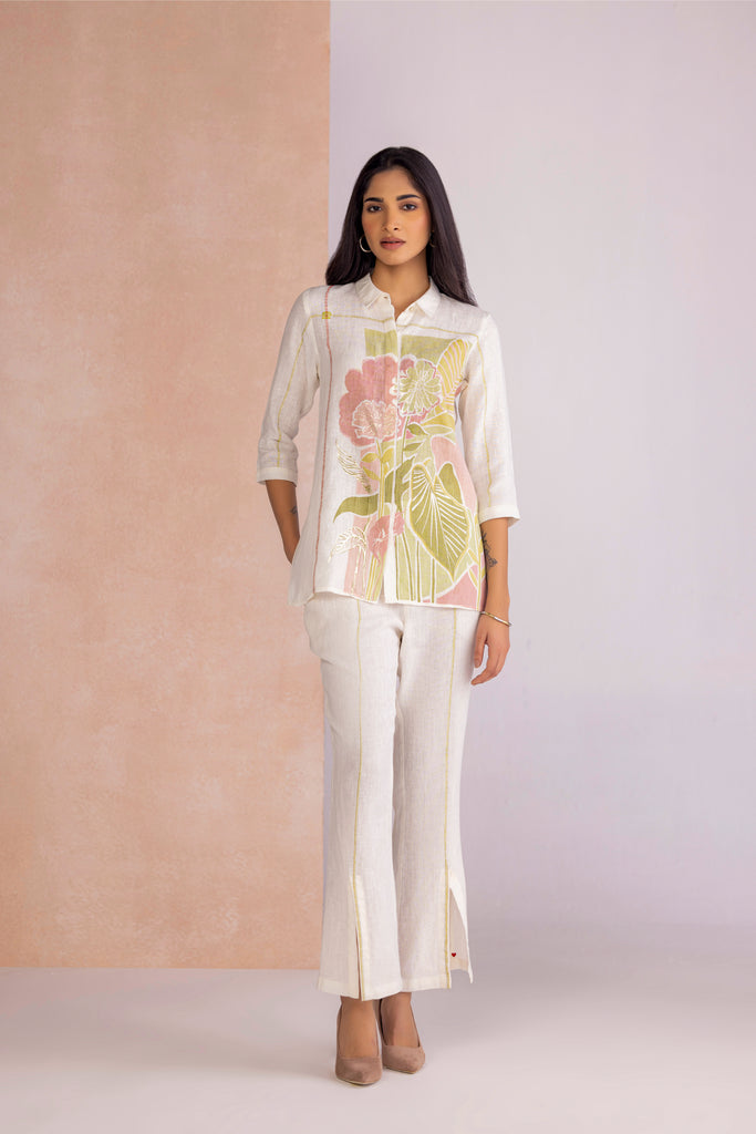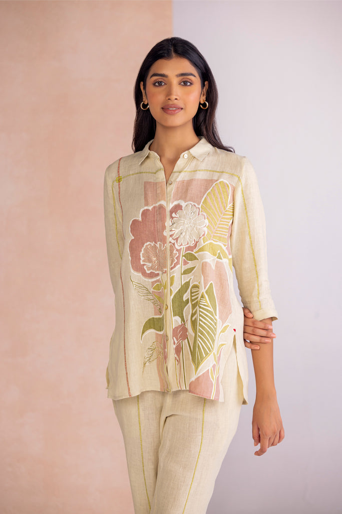 Vivid Dream draws from the fluidity of imagination, bringing together floral motifs and geometric framed abstracts in bold compositions. Crafted through the timeless art of screen printing and elevated with delicate foiling accents, each design carries a subtle shimmer that enhances its expressive detail. Offered in two colourways — Off White, embodying calm elegance, and Lane Green, evoking freshness and vitality — the collection transforms artistry into modern wearability.