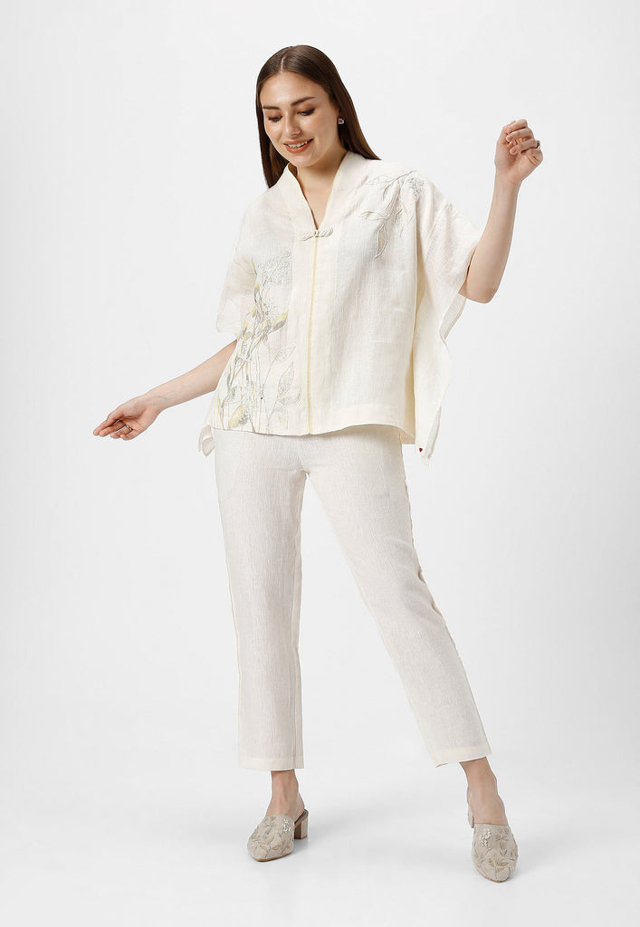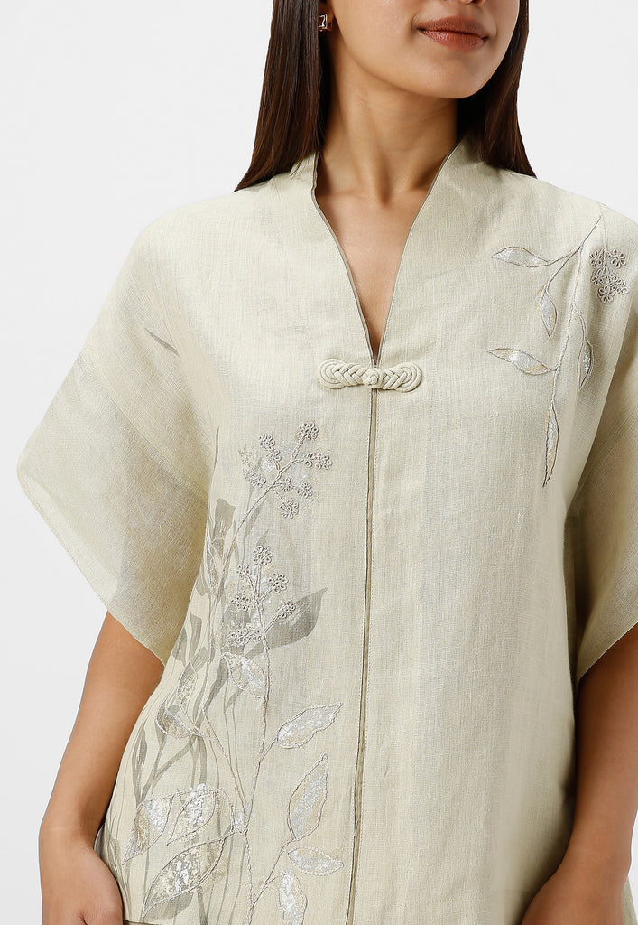 Inspired by the woody, ringed culms of the perennial bamboo, this magnificent range dons the intriguing shadows of these stems overlapping one another by virtue of a three-screen printing technique that is akin to beautiful water colours on fabric. Further elevating the design are intricately hand-embroidered leaves using anchor thread embroidery; stroked with light and dull shades of gold- adding a touch of shimmer with depth while embossing the beauty of the bamboo to the surface on fine linen. This sparkling range also makes for the perfect attire to work on special occasions. Available in stunning shades of off-white, macroon and green tea.