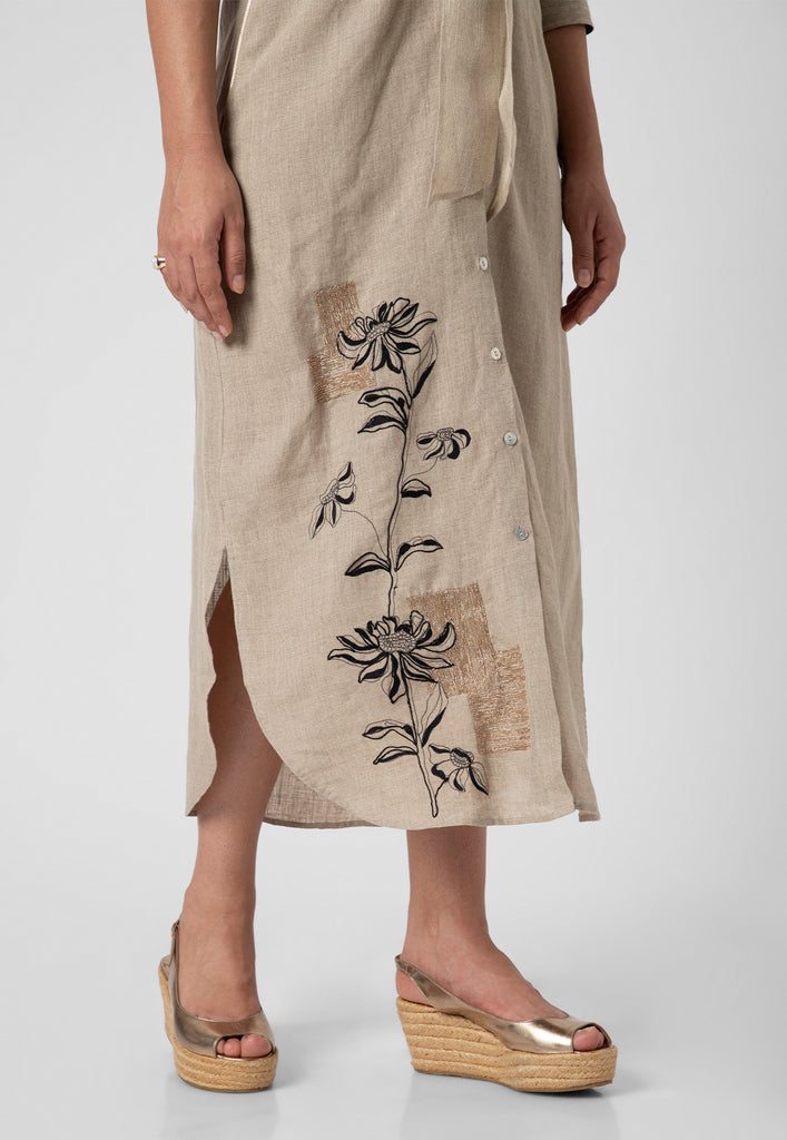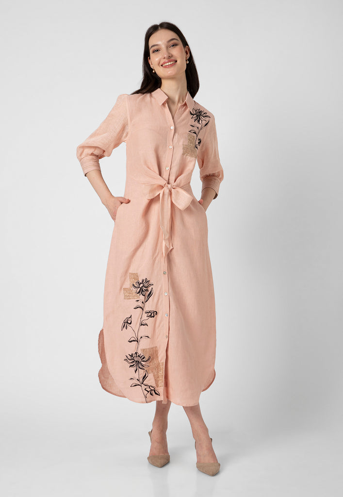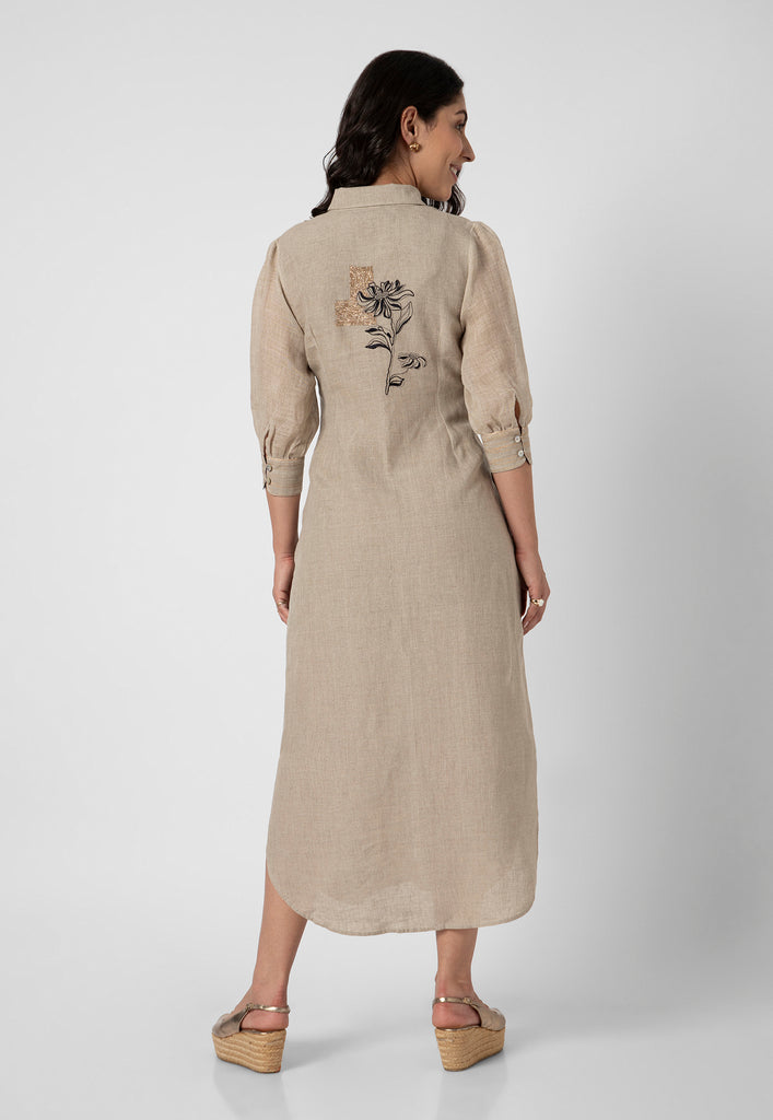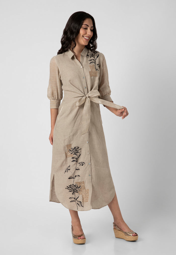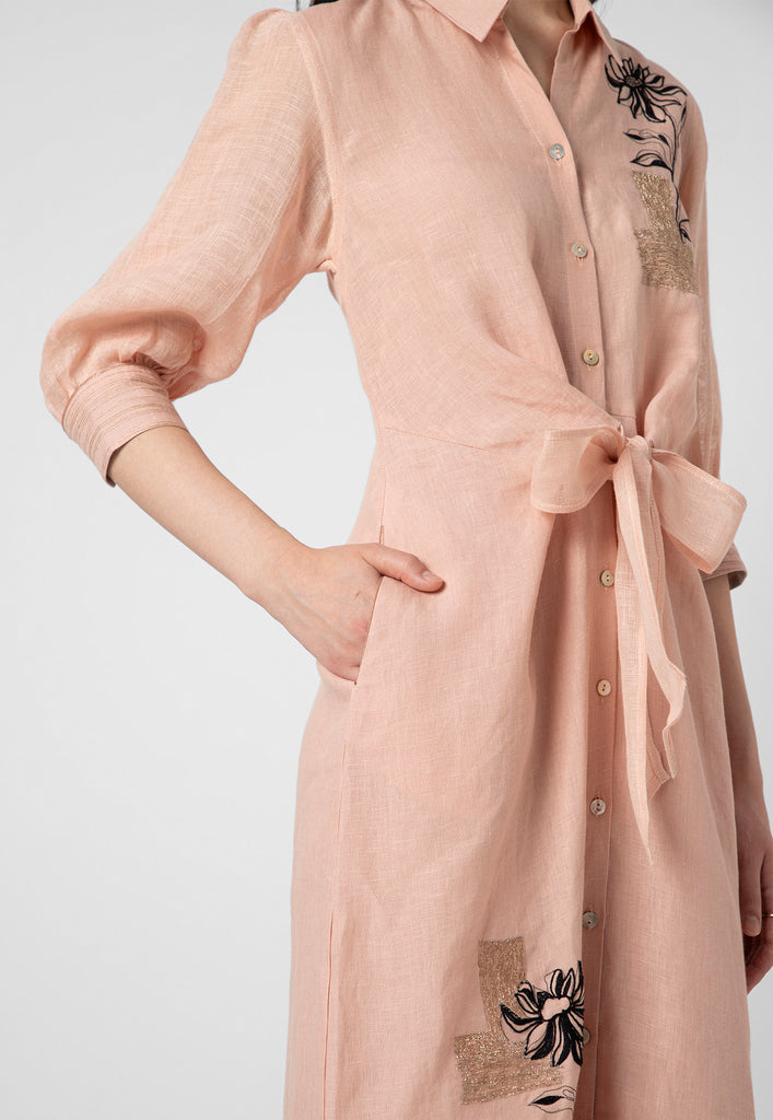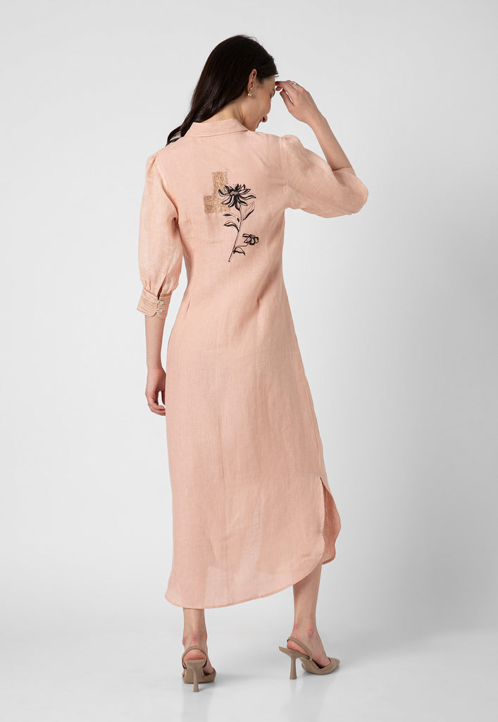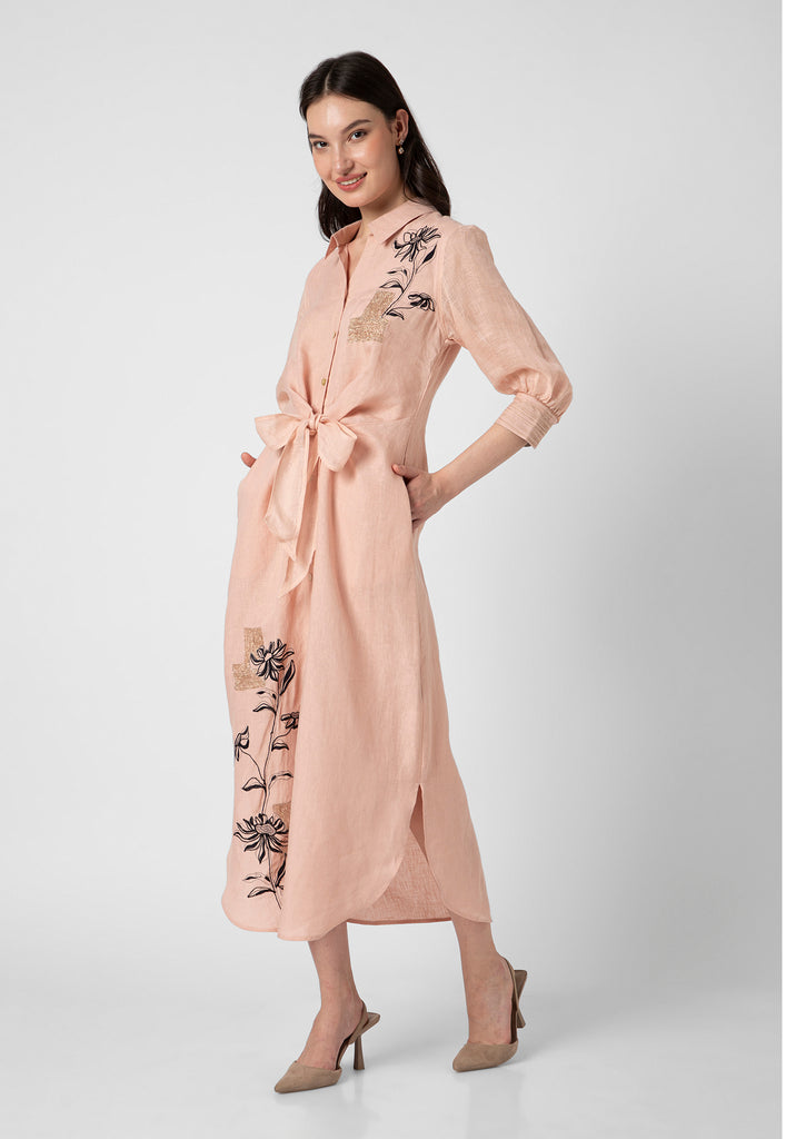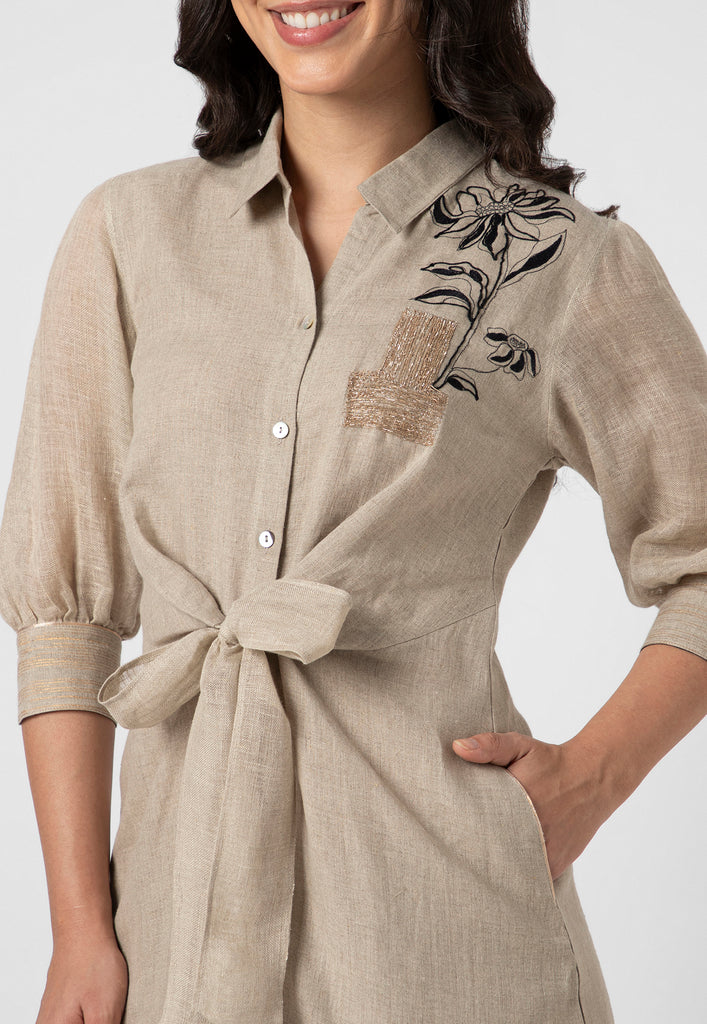 Our love for flowers blooms on luxurious linen with glorious handcrafted linear floral thread embroidery bordering thick and thin waves of its likeness; layered on a bed of beaten-up zardosi; hand-embroidered to bejewel the fabric for a touch of opulence and depth. Available in majestic shades of dusty rose, natural and ice.