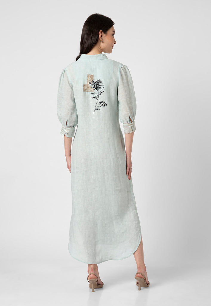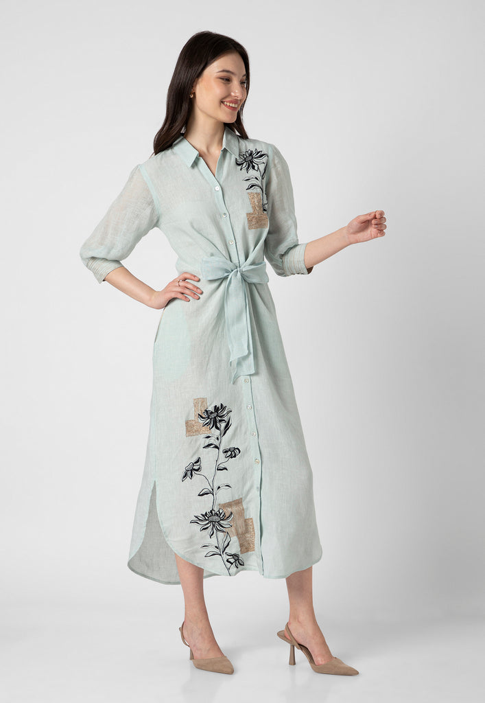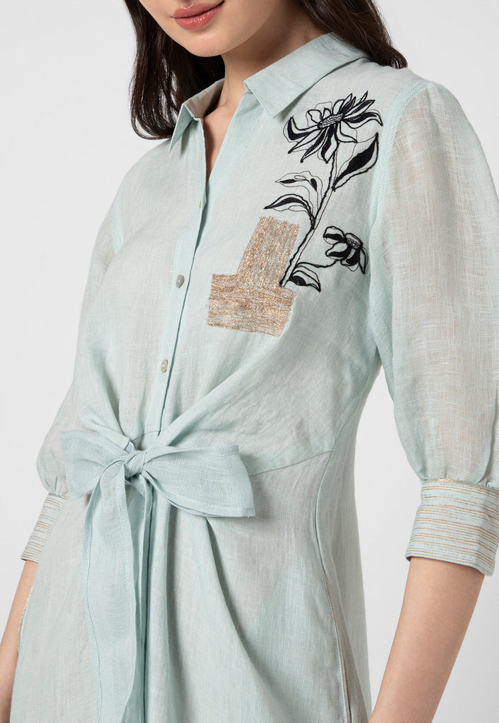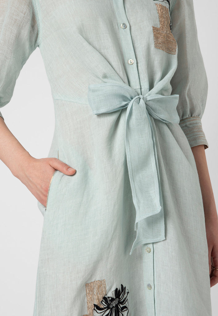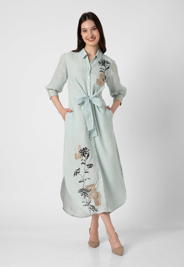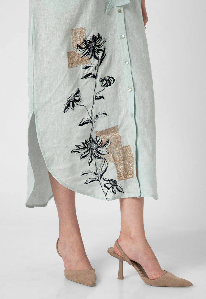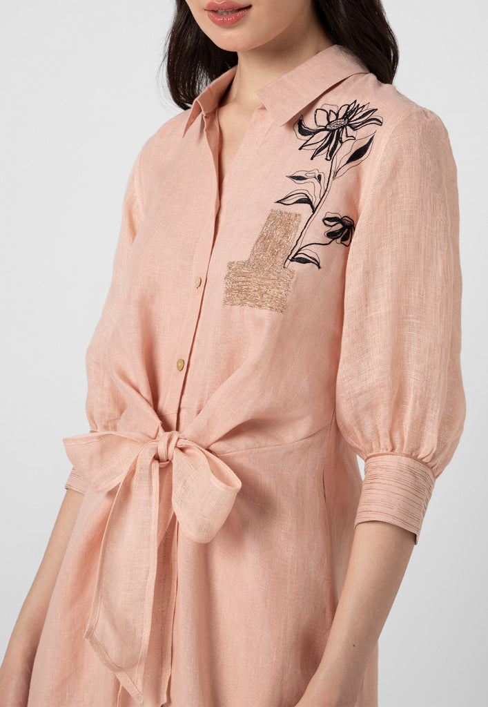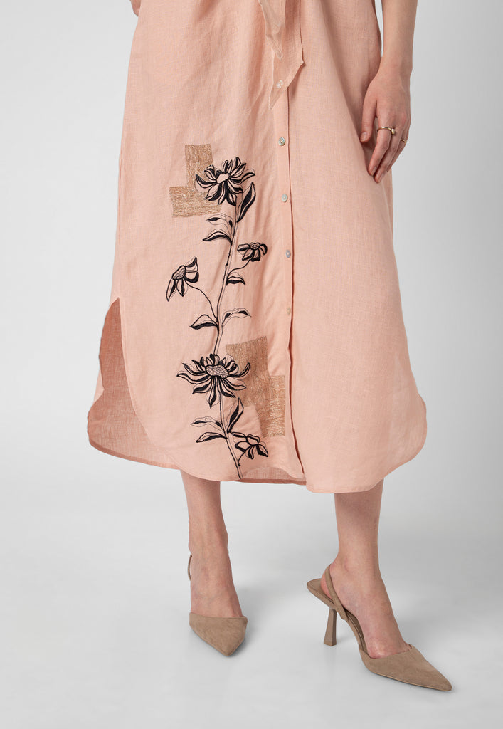 Our love for flowers blooms on luxurious linen with glorious handcrafted linear floral thread embroidery bordering thick and thin waves of its likeness; layered on a bed of beaten-up zardosi; hand-embroidered to bejewel the fabric for a touch of opulence and depth. Available in majestic shades of dusty rose, natural and ice.