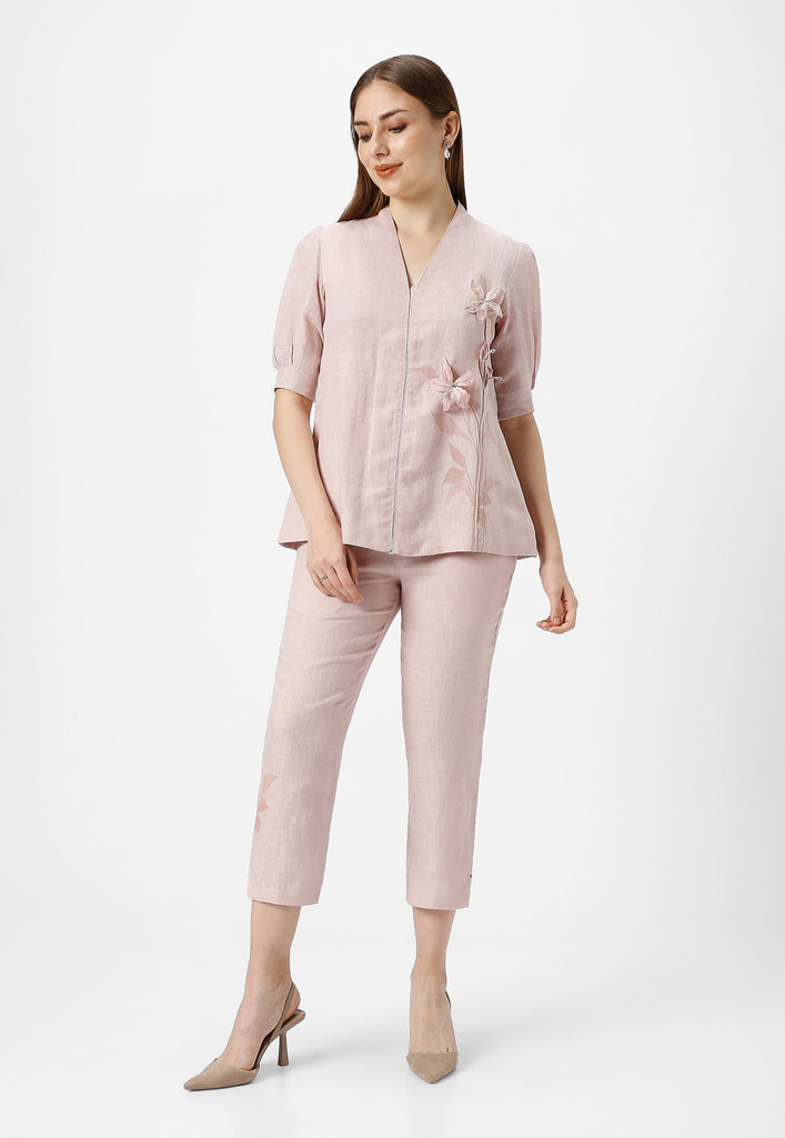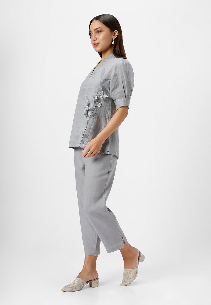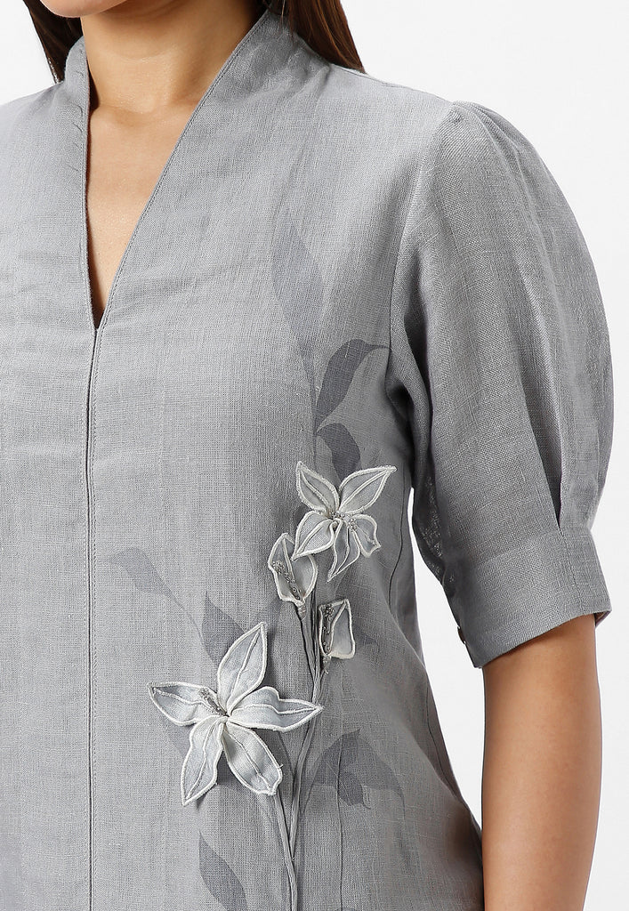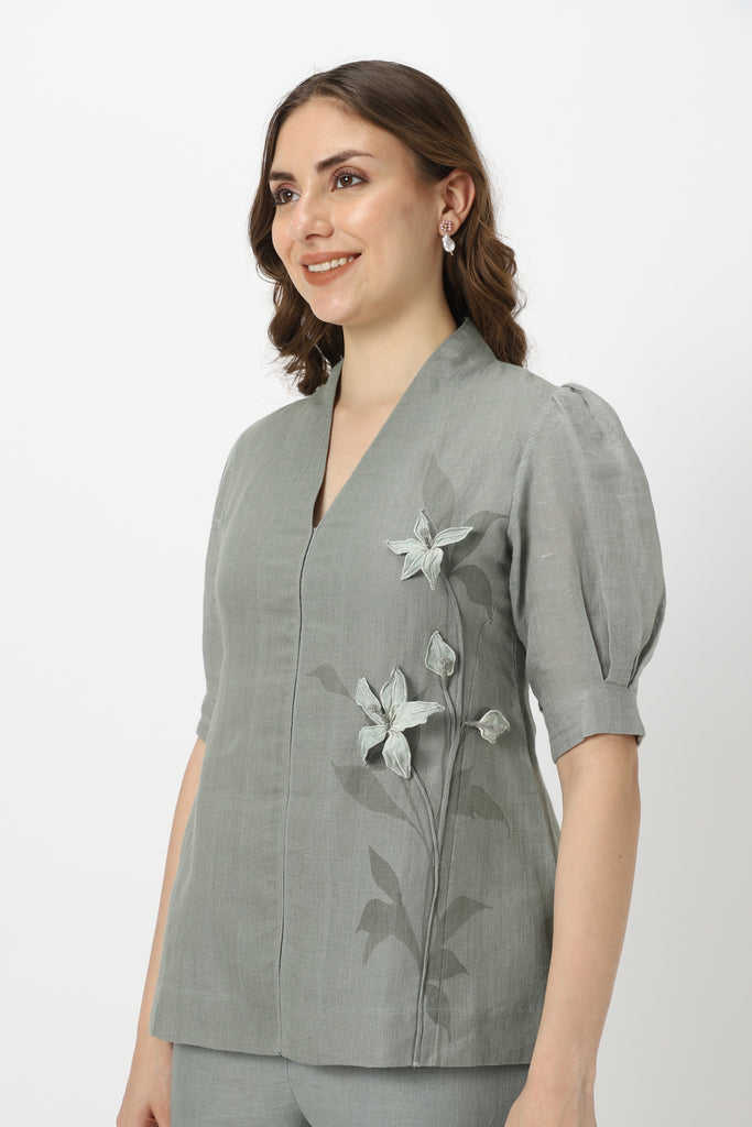 • Collared 'V' neck top with artistically appliquéd 3D lilies