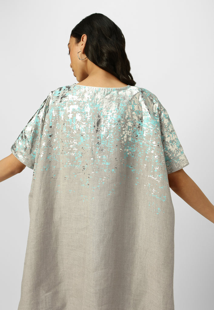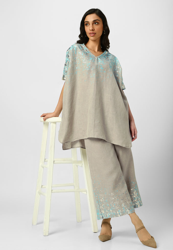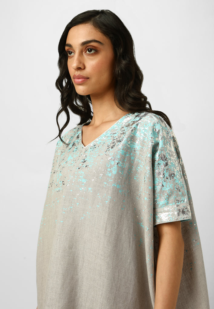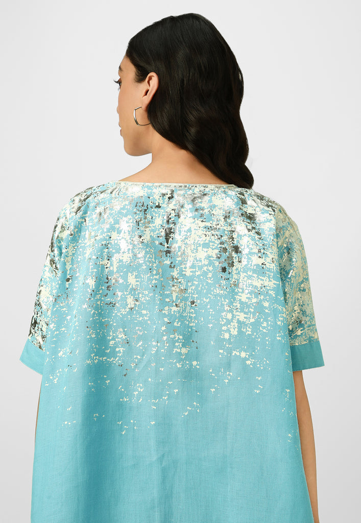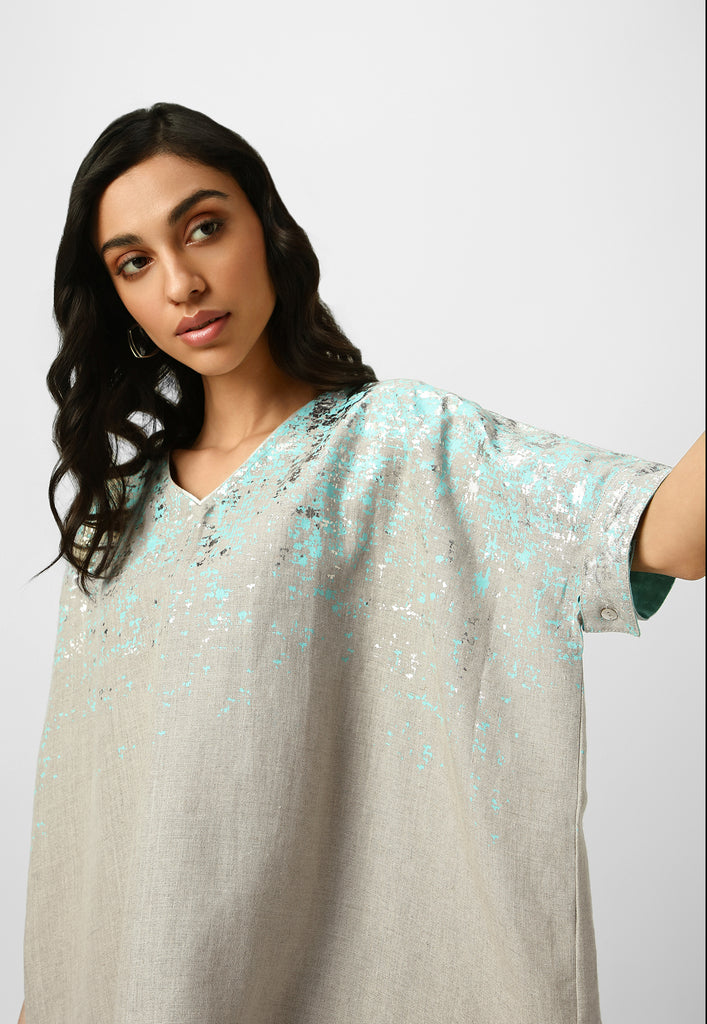 Step into paradise in a breezy work of art inspired by the rustic charm of Venetian walls. Crafted from the purest linen fabric in comfortable, angled silhouettes that beautifully curve on your body for your next getaway, this collection is masterfully shaded with captivating strokes and a touch of gold- using an amalgamation of foil and pigment- adding colour, depth and intrigue. Choose from a breathtaking combination of shades from neon-offwhite, natural-lagoon and lagoon-offwhite.