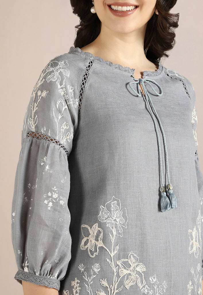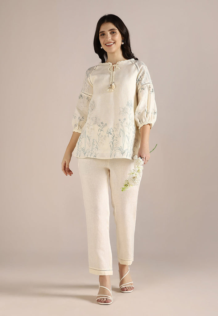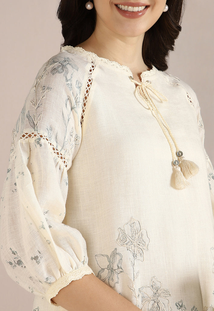 Embrace the sprawling grasslands and sunny pastures with the riveting tale of the Savanna: An exuberant range that boasts hand-drawn thin line strokes which spring to life with added depth using intricate anchor thread embroidery. Flaunting a Boho style approach, these exquisite pieces bear exaggerated sleeves, a collage of placement prints, and border prints; edged with pretty floral crochet laces to elevate your style with finesse and grace. Experience this gorgeous range in tantalising hues of shadow blue, off-white and blush.