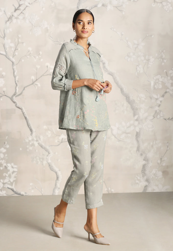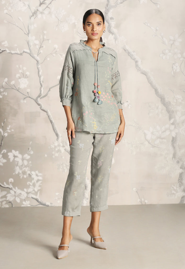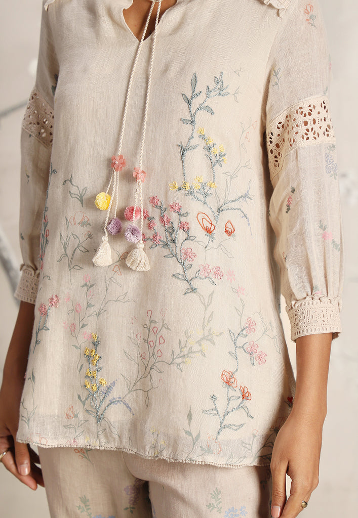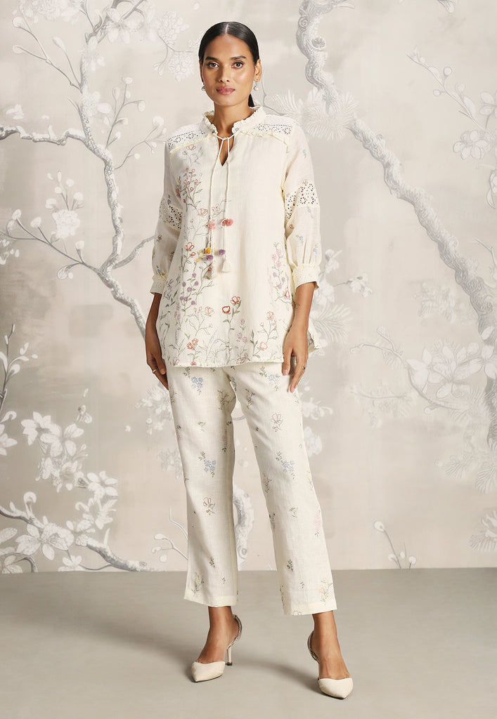 • A mandarin ruffled collar top featuring delicate Hakuba lace overlay and mesmerizing screen prints adorned with beautiful embroidery.