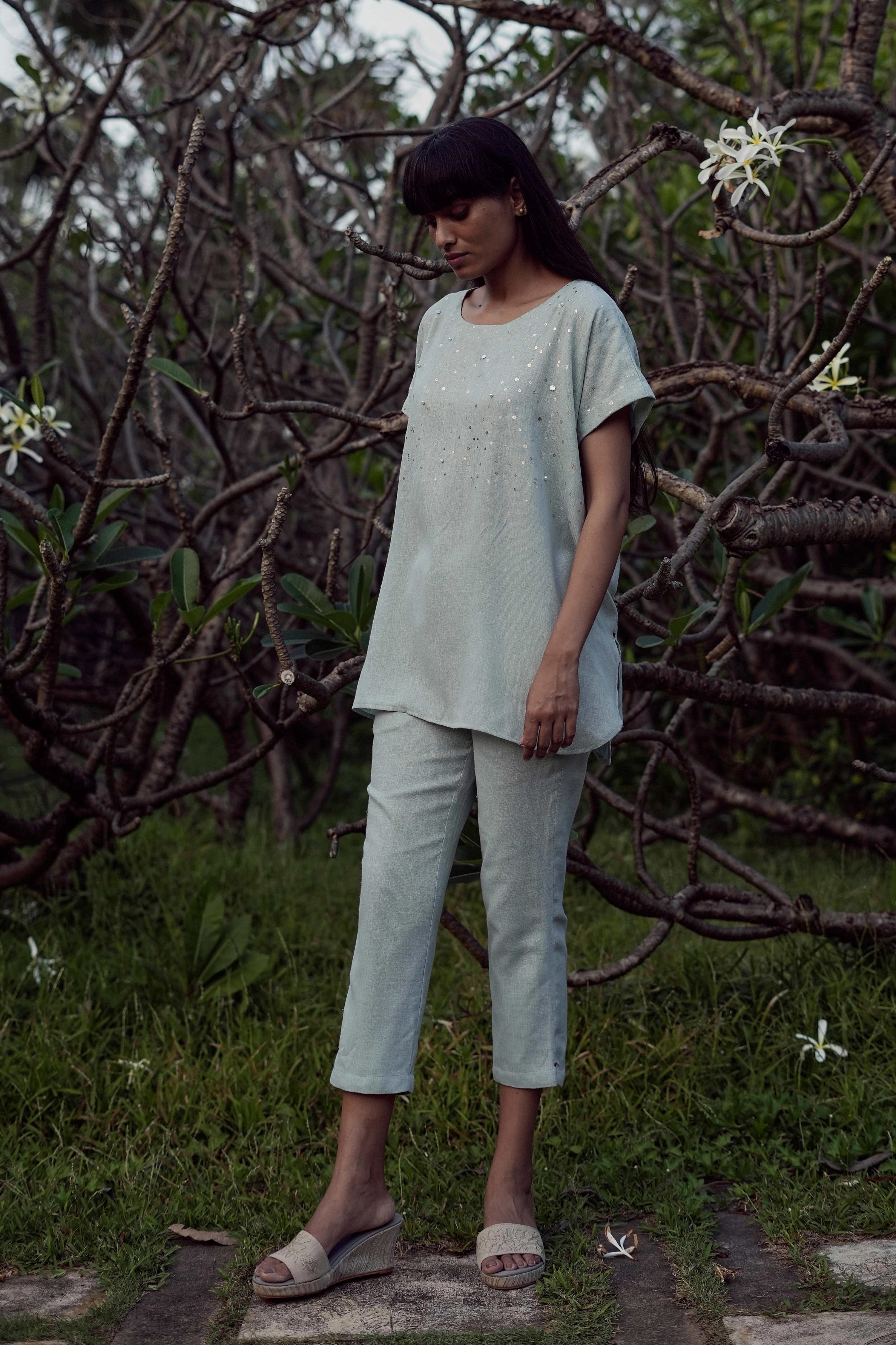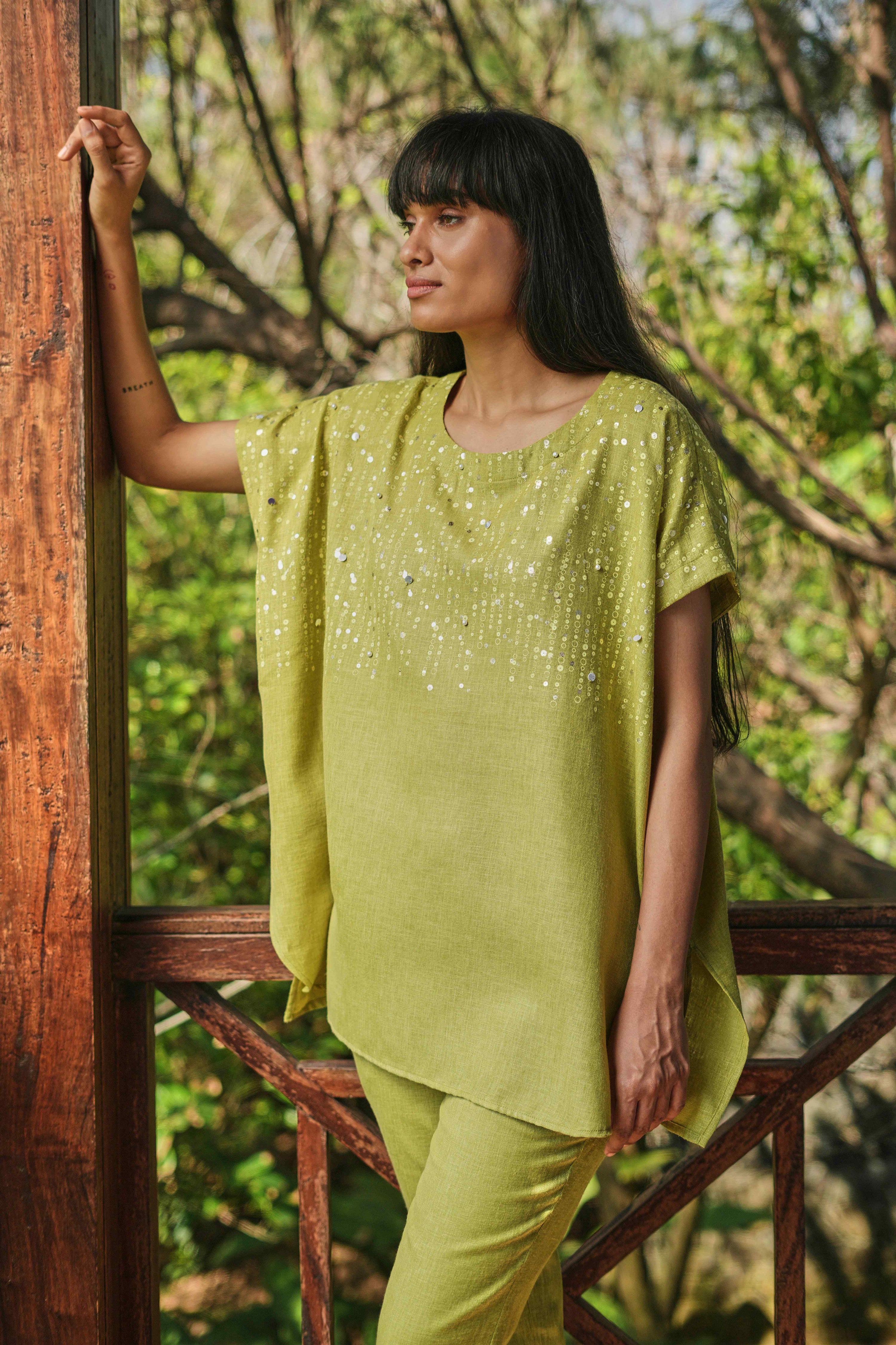 Shimmer strings is a quiet celebration of light and movement, where delicate shimmery strings fall like a gentle drizzle across each silhouette. A thoughtful play of prints is layered with subtle sequin and bead embroidery, finished with soft touches of foil to create a beautiful play of light. The harmony of techniques keeps the design effortlessly elegant. The styles are relaxed, easy to wear, and stylish, making them perfect for all occasions. Finished in soft pear and warm cashew tones, Strings of shimmer captures understated glamour with timeless ease.
