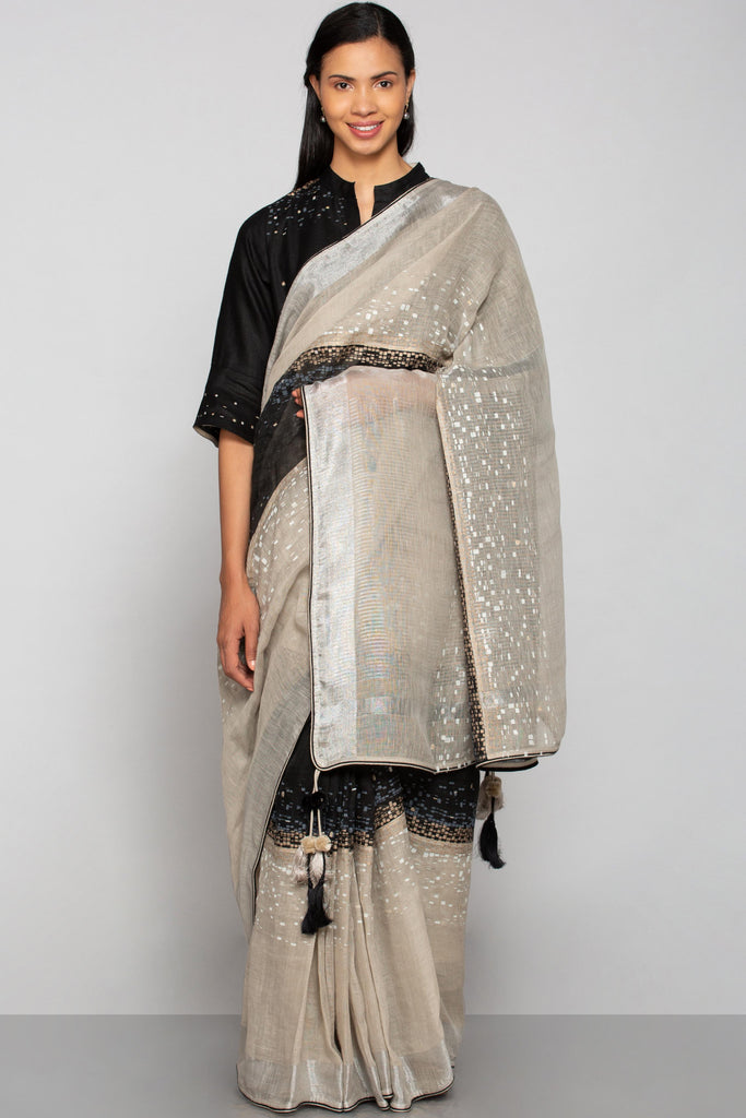A classic yet attractive saree in a combination of light and dark linen splits down in two different colours brought together with the “RUBIX” print – a scattering of geometric shapes with a touch of gold shimmer along with playful tassels enhances feminine charm and elegance.