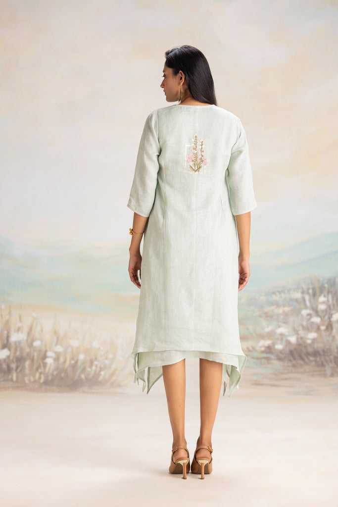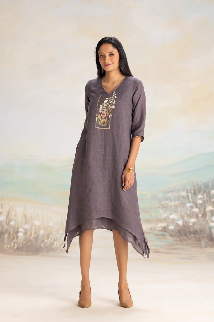 Behold a breathtaking bouquet of flora in cotton thread embroidery elegantly blooming out of a frame heat pressed with gold foil; with an embossed effect to add layer and depth; accompanied by the alluring texture of embroidered leaves and edged with a touch of gold for the finished hems all on a splendid body of luxurious linen. A glorious style to adorn for any and every occasion. Available in shades of iron and cloud