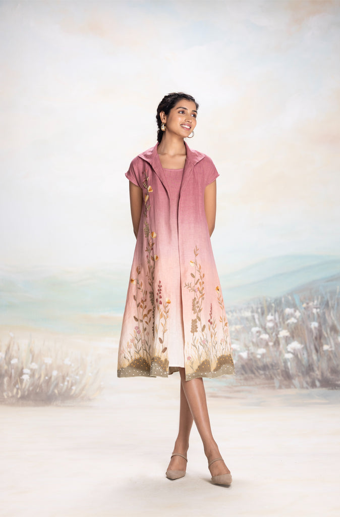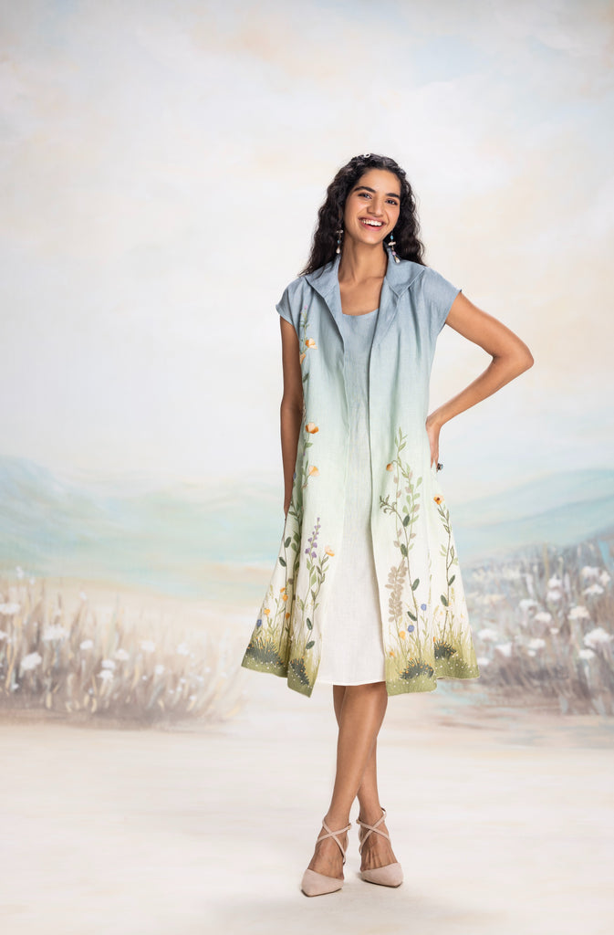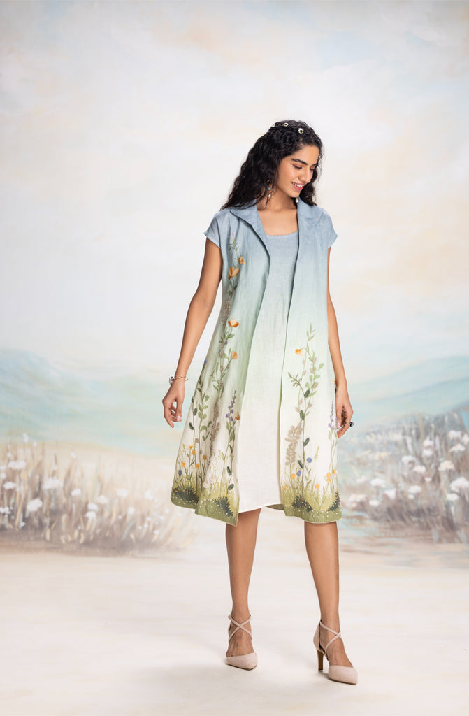 • A relaxed-fit collared jacket with fitted round neck inner dress with extended sleeve adorned with landscape inspired embroidery cotton threads, along with delicate handmade crochet flowers and leaves.