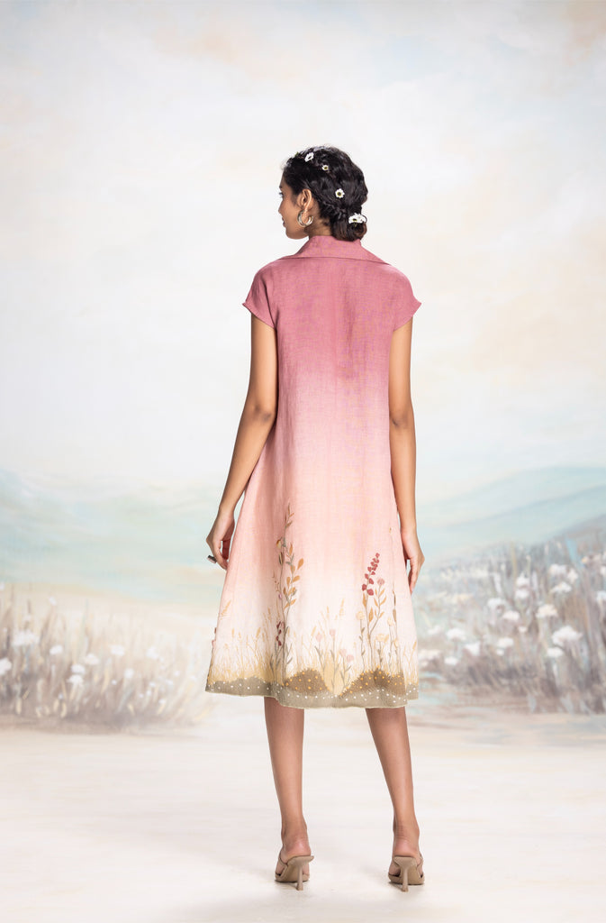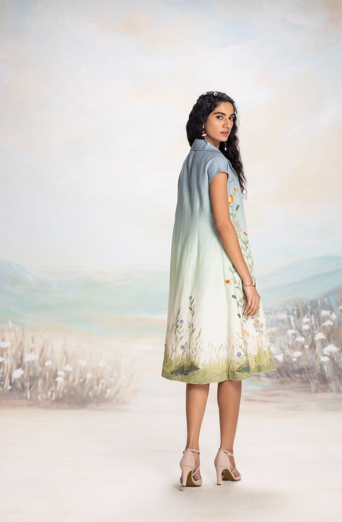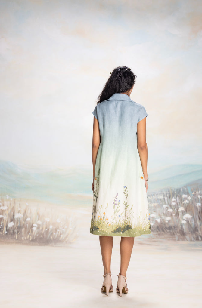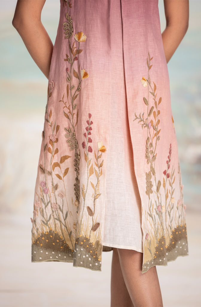 Escape to tranquil outdoors with the poetic decadence of Landscape. A breathtaking collection that captures a sunny afternoon or sun-kissed horizons at sunset in luxurious linen. Each piece is bathed in soothing tonal ombre dip-dyed shades, enriched layer by layer with handmade crochet embroidery, screen printed and shadow painted flora and fauna. Intricate cotton thread embroidery buoyantly moves across the fabric adding depth and dimension to a picturesque meadow. Perfect choice for evening soirées or special occasions, these elegant styles honour craftsmanship at its finest- celebrating artistry and you.