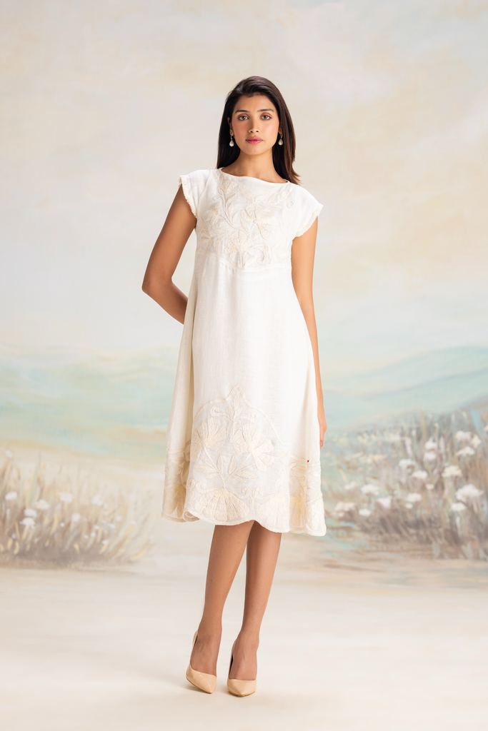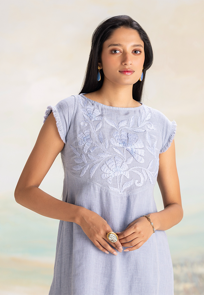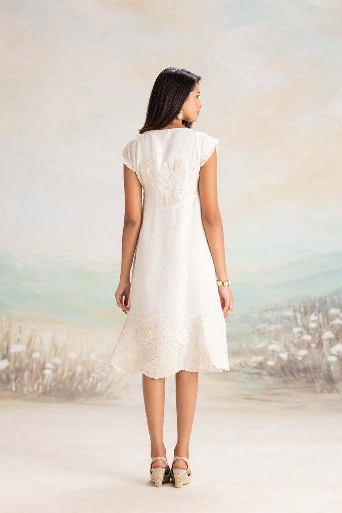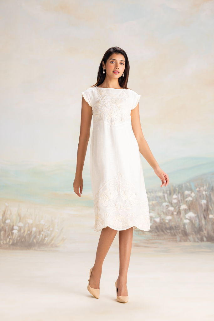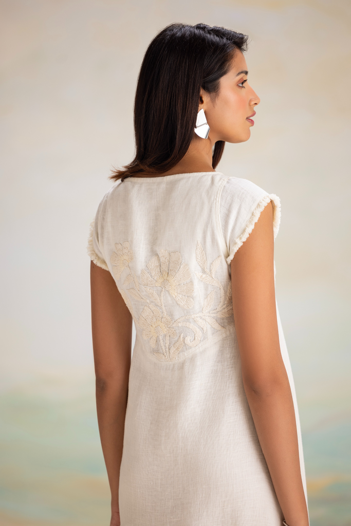 Step into the season with effortless grace in Snow Flower - a stunning collection inspired by the ethereal yet resilient White Crocus. Designed for tranquil moments under the sun for your next getaway, each piece is handcrafted from light weight breathable linen fabric, hand-embroidered with tone-on-tone placement embroidery- pervading seamlessly along the body of the fabric. A stylish testament to exquisite craftsmanship and breezy sophistication.