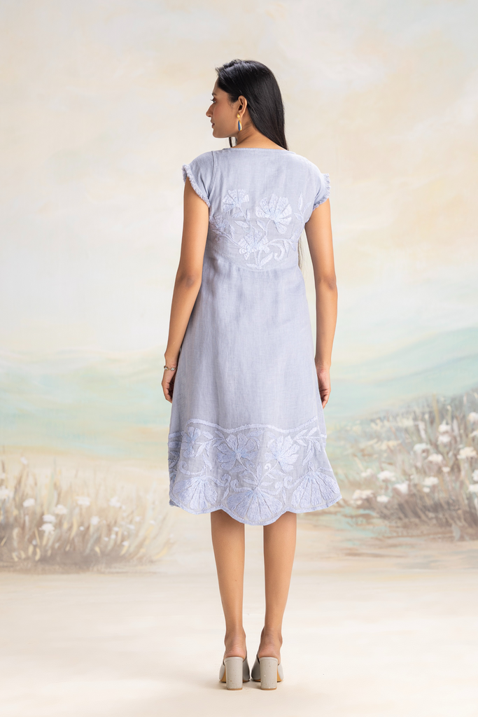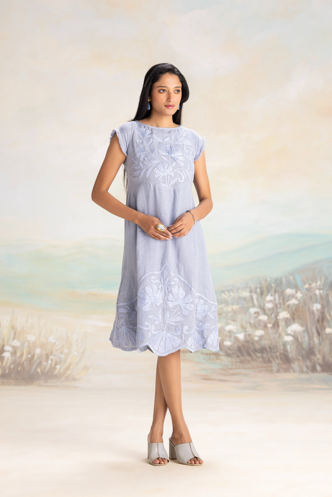• Designed with a U-shaped waist yoke and a beautifully scalloped hem, the dress offers a sophisticated structure, completing the ensemble with a timeless, understated charm.