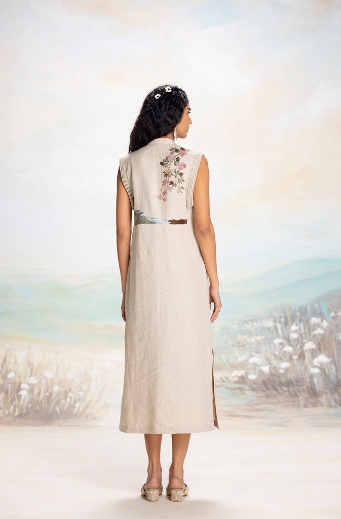 • Handcrafted with Layered appliques featuring a scenic tapestry of delicate leaves and blossoms meticulously crafted from hand-cut organza and linen, creating a beautiful interplay of textures and depth, accompanied by a breathtaking view of the lush greenery and cascading waterfalls that ebbs and flows in stunning cotton thread embroidery.