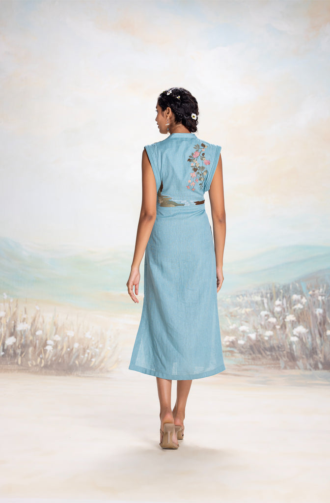• Dress Length 48"/ Model height 5'9" • An elegant dress with a center front tie-up, beautifully accentuating the V-neckline. The shoulders are adorned with sophisticated power cord piping and delicate embroidery, adding a refined, artistic touch to the design. This dress combines timeless elegance with contemporary detailing, perfect for any special occasion.