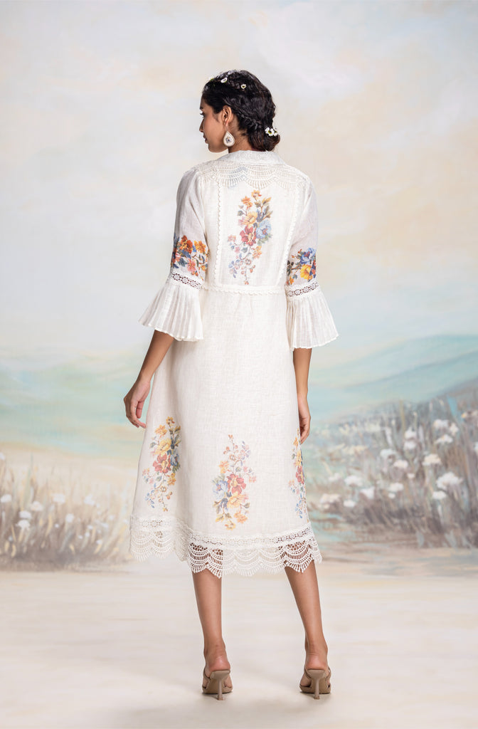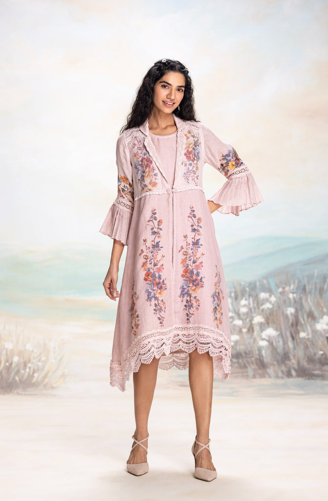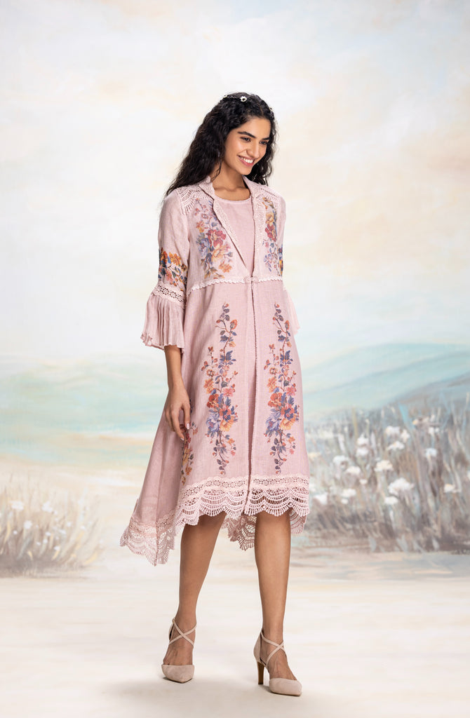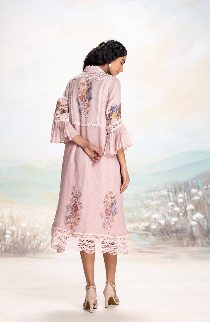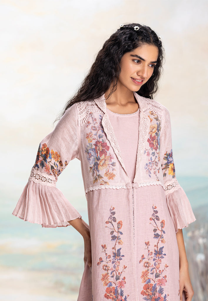 Welcome the season in the alluring Vintage Rosa - a stunning collection that is a stylish nod to Persian-inspired art and tapestries from a bygone era. A melange of flora and fauna on luxurious linen spring to life by the utility of four primary colours to create captivating hues and translated the CMYK printing technique by hand-traditionally seen in digital printing on paper- resulting in a likeness to a digital print. Finished with the dainty elegance of lace, pleated sleeves and lace inserts, the collection exudes feminine grace at its finest. Available in gorgeous shades of shadow rose and swan.