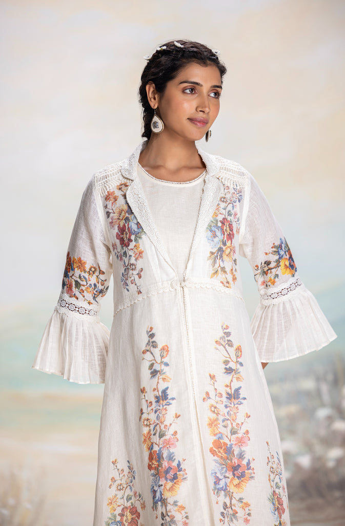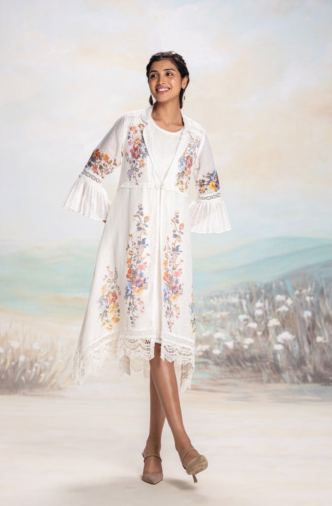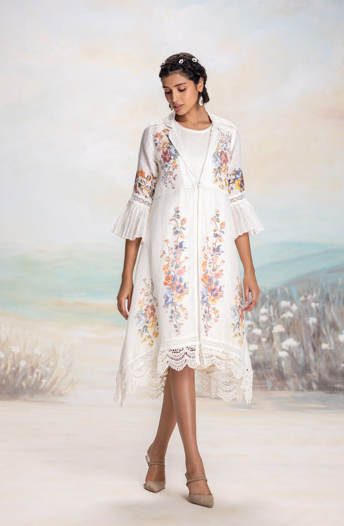 • Jacket and Inner Dress Length 45” / Model height 5'9" • A round-neck linen jacket that comes with a inner dress featuring a shawl lace collar, a high-low lace hemline and a handmade chord closure button on the front for a graceful, elegant look. The 3/4 sleeves feature lace inserts, continuing into beautiful knife pleats that flare out the hem.
