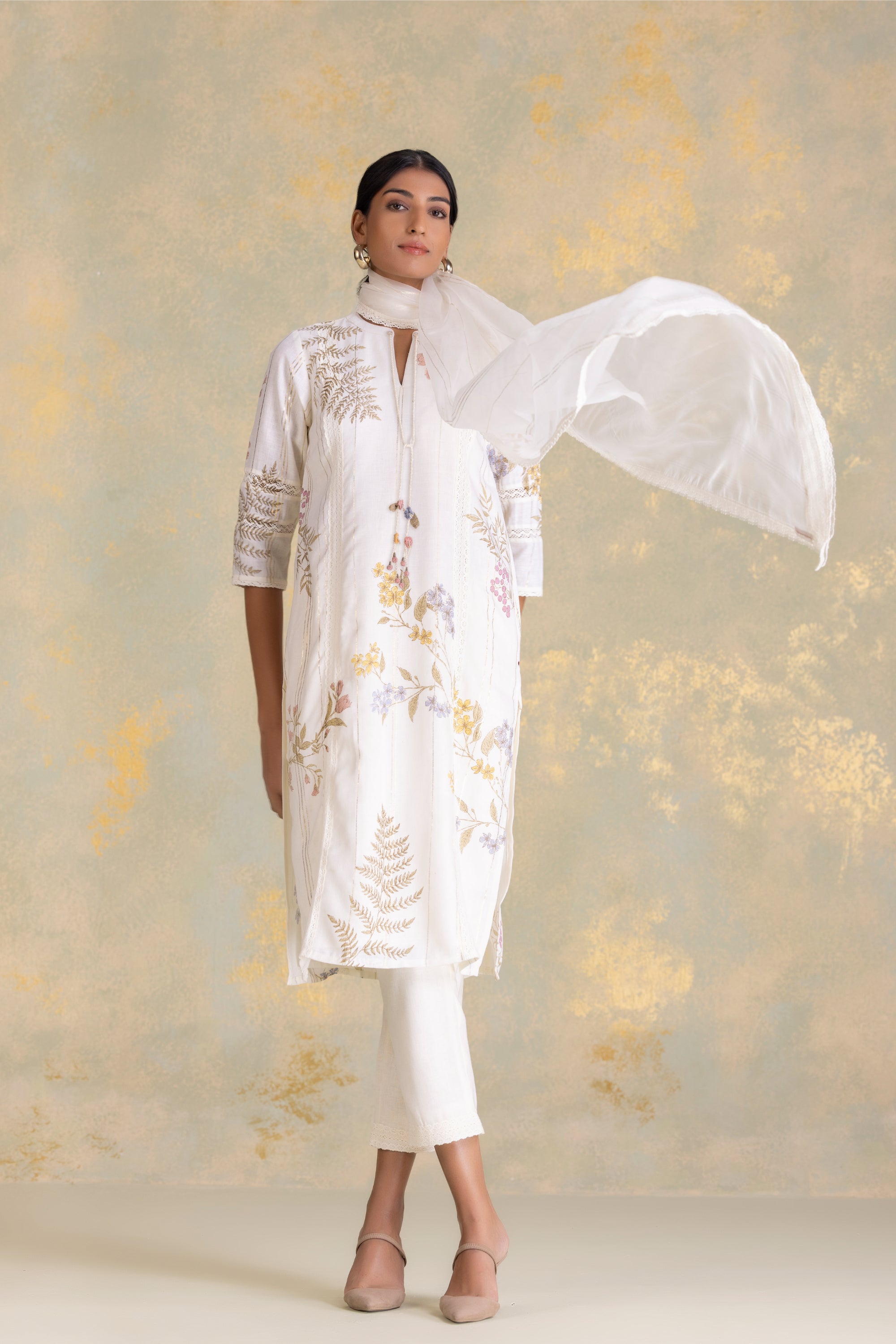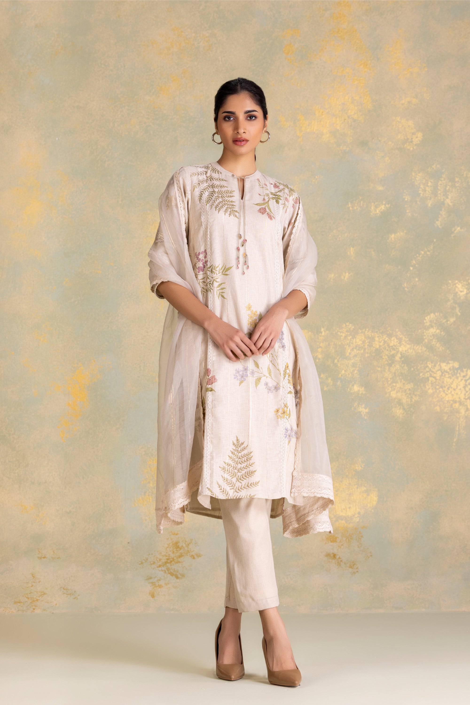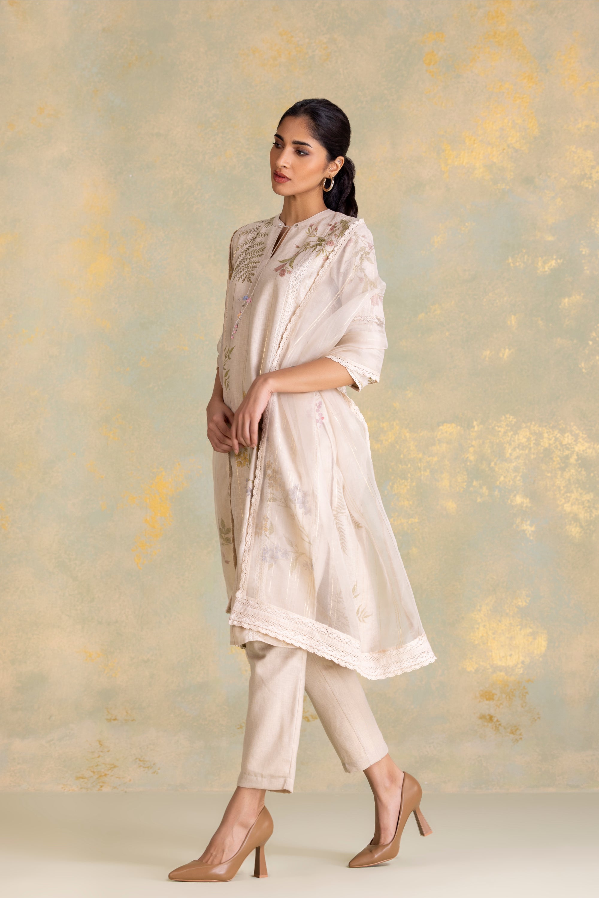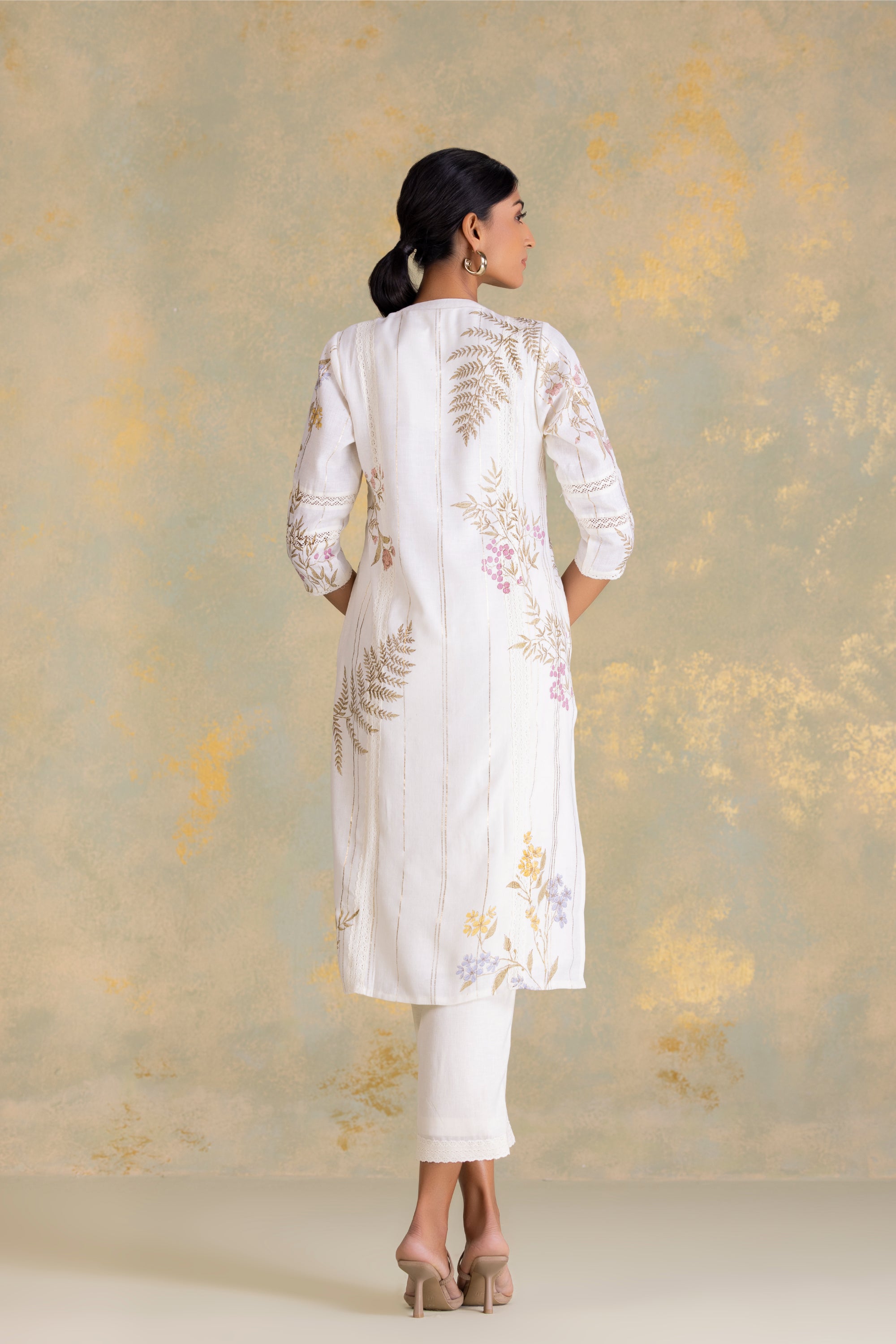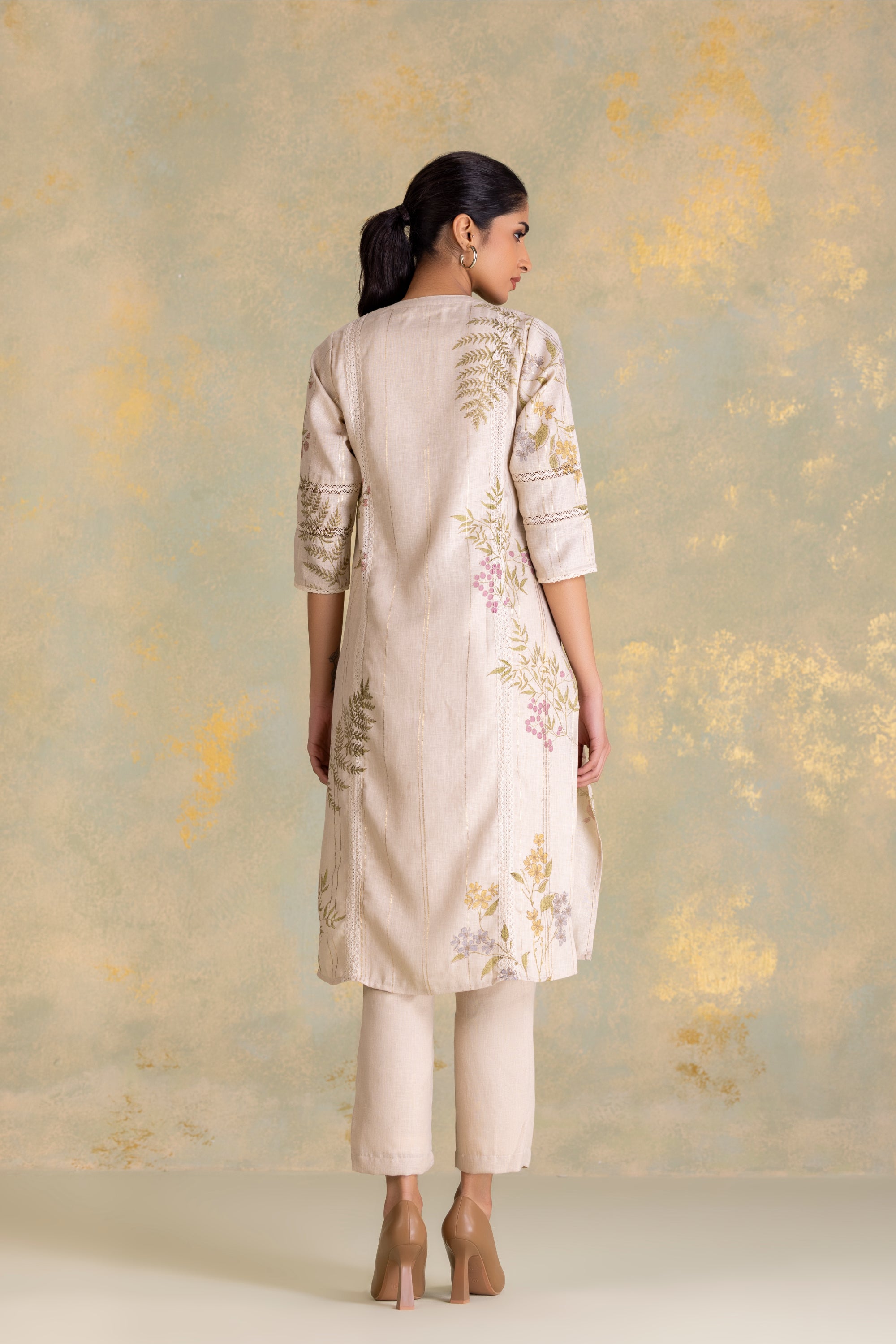 BOTANIQUE is a poetic ode to craftsmanship and nature’s quiet elegance. Each piece features delicate screen-printed florals that bloom across intricate laces, their beauty enhanced by subtle gold-foiled stripes that glimmer just behind the flowers, adding depth and a gentle radiance like sunlight filtering through foliage. The interplay of lace, print, and metallic sheen brings a sense of layered artistry and refined texture. Offered in hues of off white, natural, and blush, the collection embodies an effortless softness, a modern botanical romance woven with artisanal care and timeless femininity.