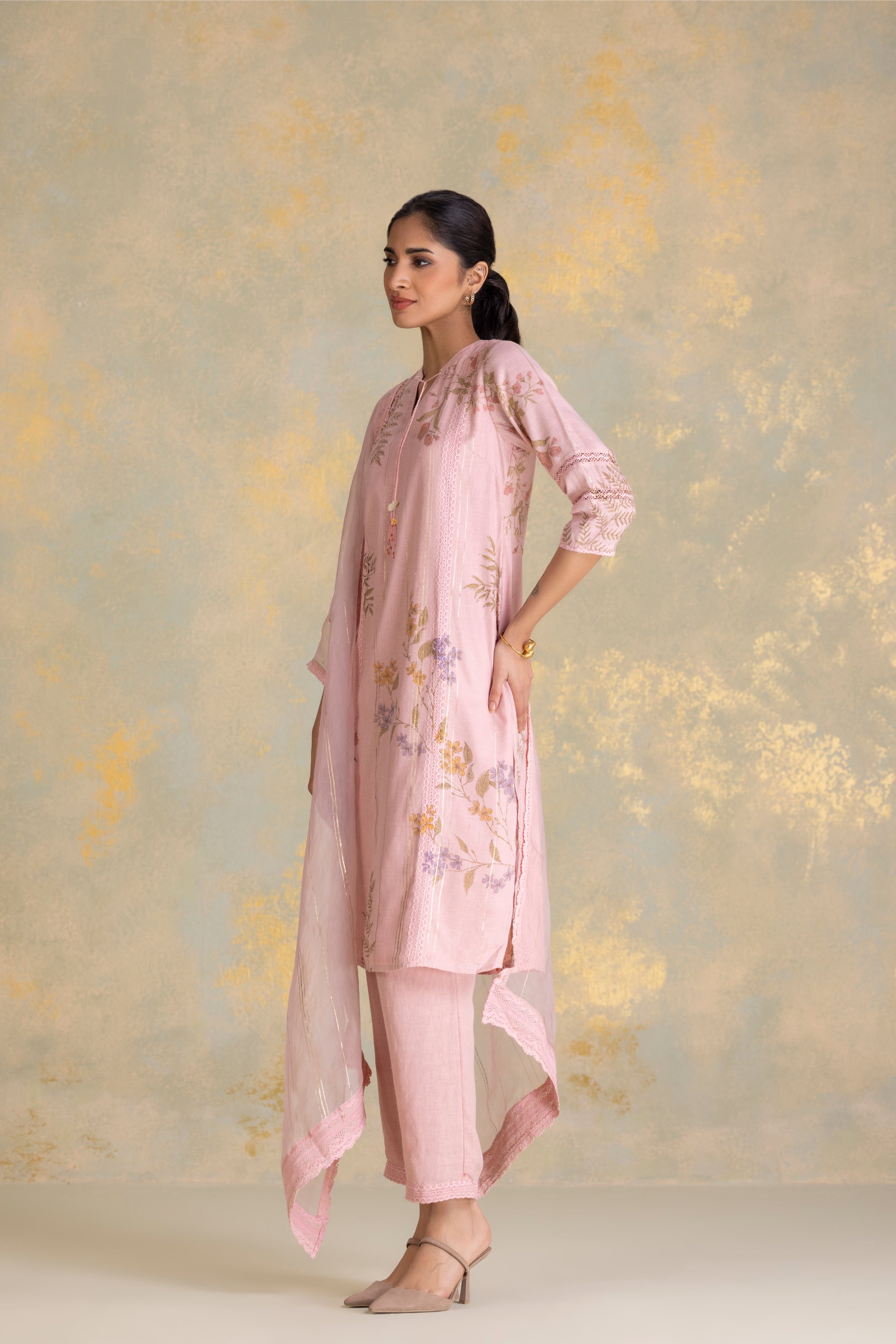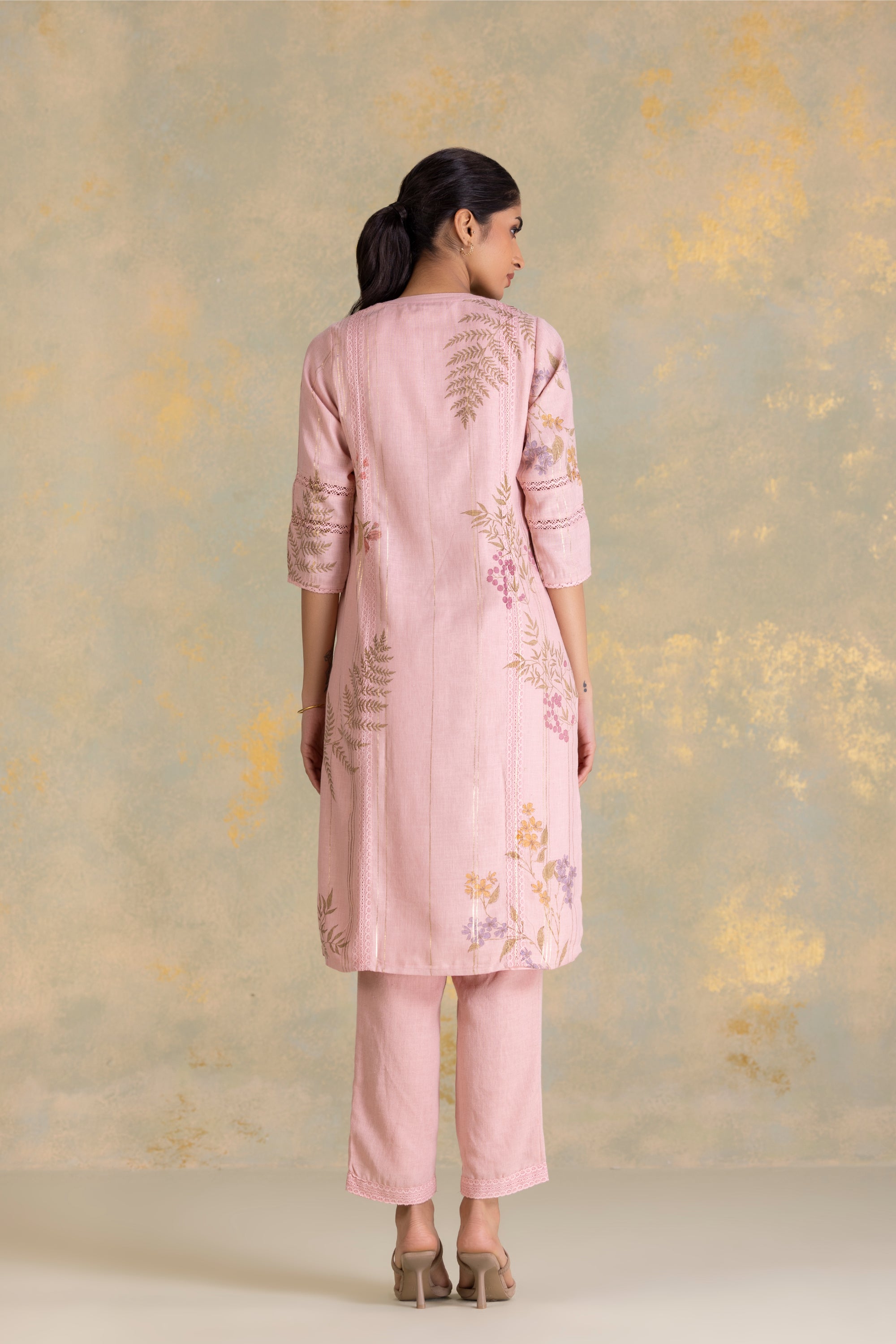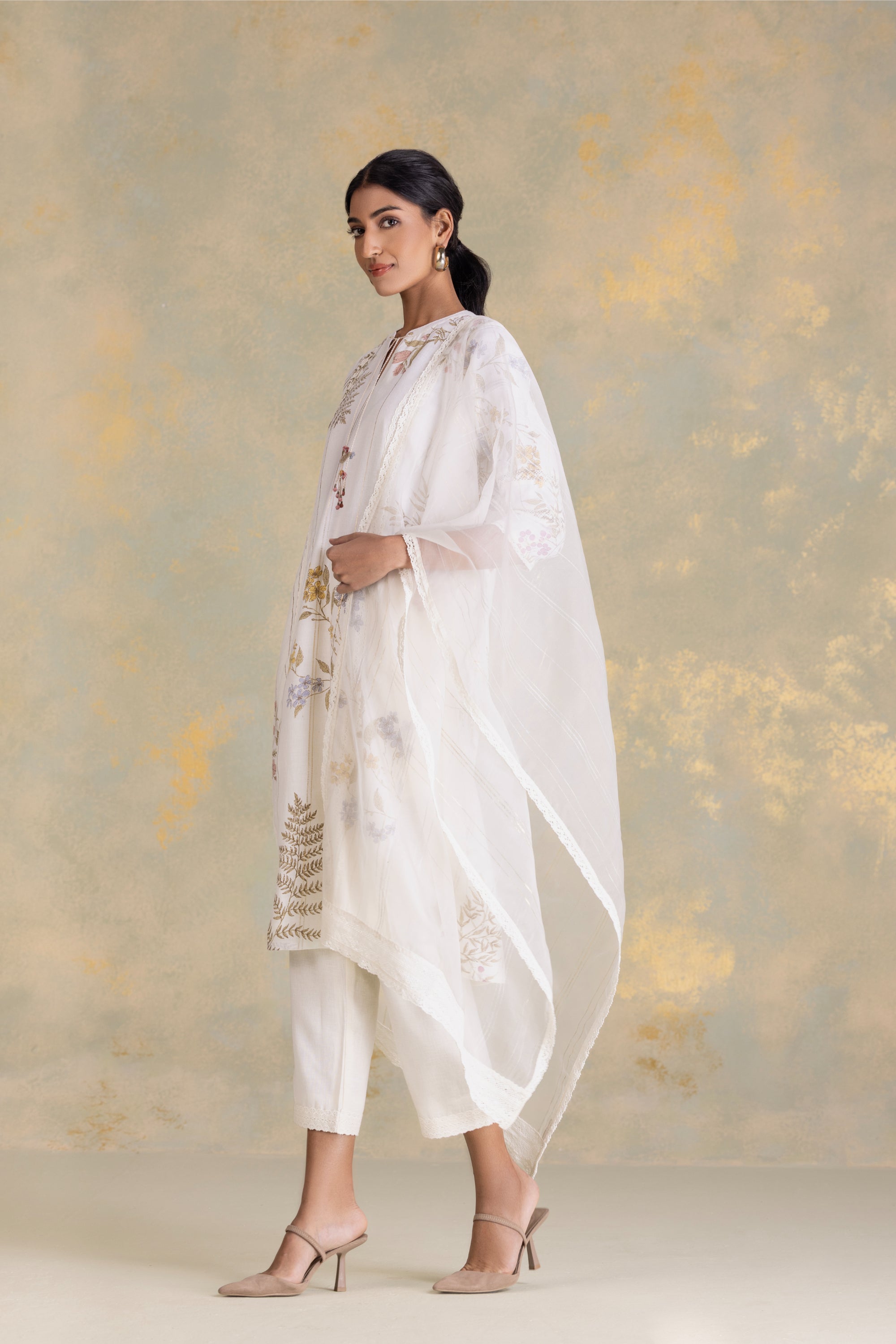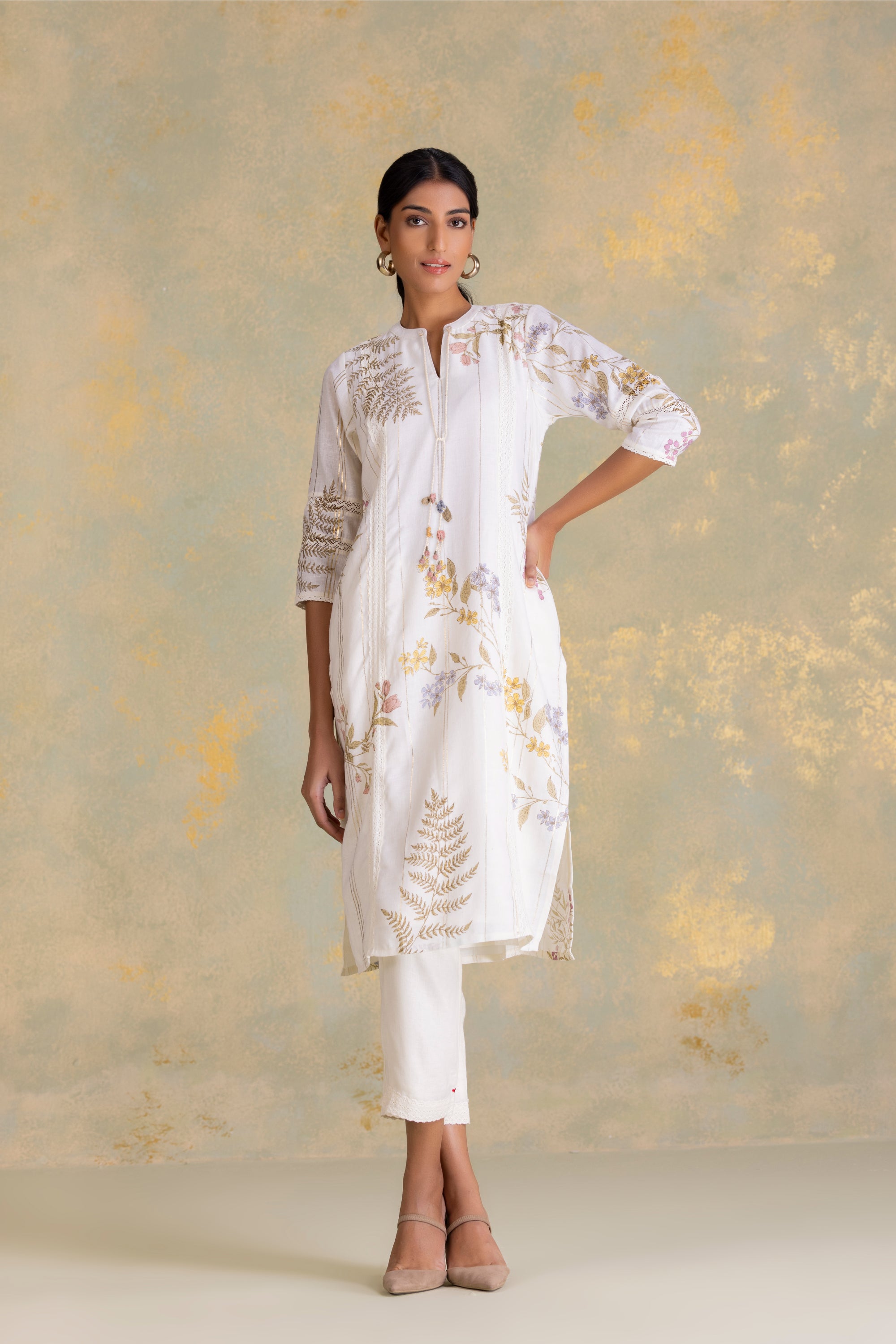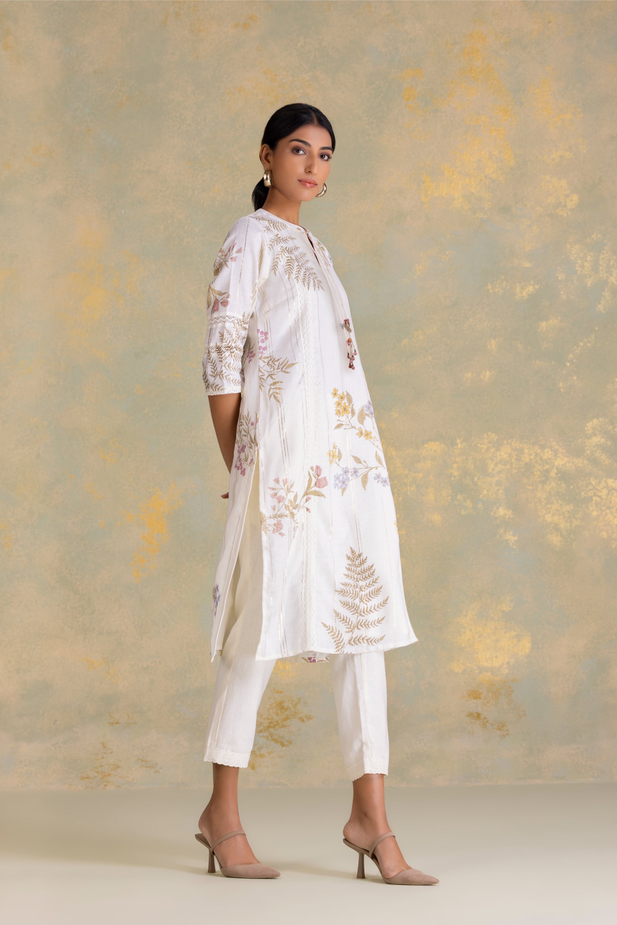 BOTANIQUE is a poetic ode to craftsmanship and nature’s quiet elegance. Each piece features delicate screen-printed florals that bloom across intricate laces, their beauty enhanced by subtle gold-foiled stripes that glimmer just behind the flowers, adding depth and a gentle radiance like sunlight filtering through foliage. The interplay of lace, print, and metallic sheen brings a sense of layered artistry and refined texture. Offered in hues of off white, natural, and blush, the collection embodies an effortless softness, a modern botanical romance woven with artisanal care and timeless femininity.