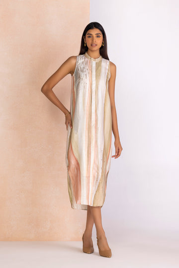 • The Roots Dress is crafted in a sleeveless silhouette with a neat round-neck collar, designed for effortless wear. A curved hemline and side slits add movement and ease, giving the dress a refined yet relaxed shape. Subtle gold stud work enhances the surface with a gentle shimmer, highlighting the clean lines of the design.