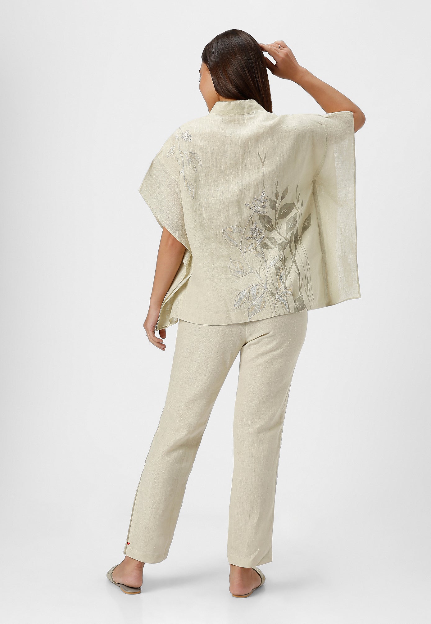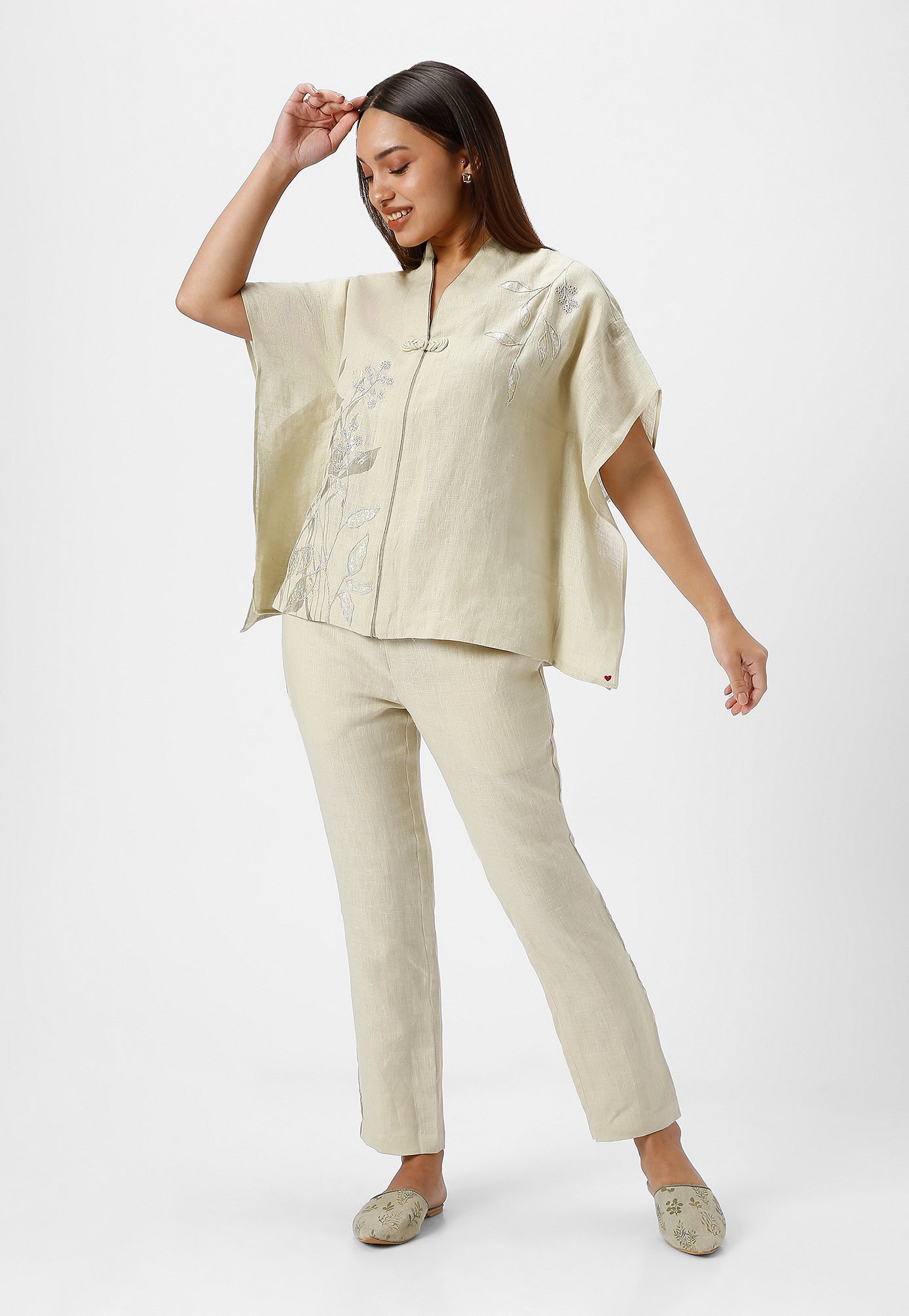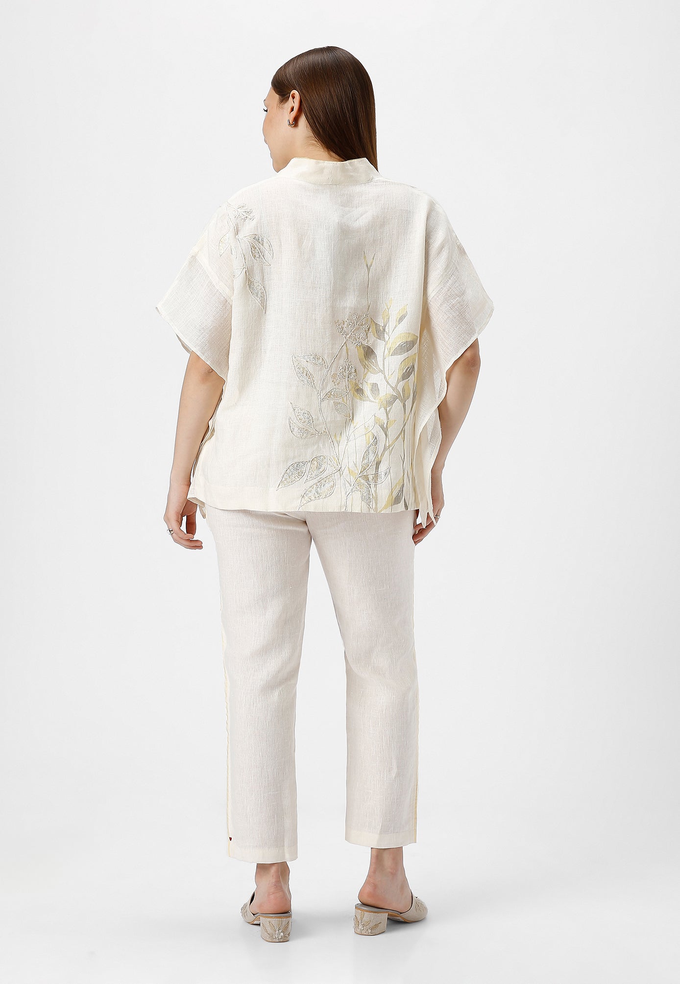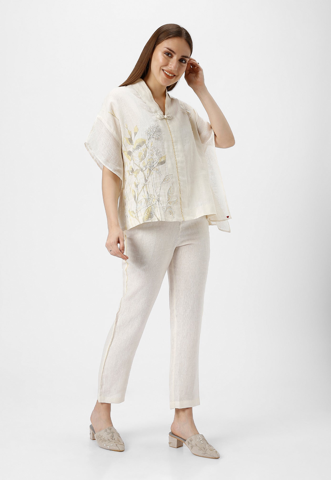 Inspired by the woody, ringed culms of the perennial bamboo, this magnificent range dons the intriguing shadows of these stems overlapping one another by virtue of a three-screen printing technique that is akin to beautiful water colours on fabric. Further elevating the design are intricately hand-embroidered leaves using anchor thread embroidery; stroked with light and dull shades of gold- adding a touch of shimmer with depth while embossing the beauty of the bamboo to the surface on fine linen. This sparkling range also makes for the perfect attire to work on special occasions. Available in stunning shades of off-white, macroon and green tea.