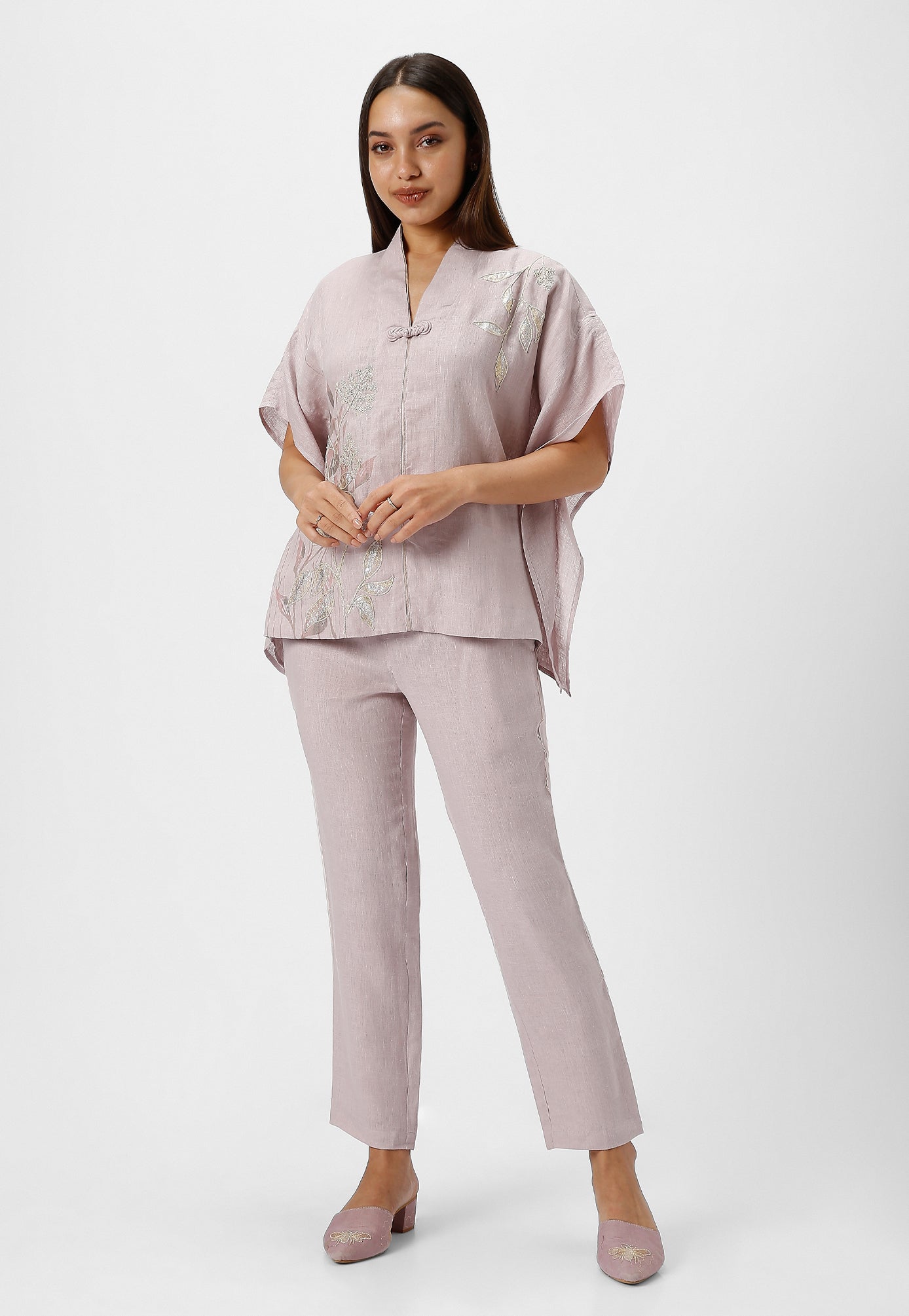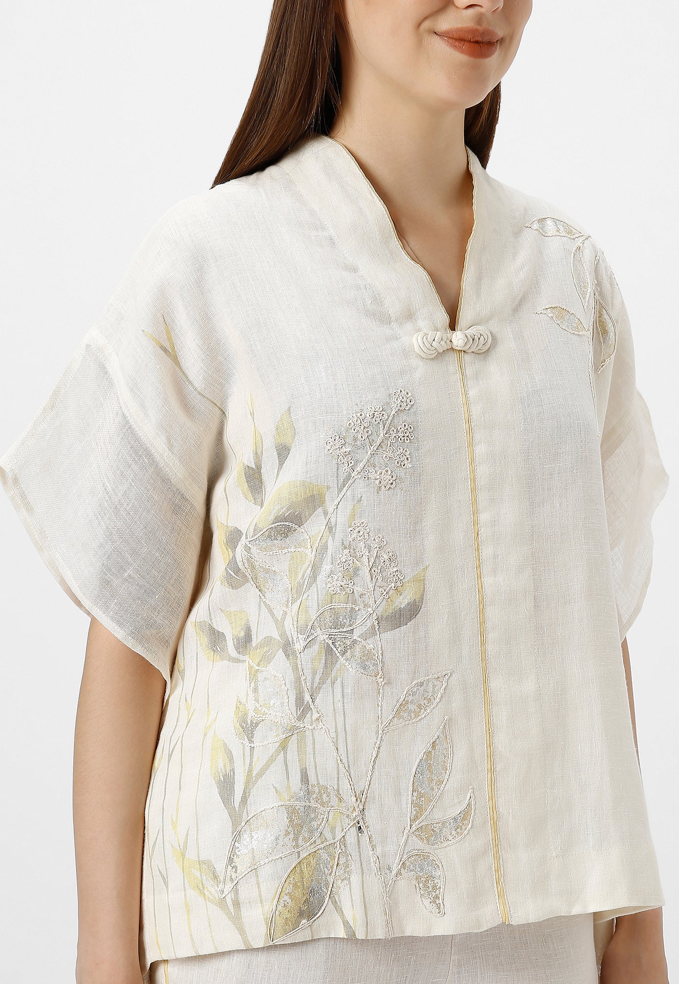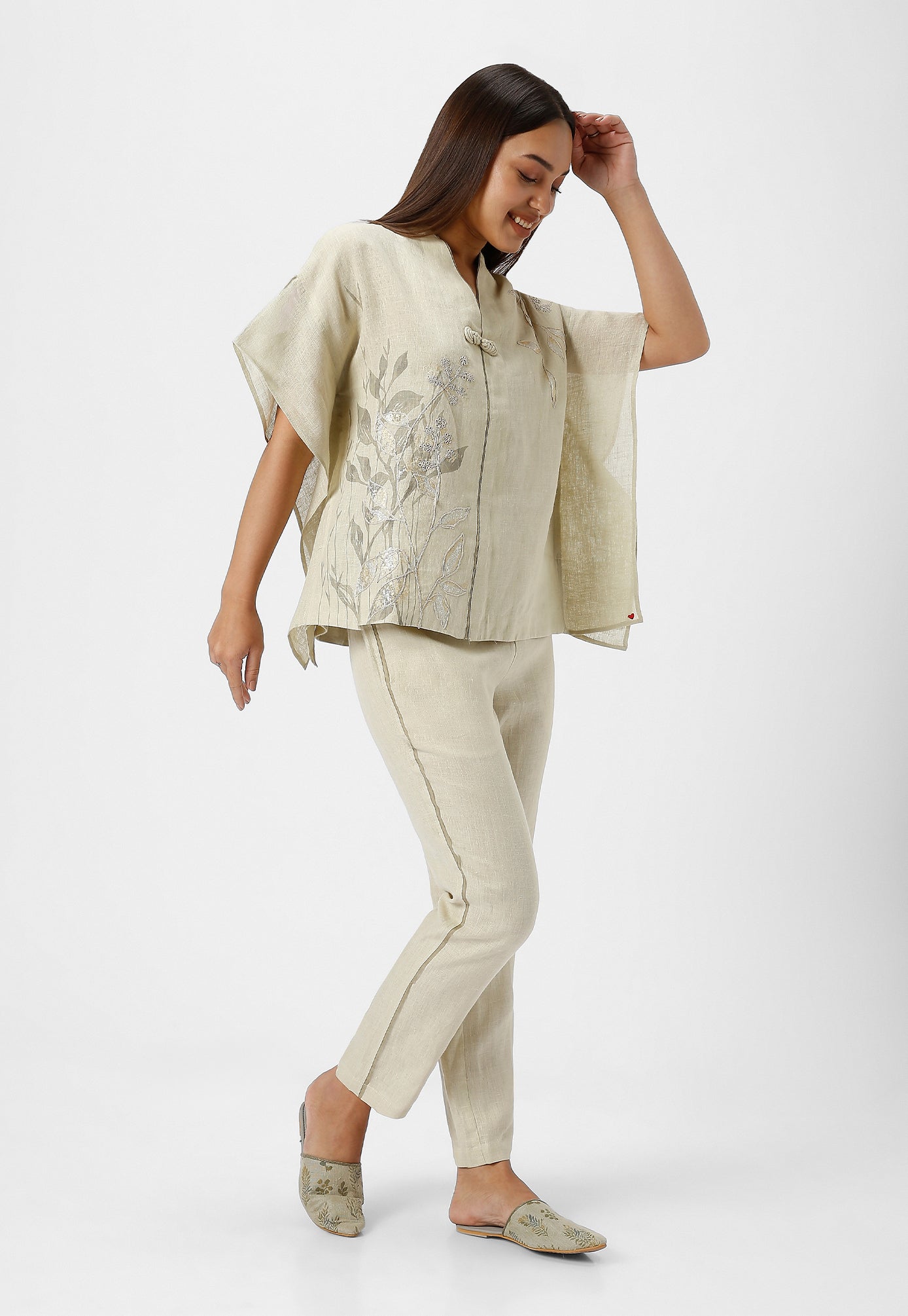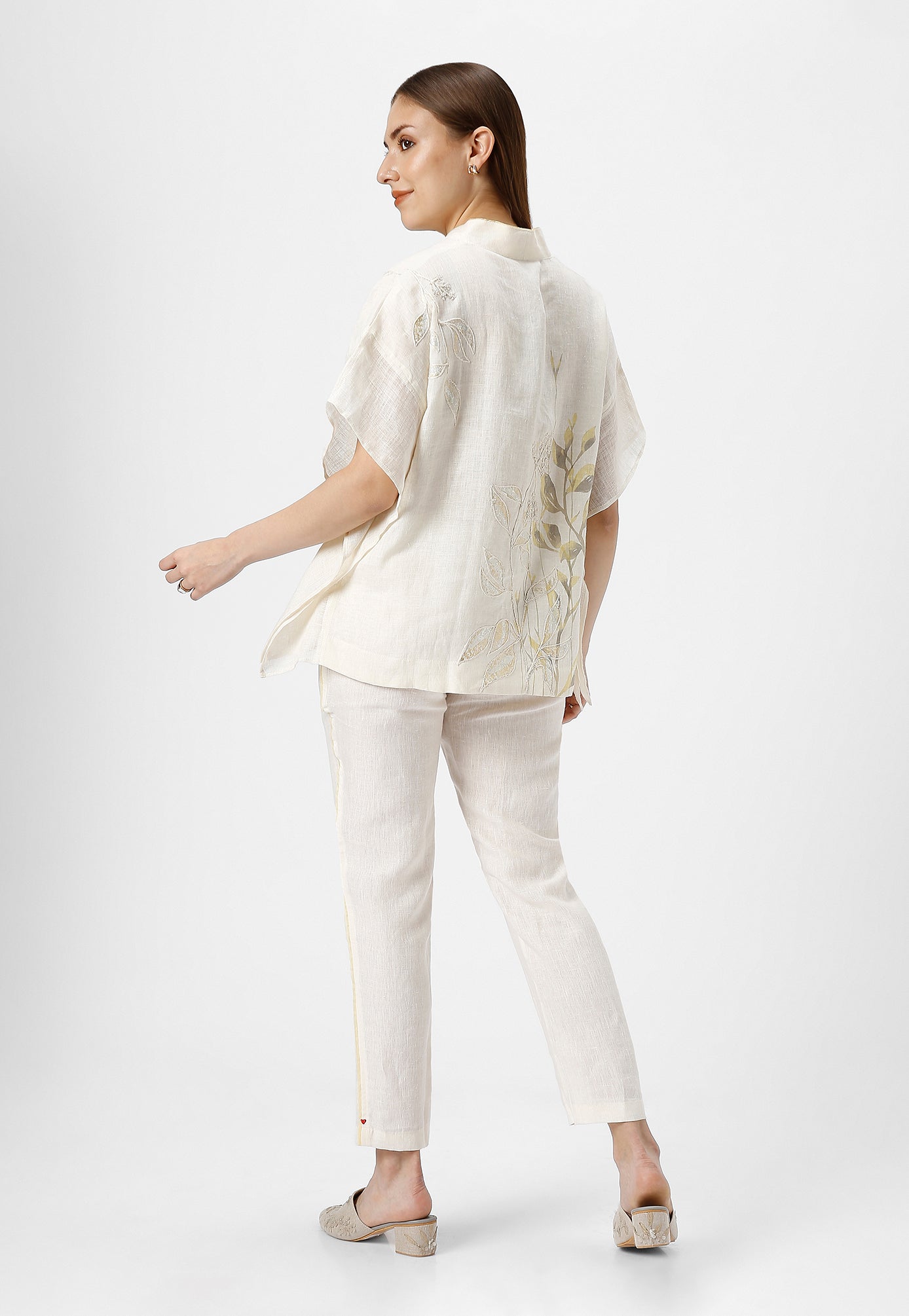 Inspired by the woody, ringed culms of the perennial bamboo, this magnificent range dons the intriguing shadows of these stems overlapping one another by virtue of a three-screen printing technique that is akin to beautiful water colours on fabric. Further elevating the design are intricately hand-embroidered leaves using anchor thread embroidery; stroked with light and dull shades of gold- adding a touch of shimmer with depth while embossing the beauty of the bamboo to the surface on fine linen. This sparkling range also makes for the perfect attire to work on special occasions. Available in stunning shades of off-white, macroon and green tea.