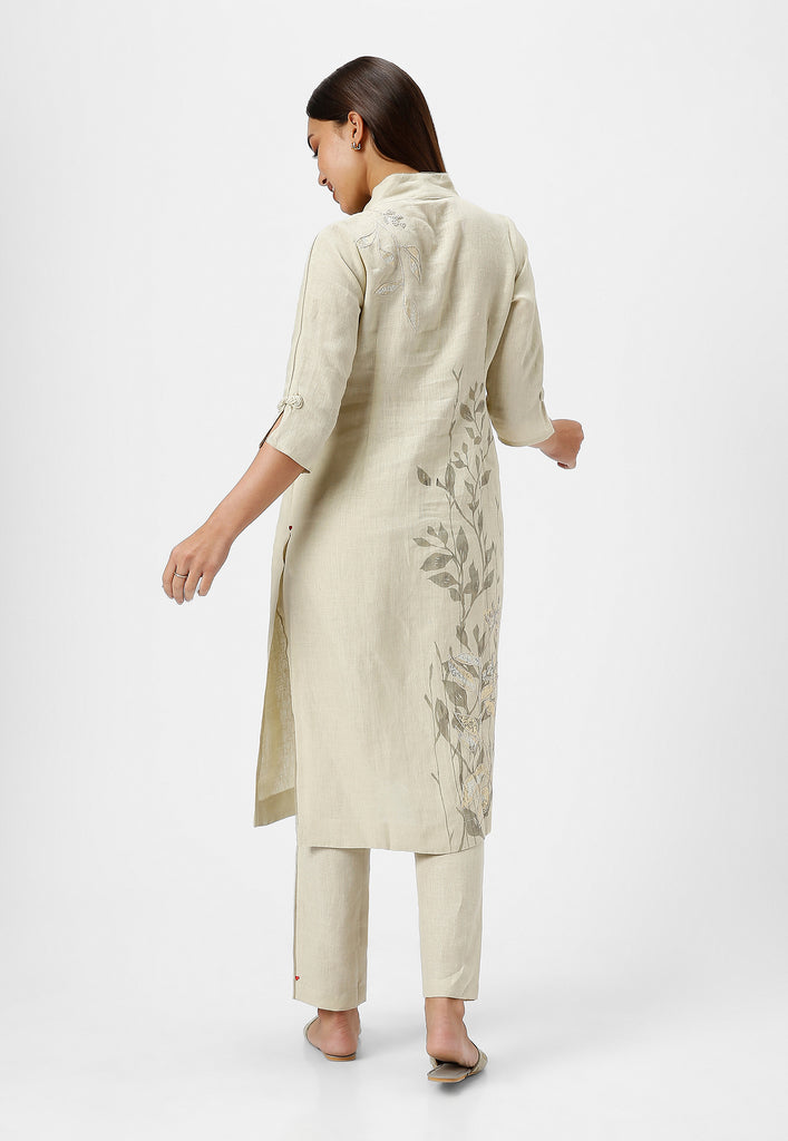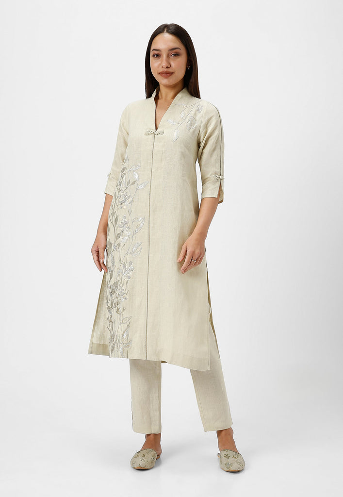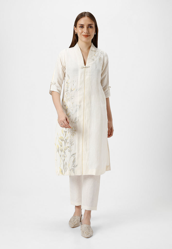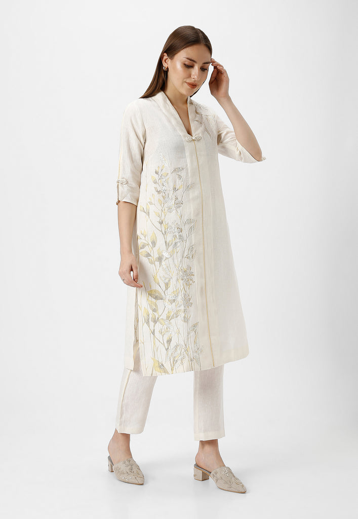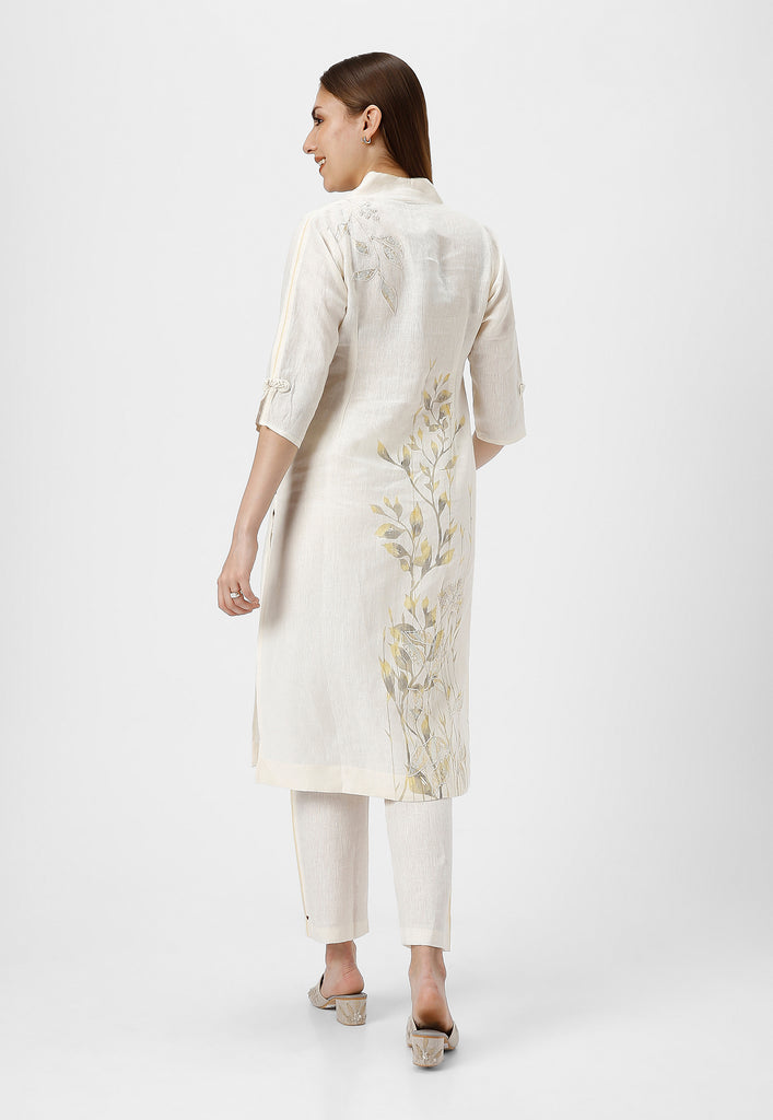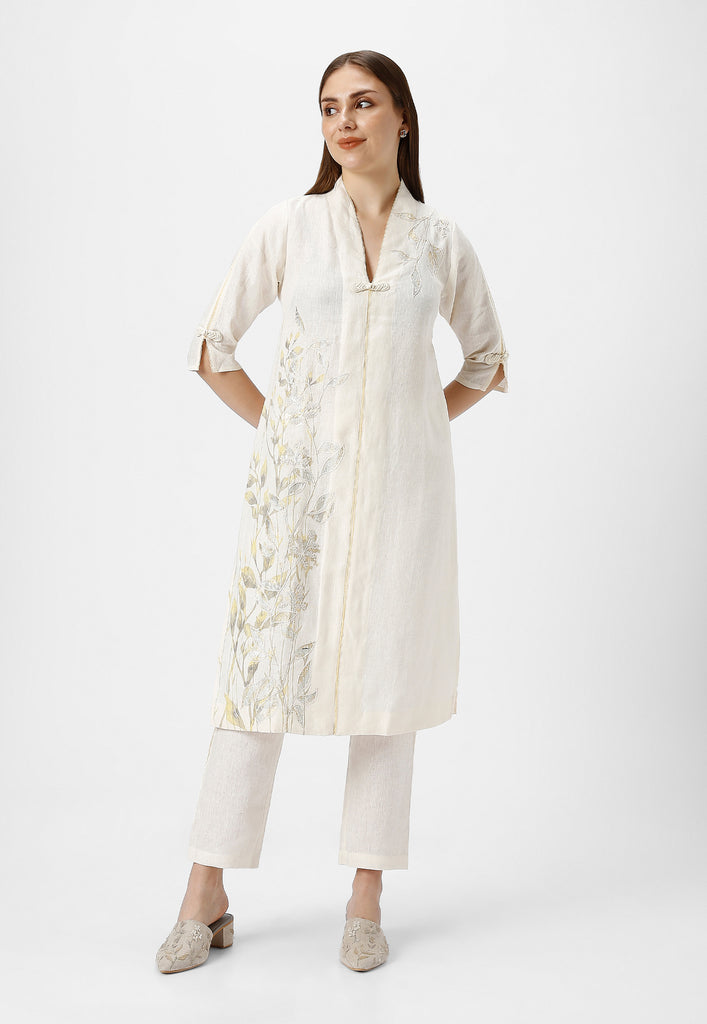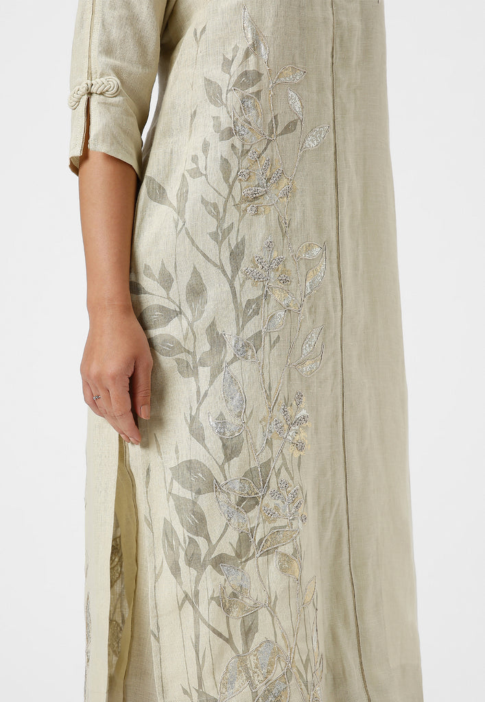 Inspired by the woody, ringed culms of the perennial bamboo, this magnificent range dons the intriguing shadows of these stems overlapping one another by virtue of a three-screen printing technique that is akin to beautiful water colours on fabric. Further elevating the design are intricately hand-embroidered leaves using anchor thread embroidery; stroked with light and dull shades of gold- adding a touch of shimmer with depth while embossing the beauty of the bamboo to the surface on fine linen. This sparkling range also makes for the perfect attire to work on special occasions. Available in stunning shades of off-white, macroon and green tea.