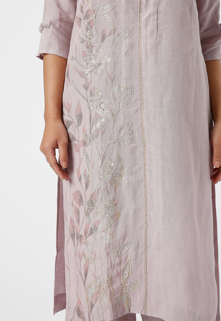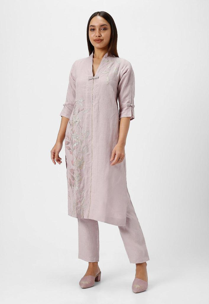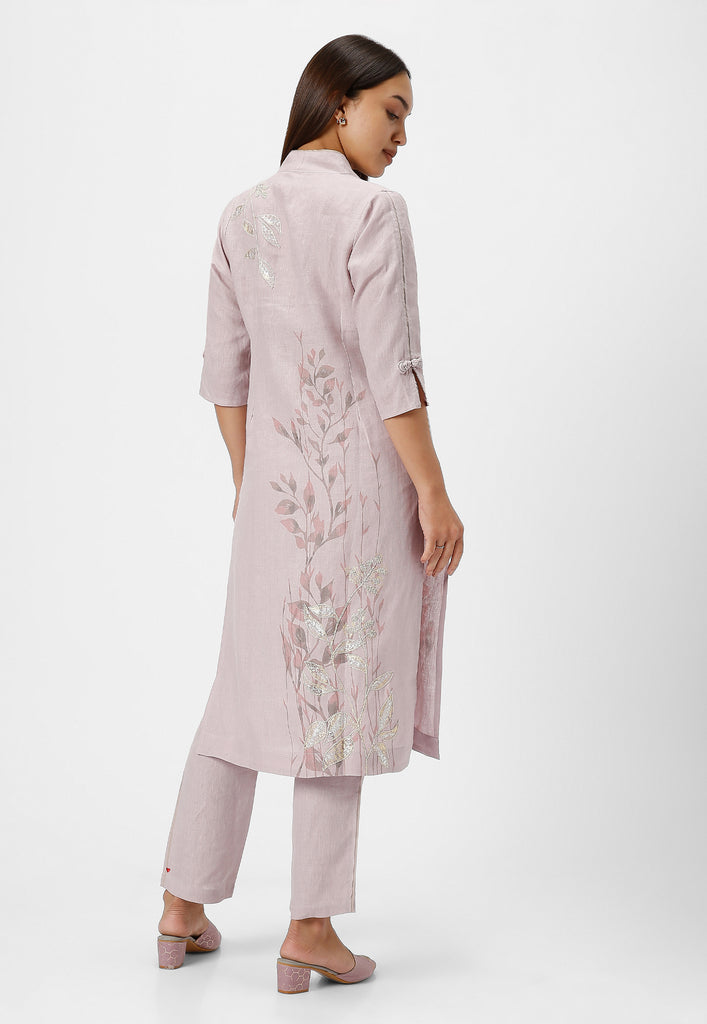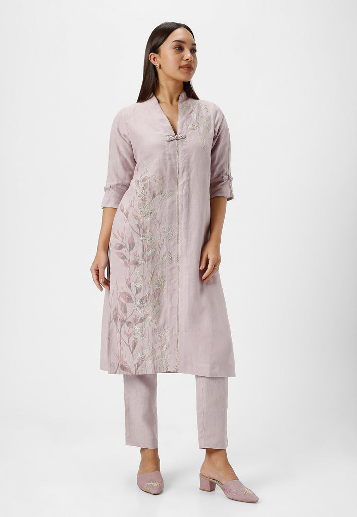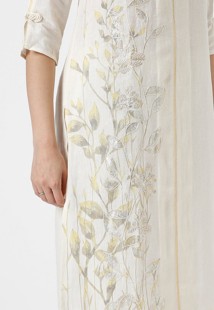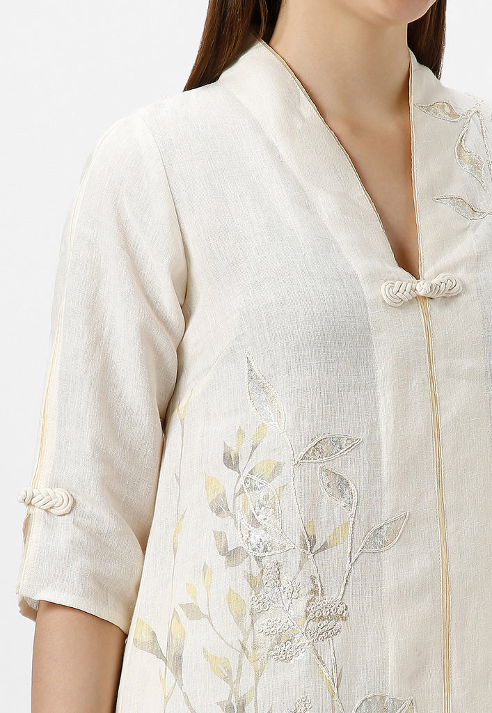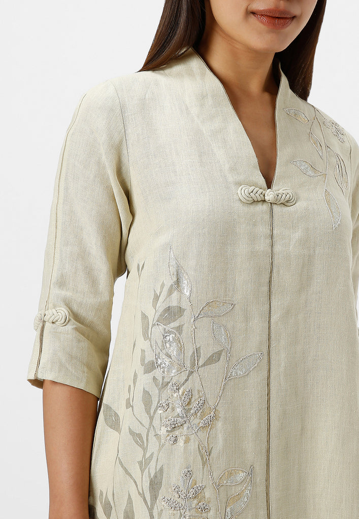 Inspired by the woody, ringed culms of the perennial bamboo, this magnificent range dons the intriguing shadows of these stems overlapping one another by virtue of a three-screen printing technique that is akin to beautiful water colours on fabric. Further elevating the design are intricately hand-embroidered leaves using anchor thread embroidery; stroked with light and dull shades of gold- adding a touch of shimmer with depth while embossing the beauty of the bamboo to the surface on fine linen. This sparkling range also makes for the perfect attire to work on special occasions. Available in stunning shades of off-white, macroon and green tea.
