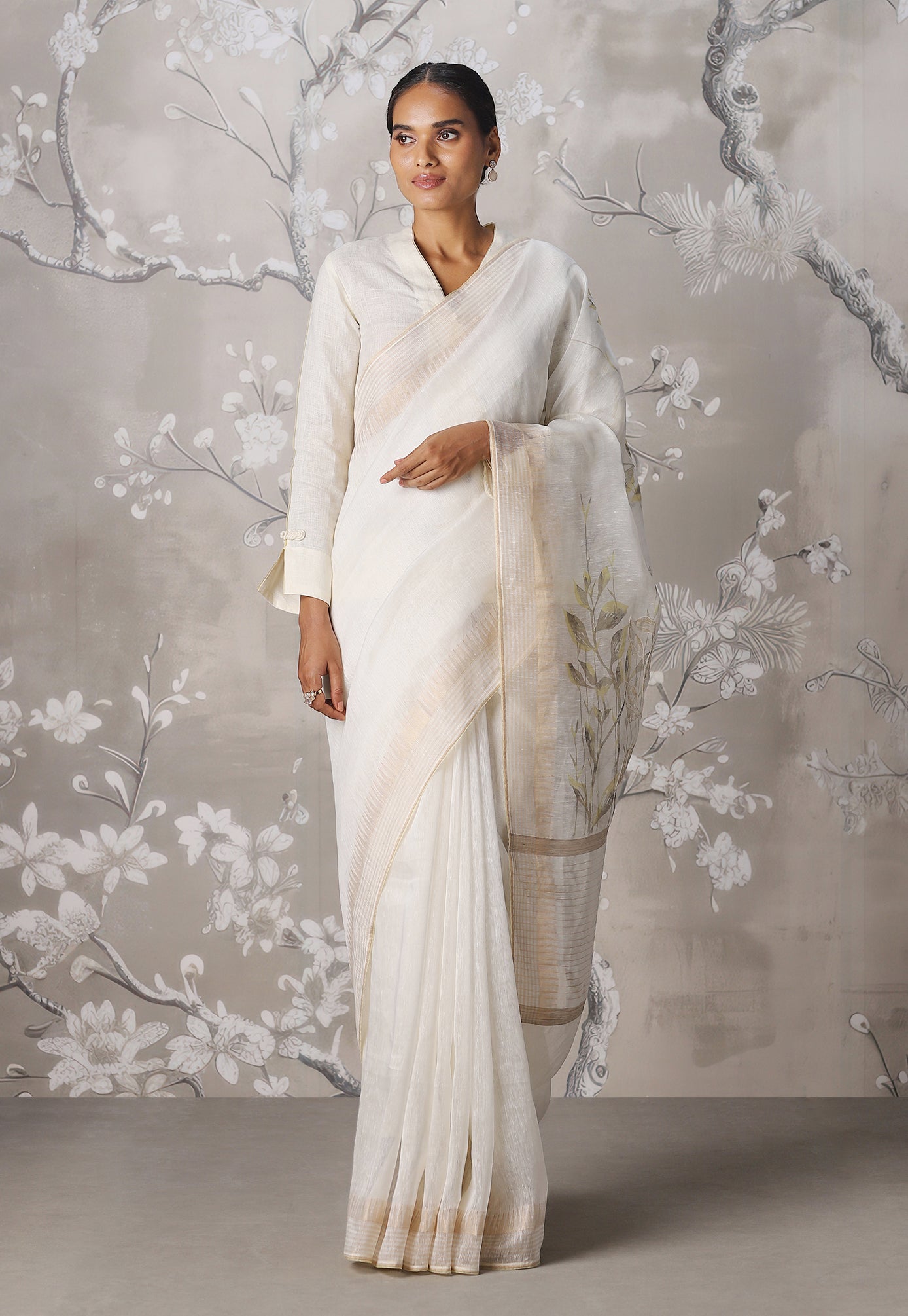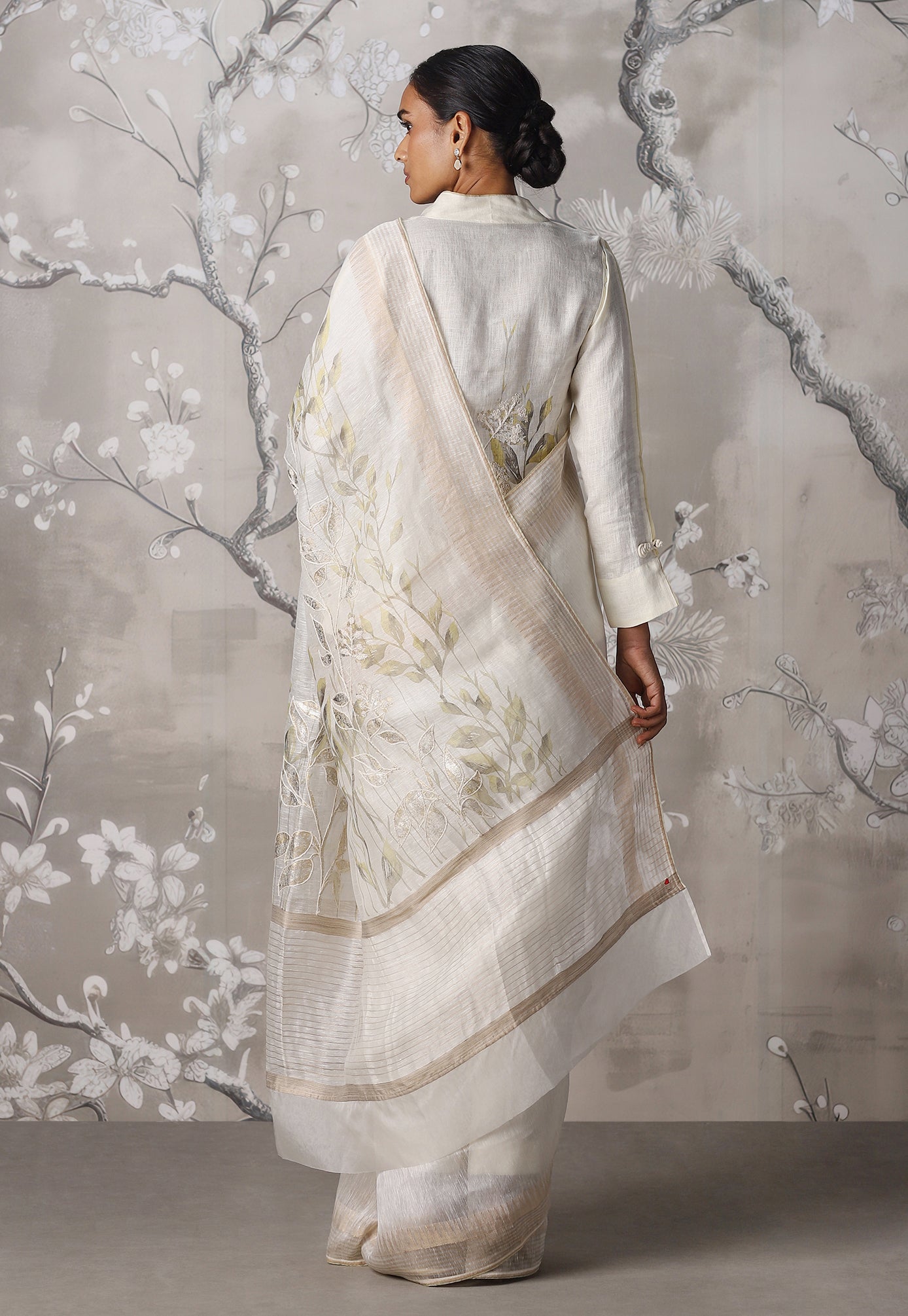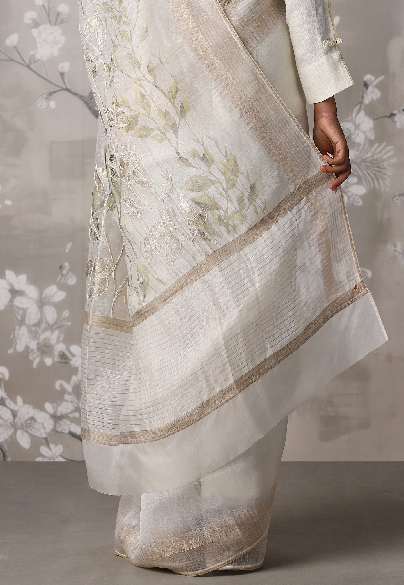 Inspired by the woody, ringed culms of the perennial bamboo, this magnificent range that intriguing shadows of these stems overlapping one another by layers of screen - print that is akin to beautiful water colours on fabric. Further elevating the design are intricately hand-embroidered leaves using anchor thread embroidery; stroked with light and dull shades of gold- adding a touch of shimmer with depth while embossing the beauty of the bamboo to the surface on fine linen. This sparkling range also makes for the perfect attire to work on special occasions