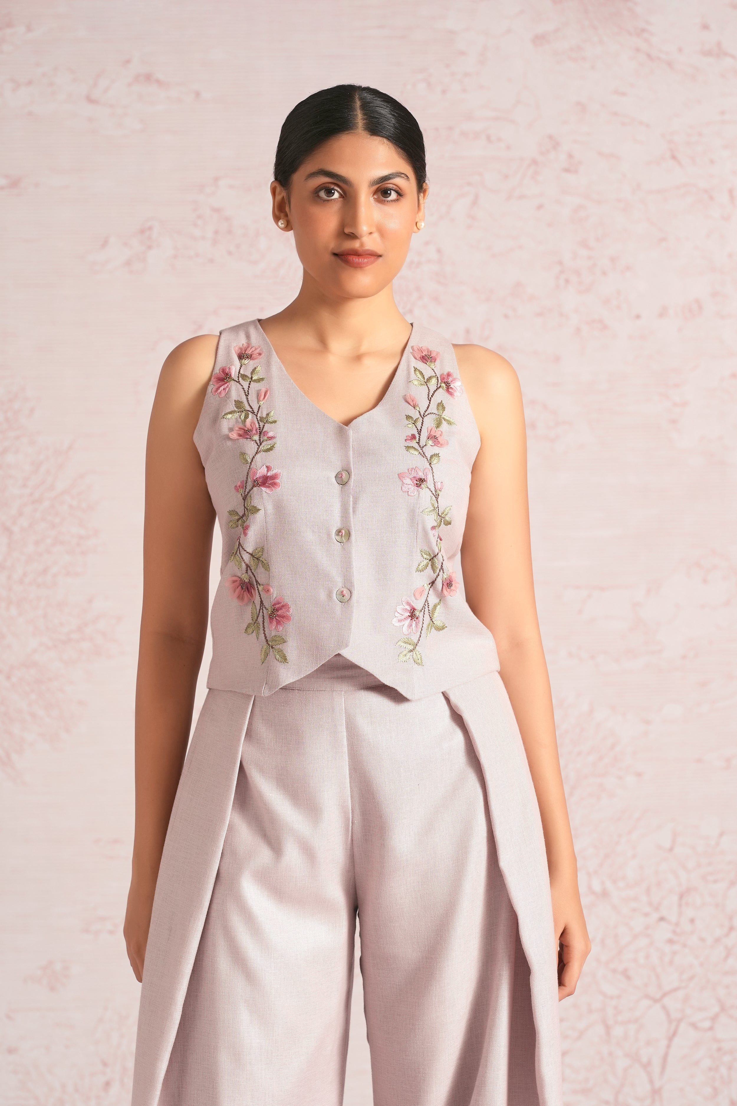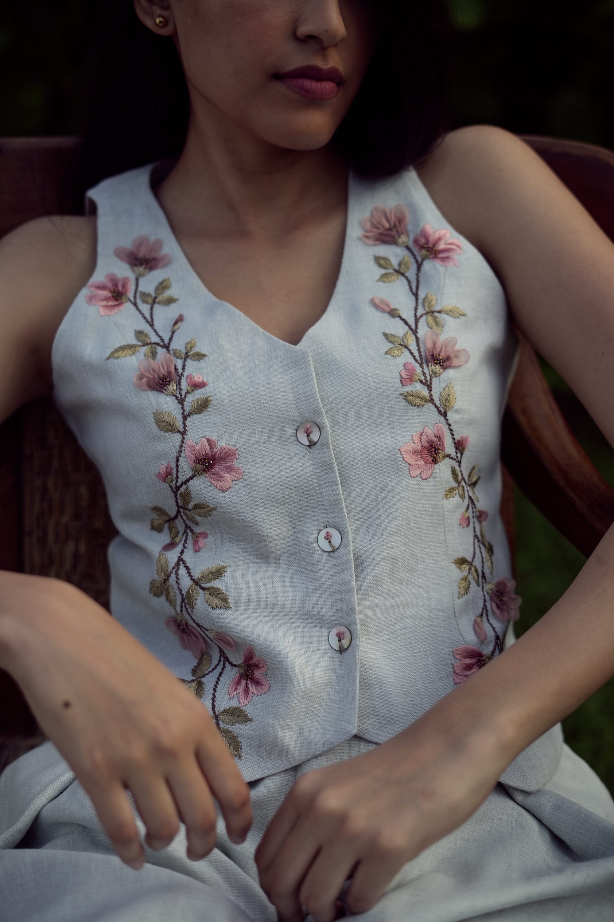 Blush Vines unfolds as a quiet ode to spring, where graceful vines wander delicately across each garment, creating a sense of natural movement and understated elegance. Soft, watercolor-washed florals lend the collection a painterly lightness, as though brushed gently onto fabric, enhancing its refined and airy character. Presented in serene hues of Bonny Green and Mauve, the palette evokes freshness, calm, and subtle romance. Feminine silhouettes such as peplum tops, tree tops, and a timeless waistcoat bring structure to the fluid compositions, striking a beautiful balance between softness and form. Light, elegant, and thoughtfully detailed, Blush Vines is designed for the spring–summer season — an effortless expression of grace, charm, and modern femininity.