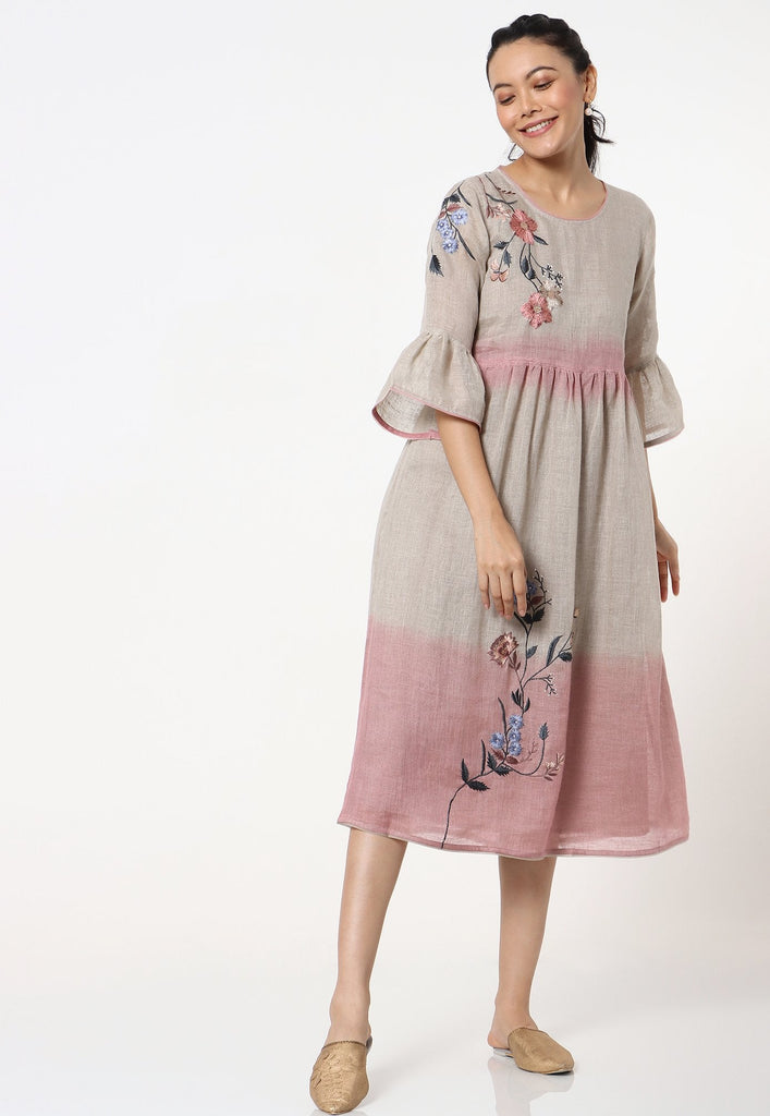 The romance of old-world old-school classic "Amanda" dress, with a simple round neck and gathered waist. The beauty of the natural shade of linen is highlighted with a blush pink shading at the waist and hem of the dress and embroidered with our lovely Spring flowers traced in balletic trails across these garments in soft graceful colours that soothe and calm… follow the winding frondescence…