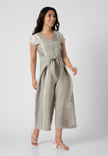 • Jumpsuit Length 51" / Model height 5'8''. • A Classic V- neck jumpsuit with extended sleeves and tie-up detail along the waist enhanced with one-inch linear printed facing detail on the inside along the hems and neckline. • Hand screen print inspired from the structure and timeless appeal of brick in linear motifs with touch of gold using heat pressed craft, meticulously printed each line brick by brick.