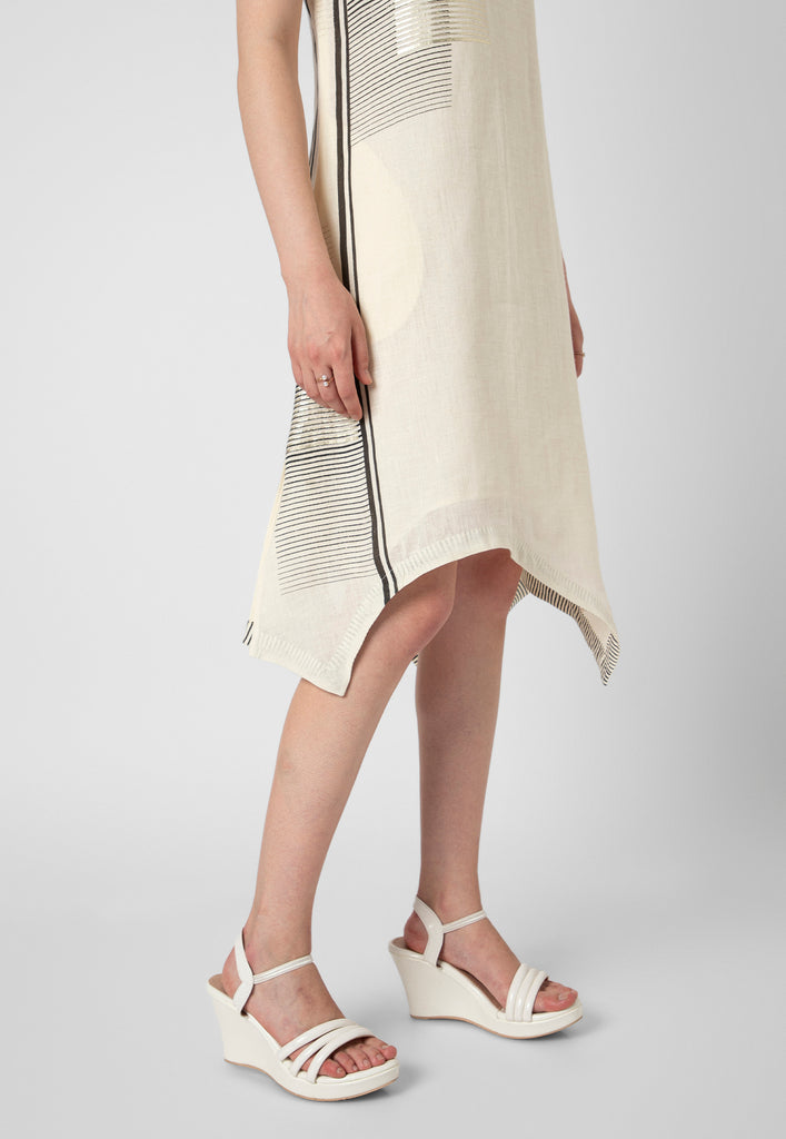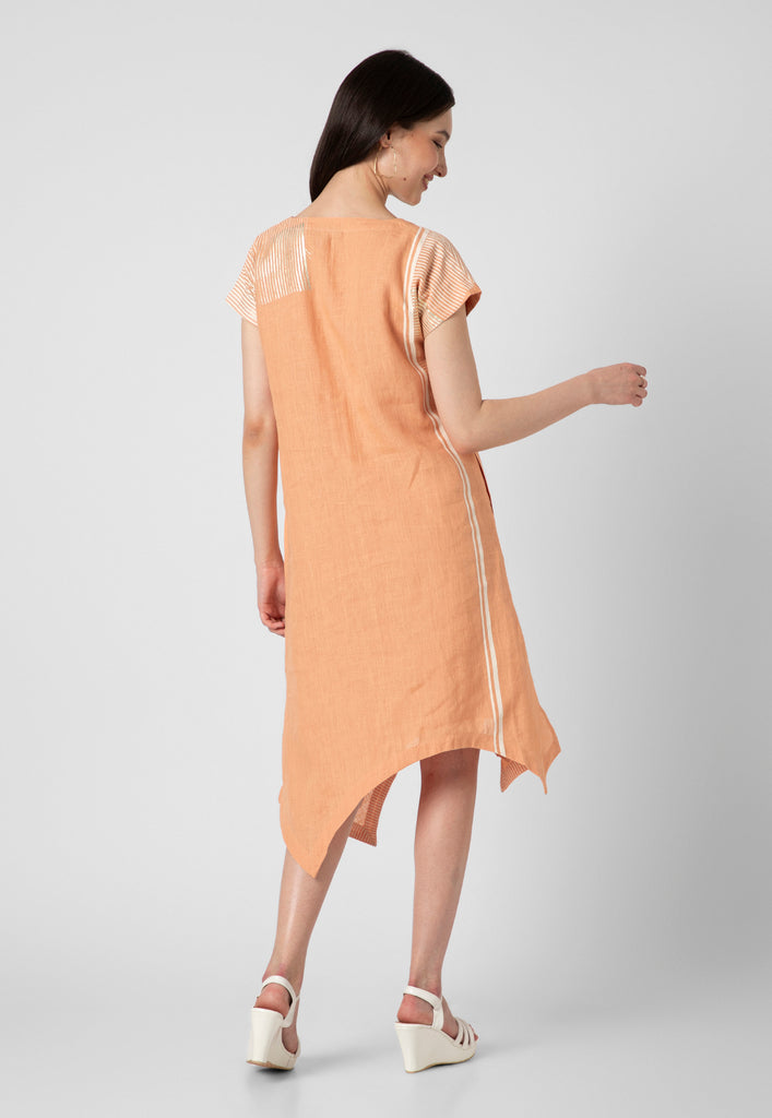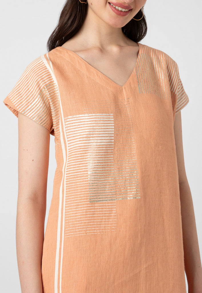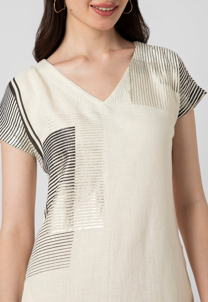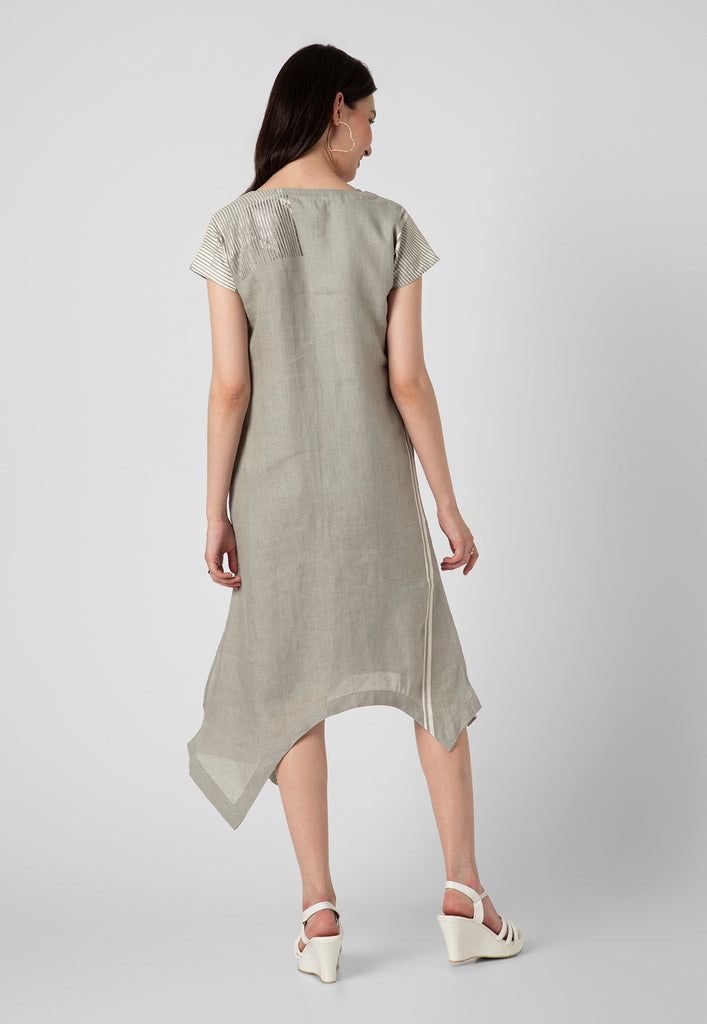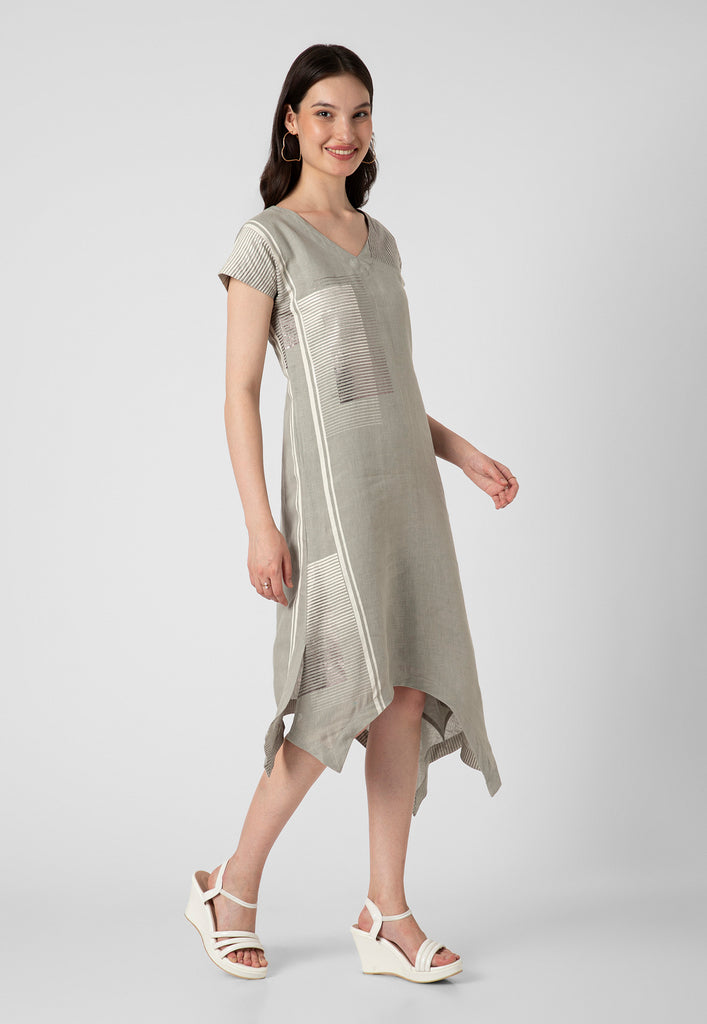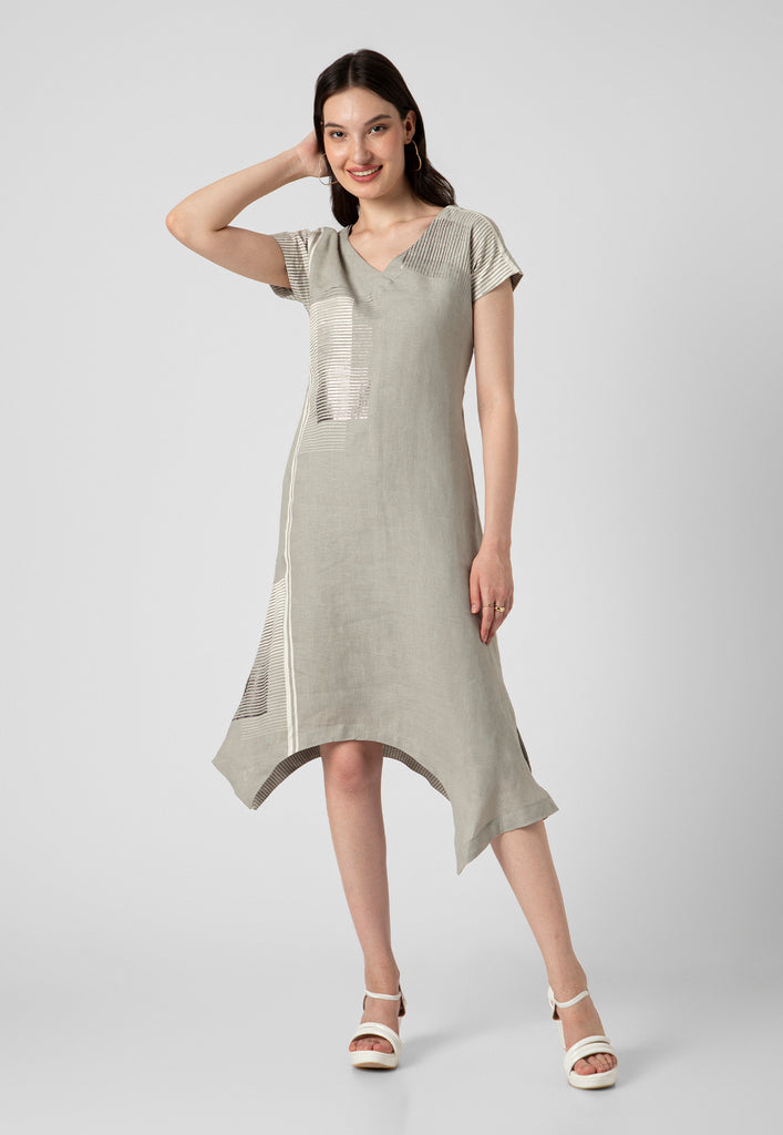 • Dress Length 40" / Model height 5'8" • Asymmetric fitted ‘V' neck dress with extended sleeves enhanced with one-inch linear printed facing detail on the inside along the hems and neckline.