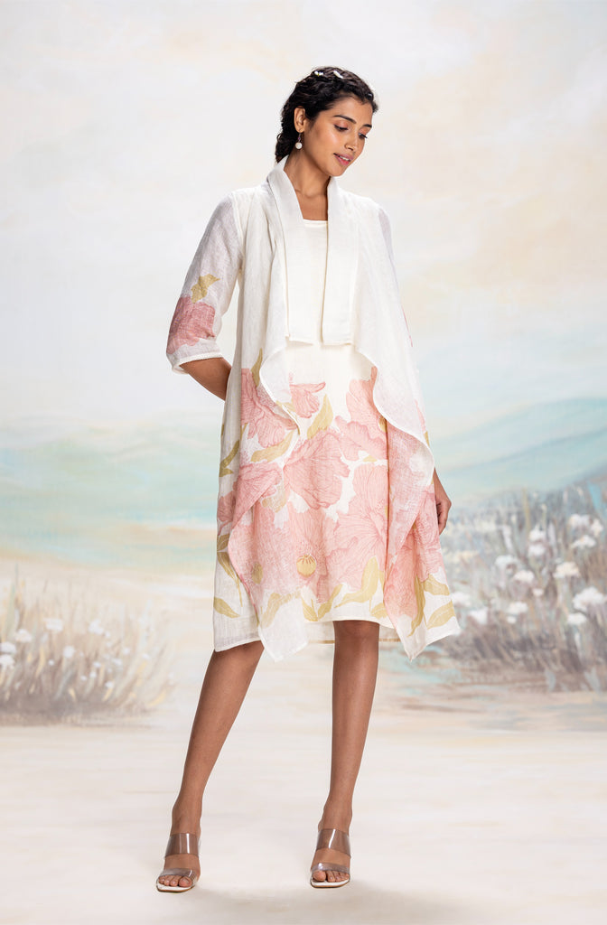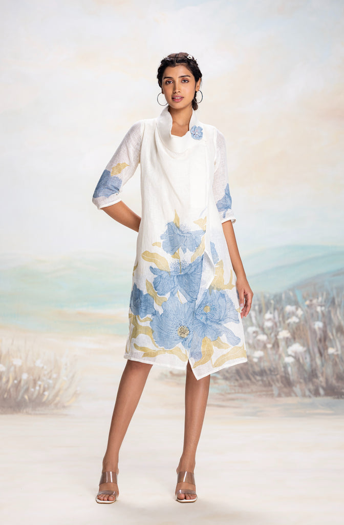 • Hand Screen printed with blobs of paint forming a artist elegance of abstract floral that flows all along the hem and sleeves, in the hues of blue and pink