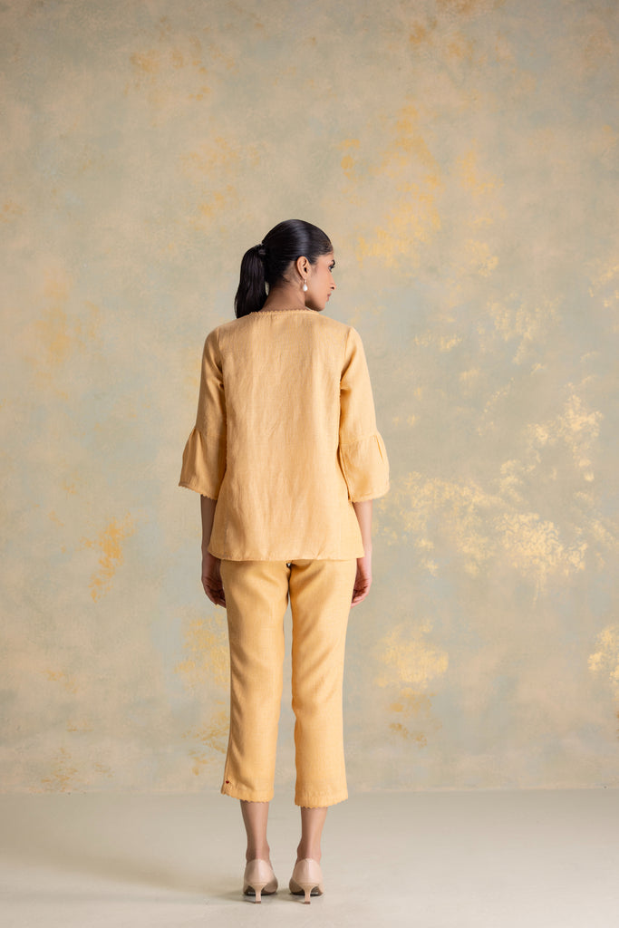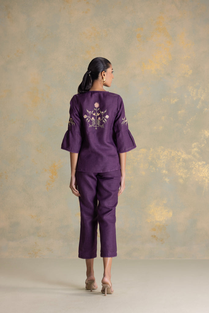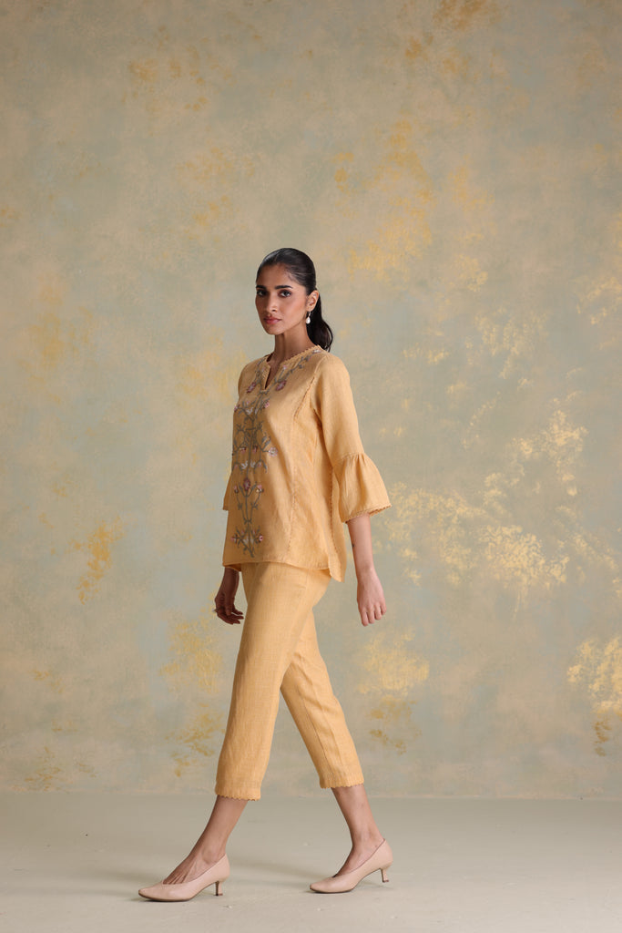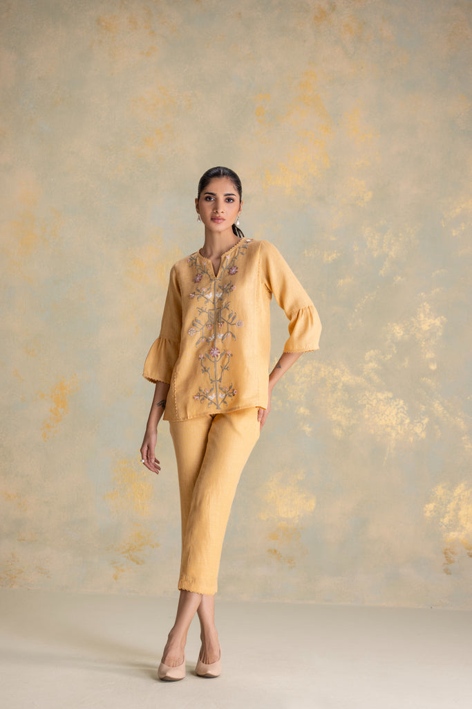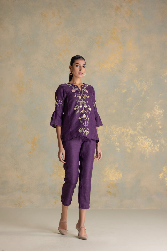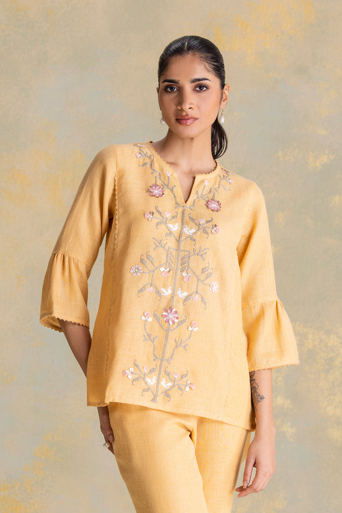 • Nirva top is a panel top with a keyhole round neckline and fit-and-flare sleeves, detailed with delicate lace inserts along the panels, sleeve hems, and neckline. The top is adorned with intricate cotton thread embroidery enhanced with 3D laser-cut flowers, extending through the center and above the sleeve joints for added depth and texture.
