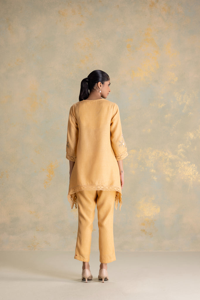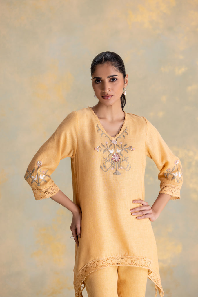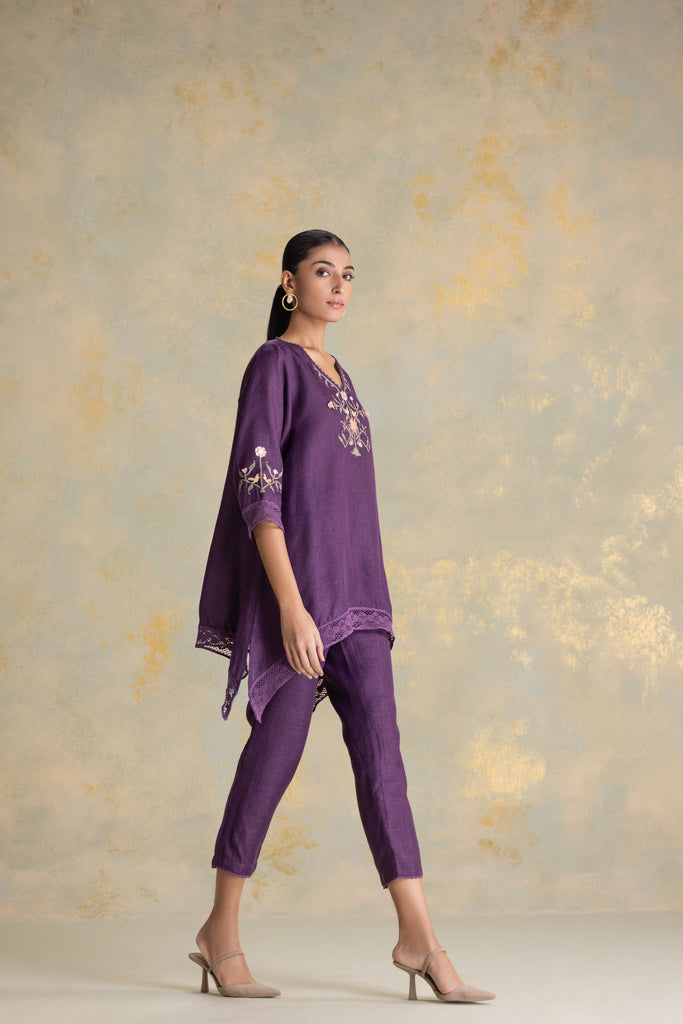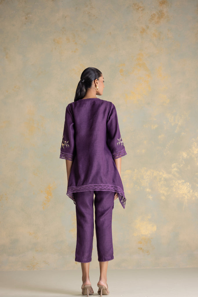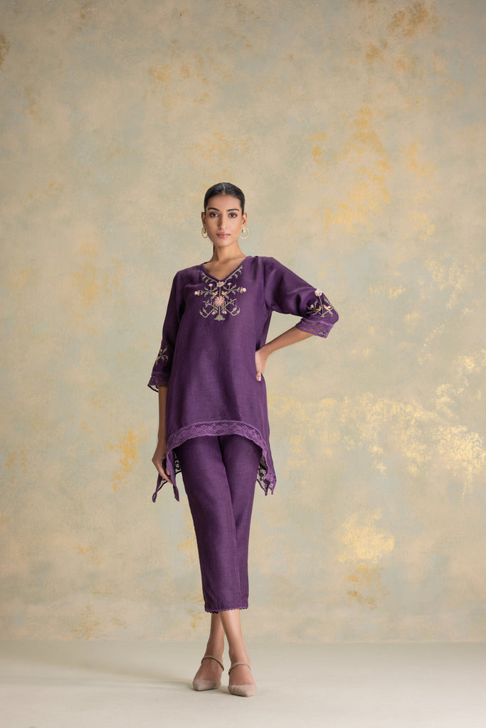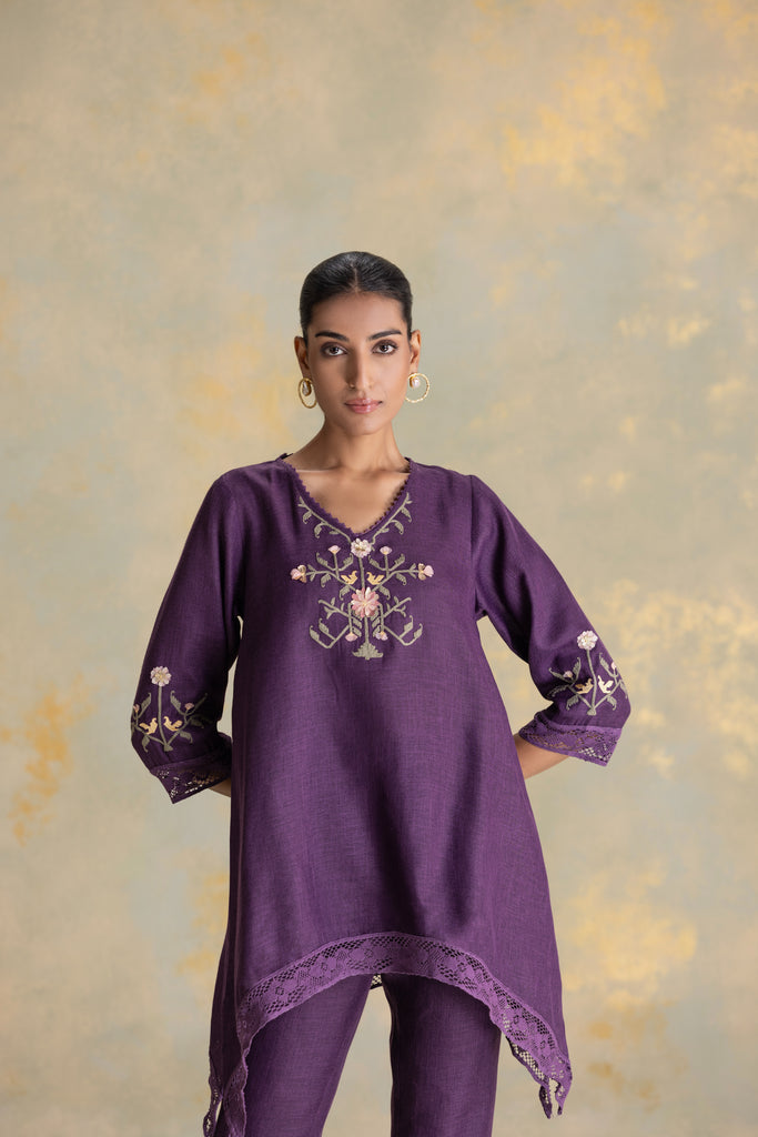 Candlelit Blooms is inspired by the gentle glow of candlelight warm, intimate, and timeless. The collection captures this quiet radiance through intricate anchor thread embroidery adorned with 3D laser-cut flowers and soft lace detailing that evoke the flicker of light across delicate textures. Here, candlelight kisses threads of gold and blooms, weaving a luminous charm into every detail. Presented in two colourways, aubergine and cashew, Candlelit Blooms embodies refined warmth, graceful silhouettes, and enduring elegance.