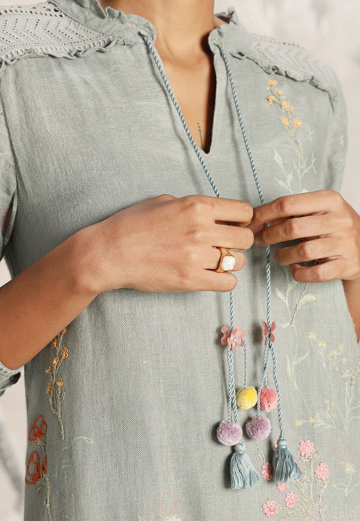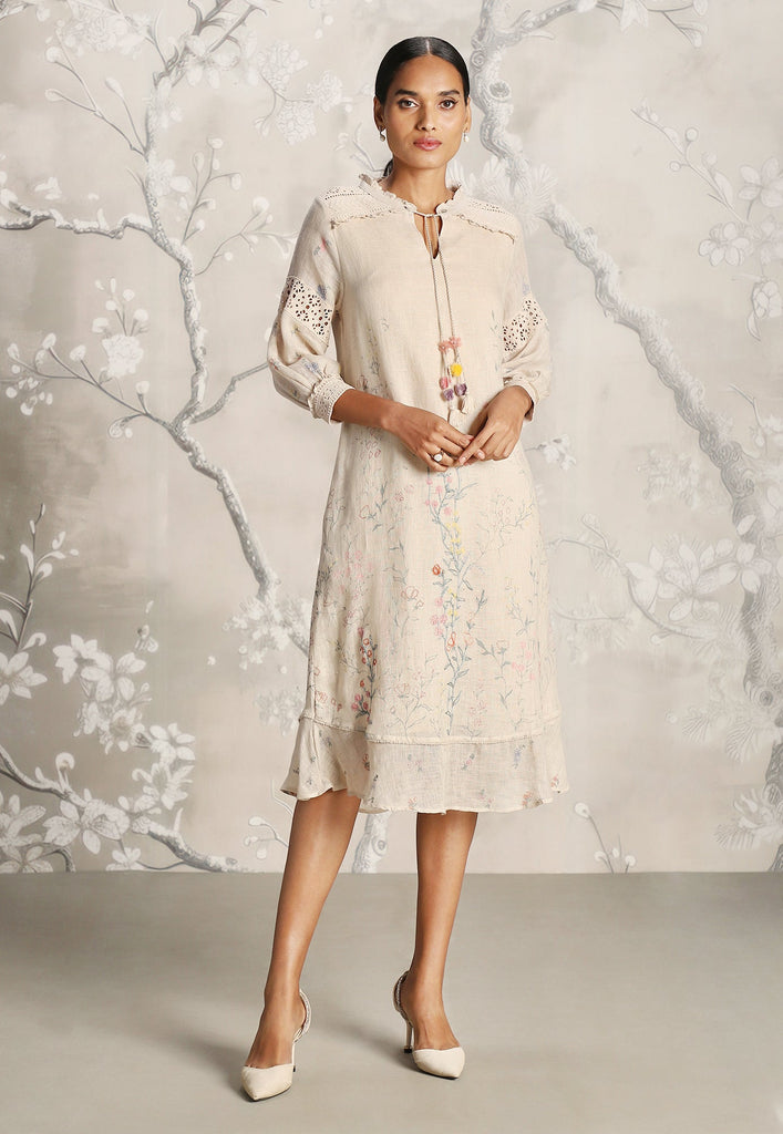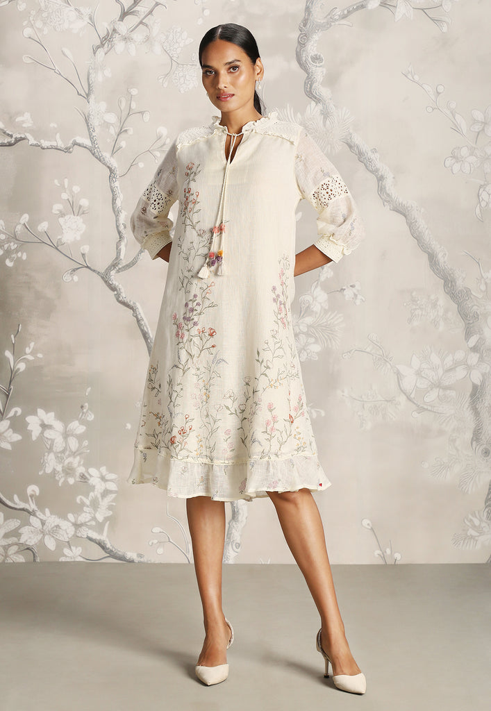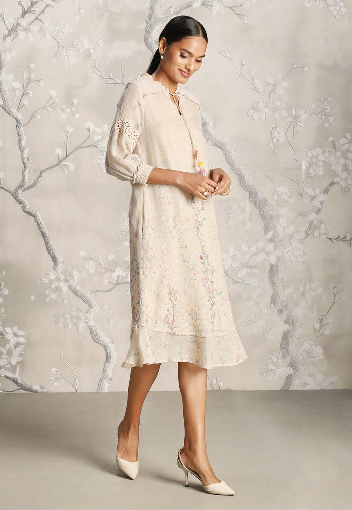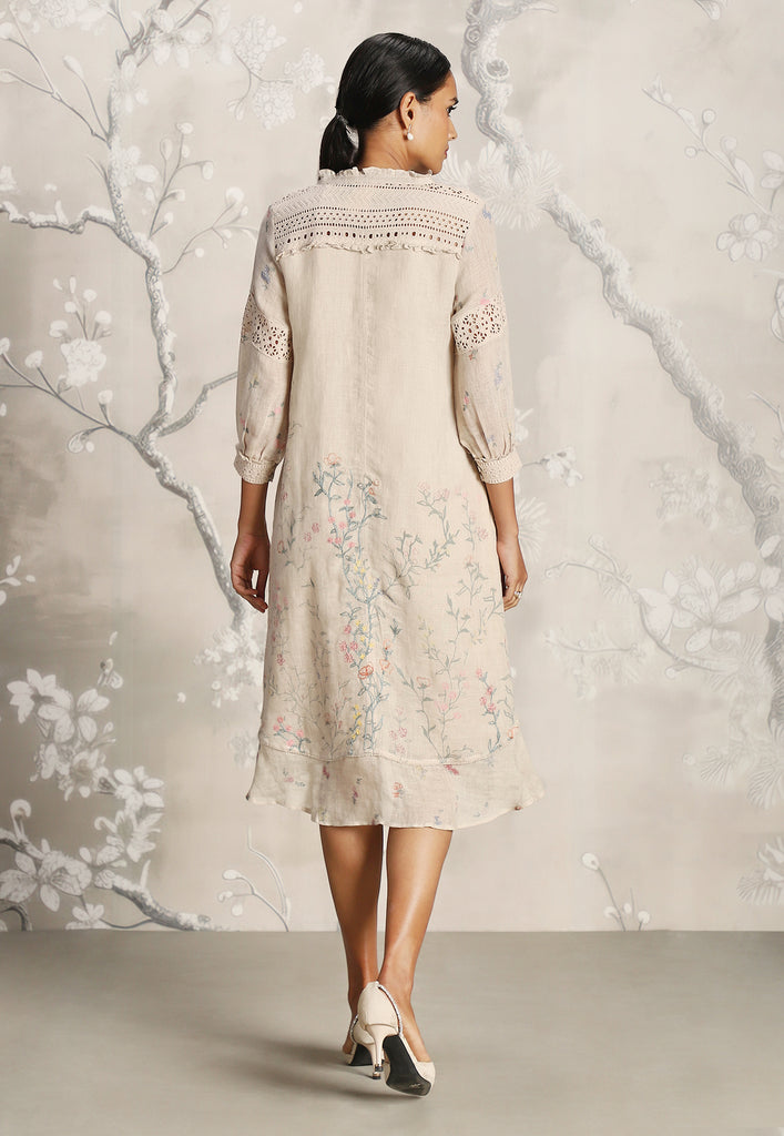 We venture into the forest on luxurious linen and between the denseness we witness exuberant blooms that are hand screen printed; accompanied by the sensuality of delicate Hakuba lace paired with harmonized embroidery to let you commune with mother nature in style.