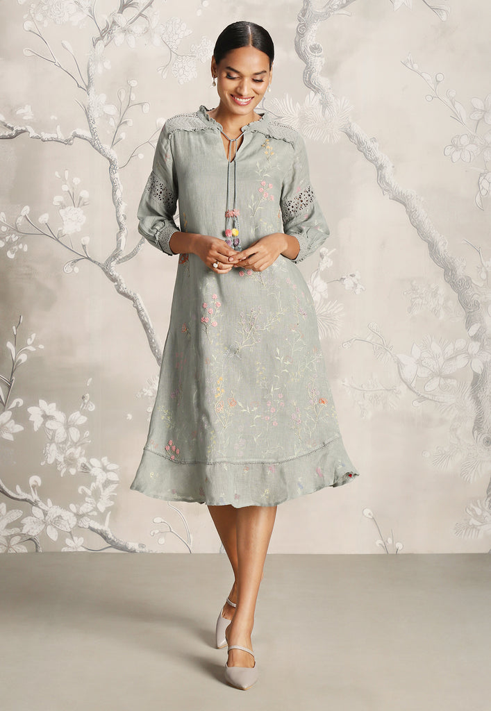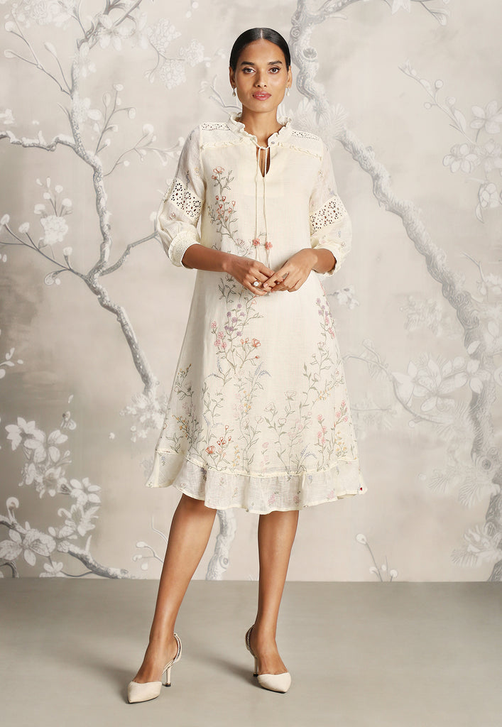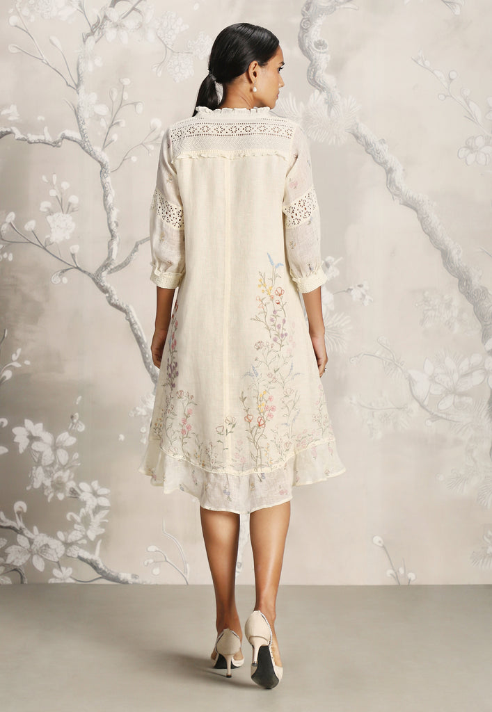 • A classic silhouette dress featuring delicate Hakuba lace overlay and mesmerizing screen prints adorned with beautiful embroidery.