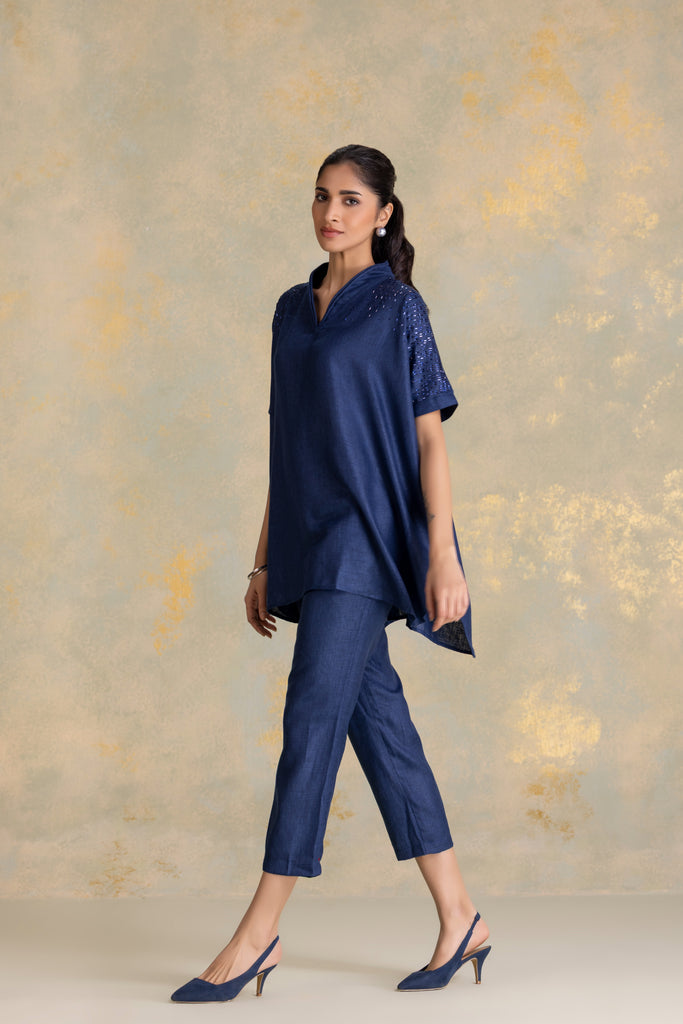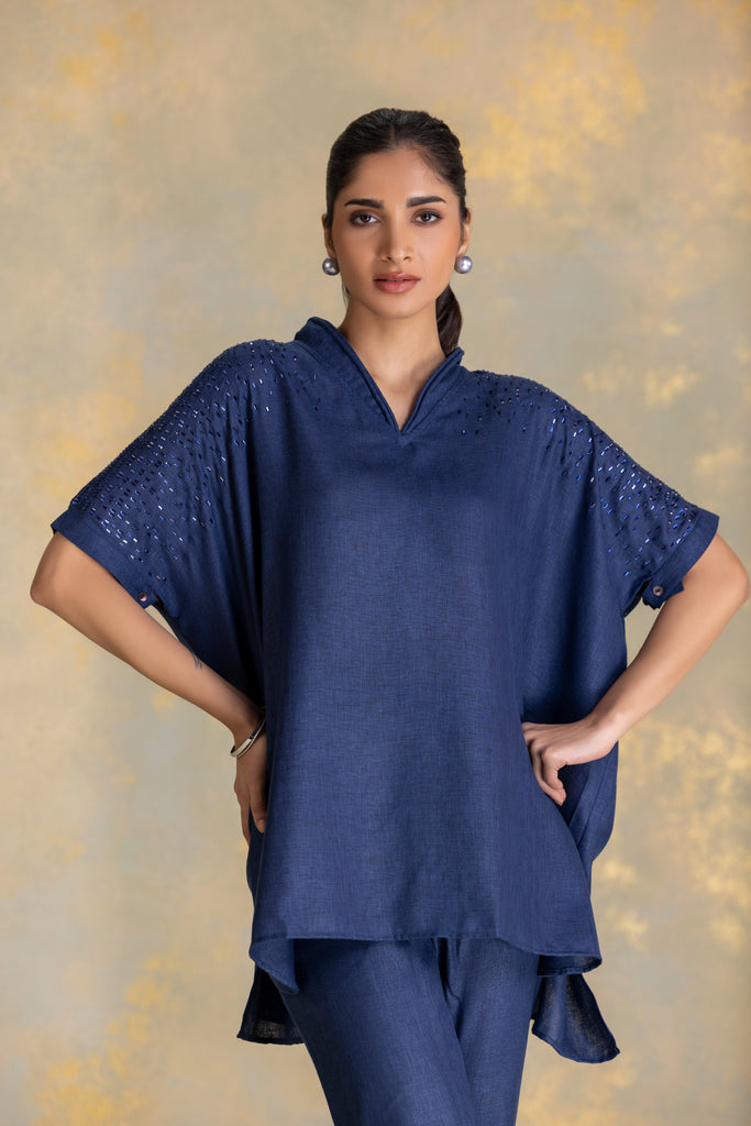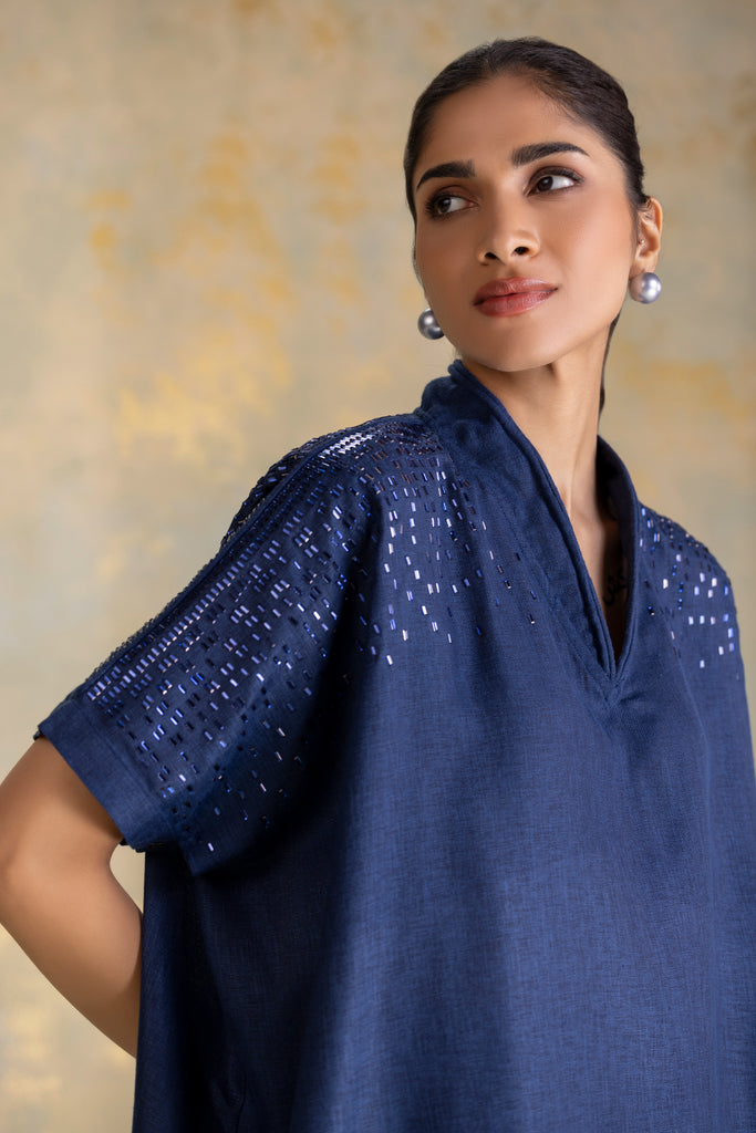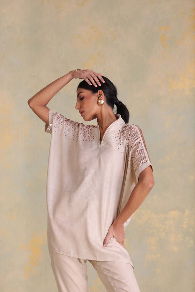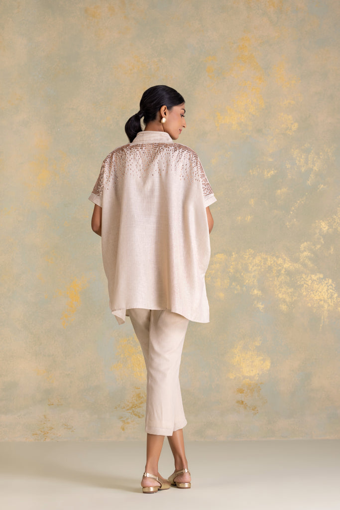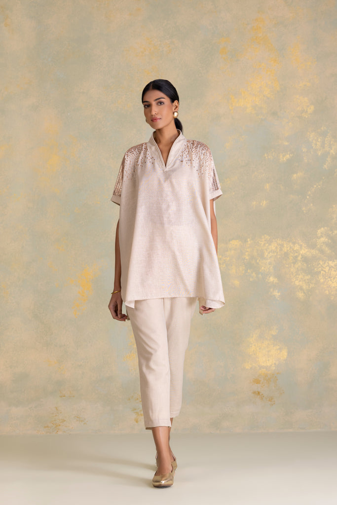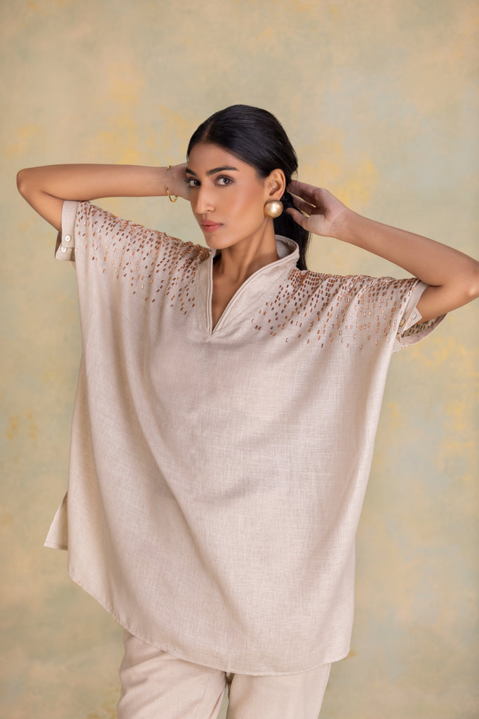 • Square top in a free-size silhouette, featuring a relaxed fit with a V-neckline and soft collar. The 3/4 sleeves add ease and movement, while delicate studs at the shoulders fade gently downward, creating a subtle shimmer that enhances its effortless drape.