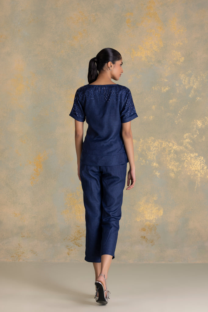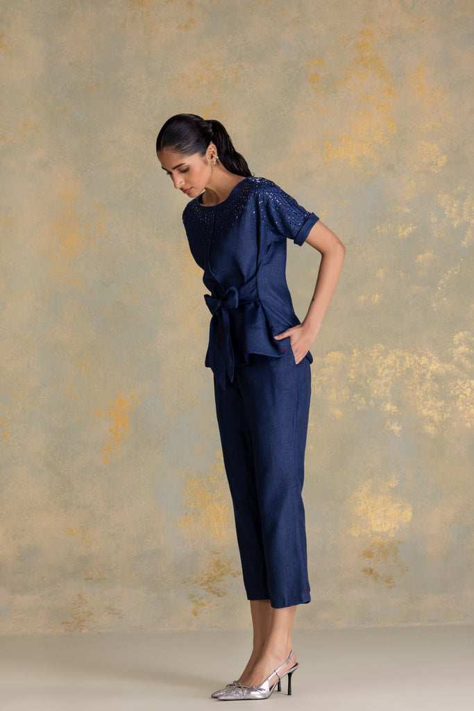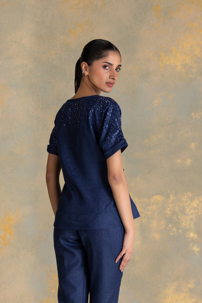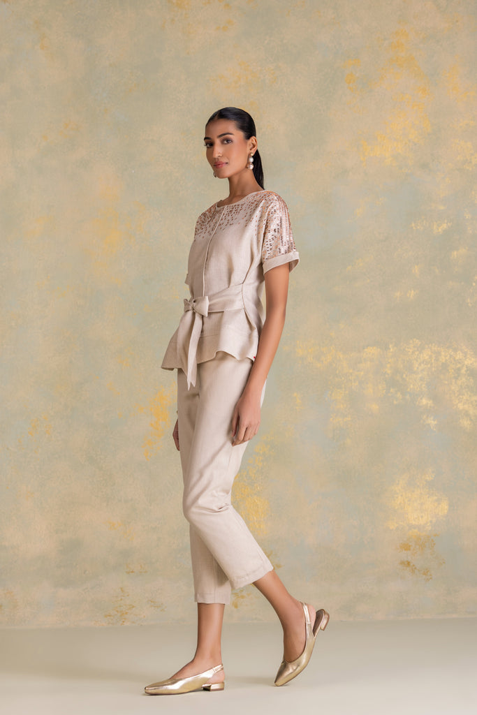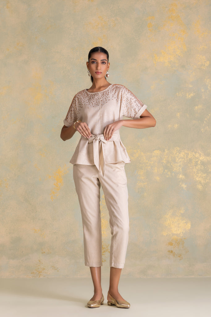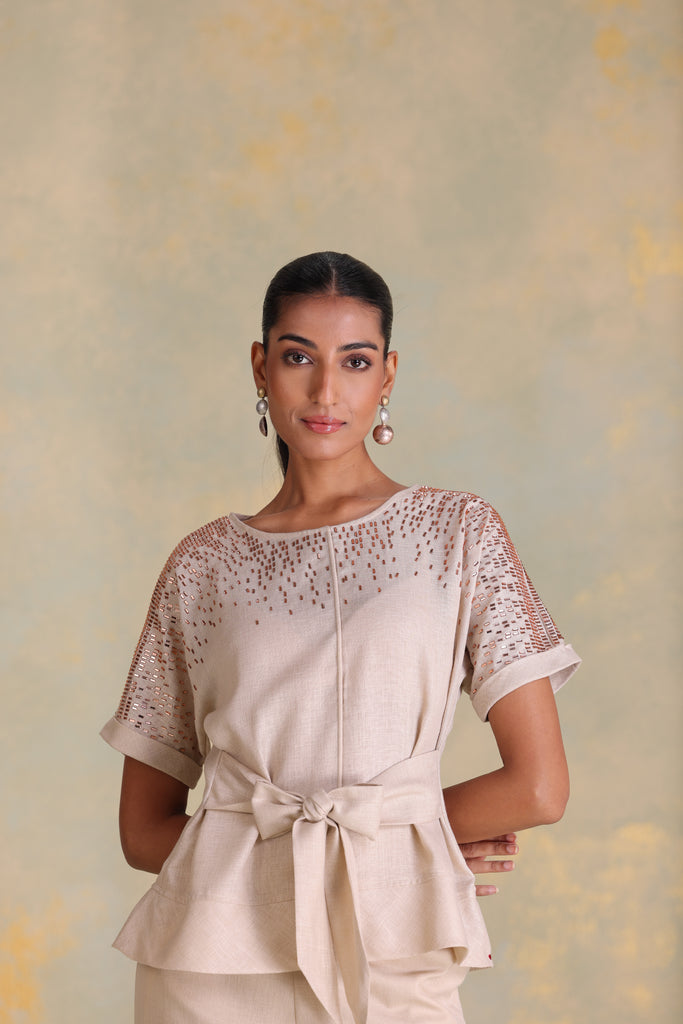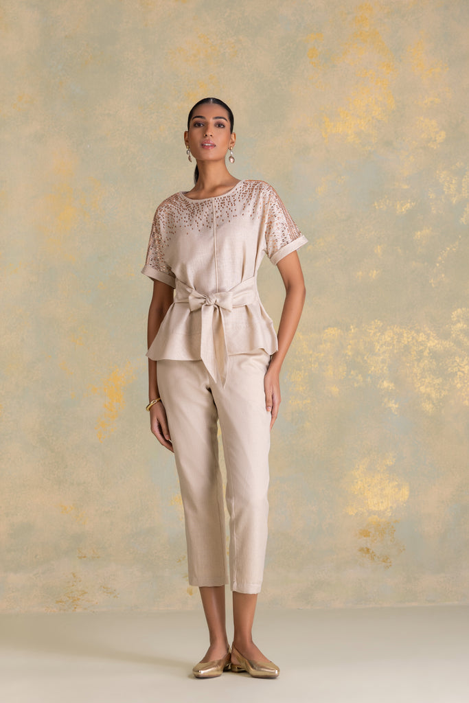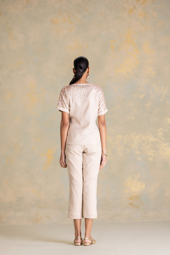 • Tina top featuring extended sleeves with cuffs and cord piping running through the center, complemented by a boat neckline and a tie-up at the waist. Studs fade softly from the shoulder, creating a gentle shimmer that echoes the fluid rhythm of rain. Paired with straight pants, it blends relaxed structure with refined detailing.
