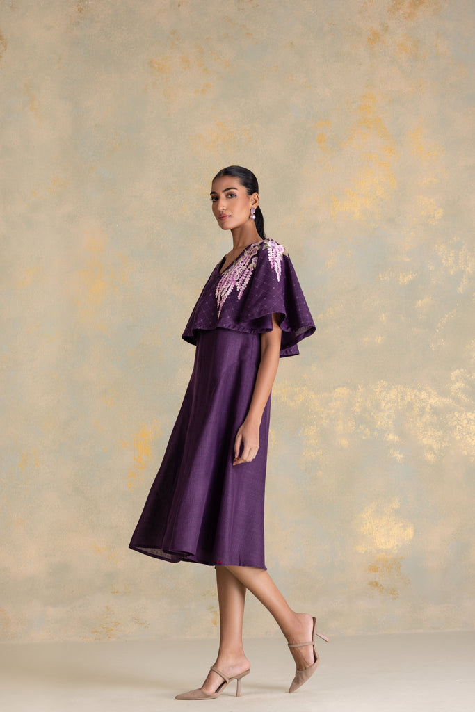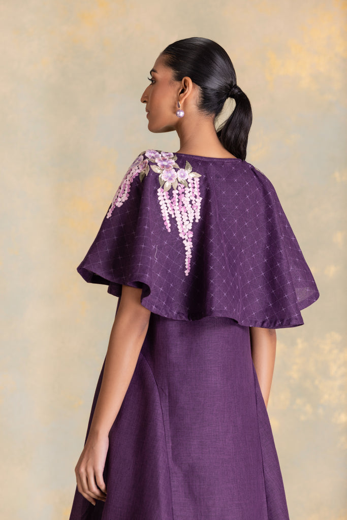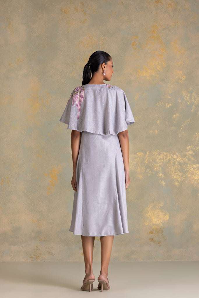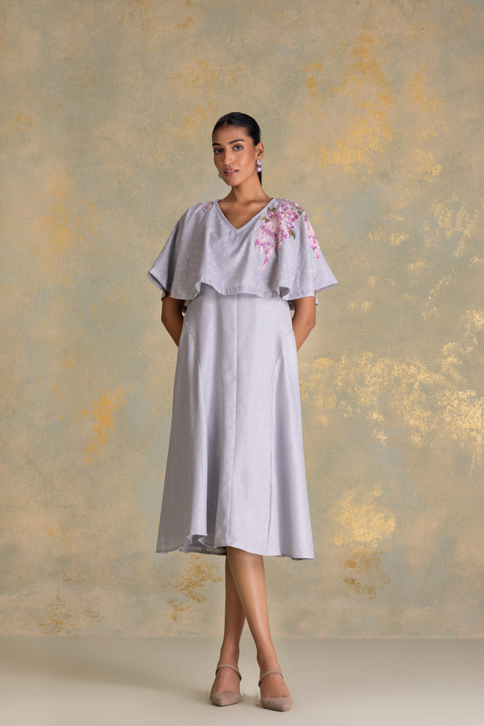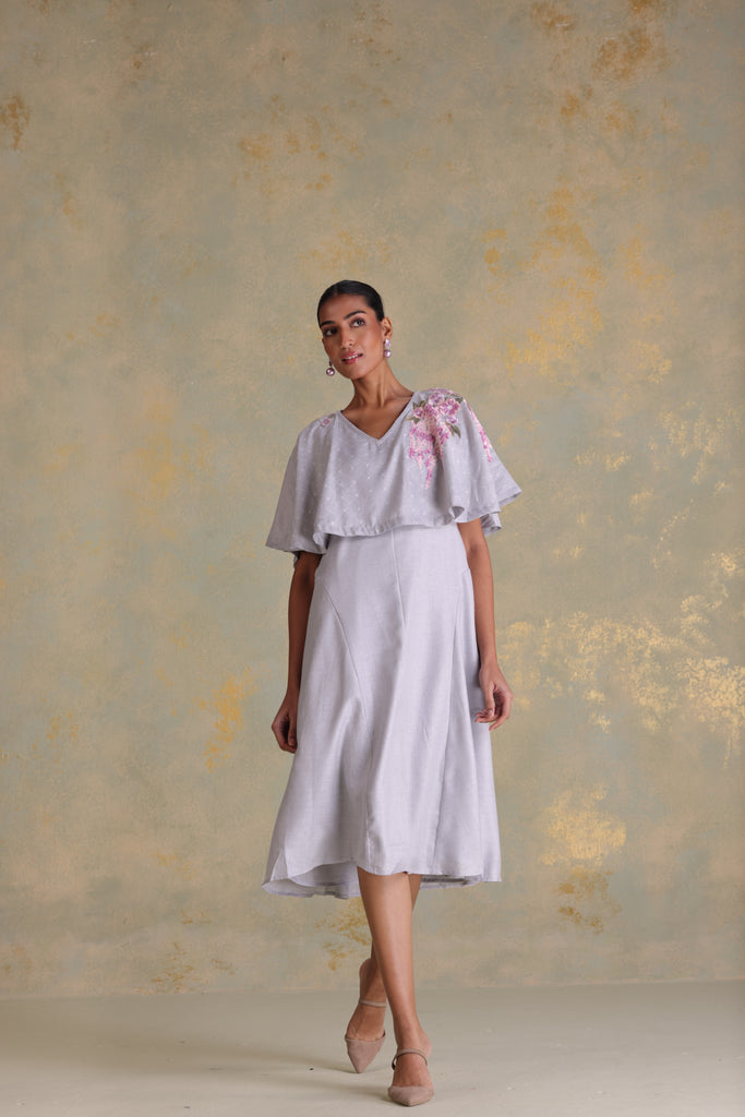 DELFINA draws its soul from the ethereal beauty of the Delphinium slender stems crowned with blossoms that reach toward light. The collection unfolds in two colourways, Aubergine and Smoke, echoing dusk and dawn in gentle contrast. Each piece is adorned with screen printing with cotton-shaded thread embroidery, where silk-thread laser-cut 3D flowers bloom softly across the surface, their petals touched with gold-foiled leaves that glimmer like sunlight after rain. Poetic and luminous, DELFINA captures the quiet strength and tender elegance of nature in bloom a harmony of craftsmanship, light, and grace.