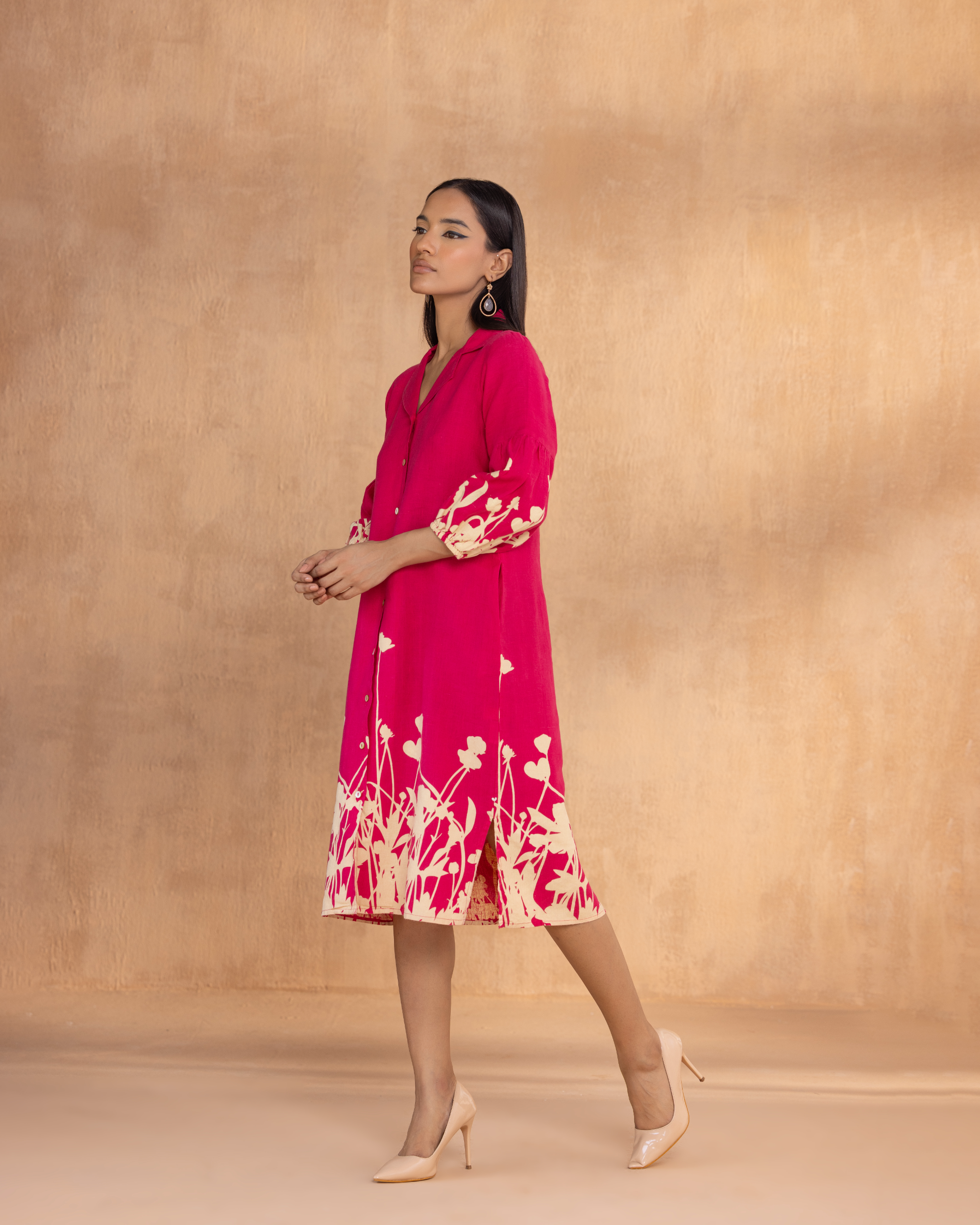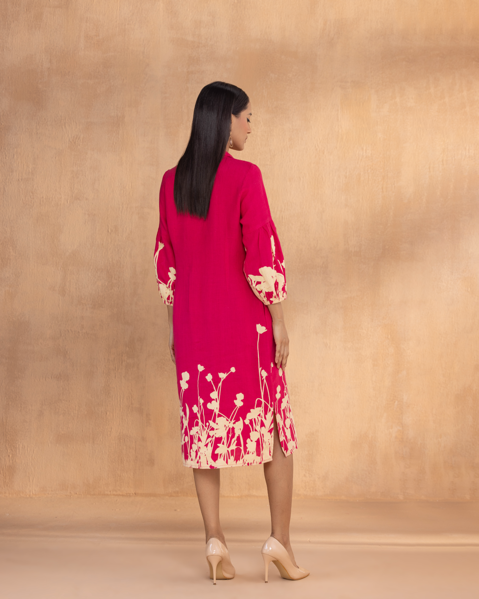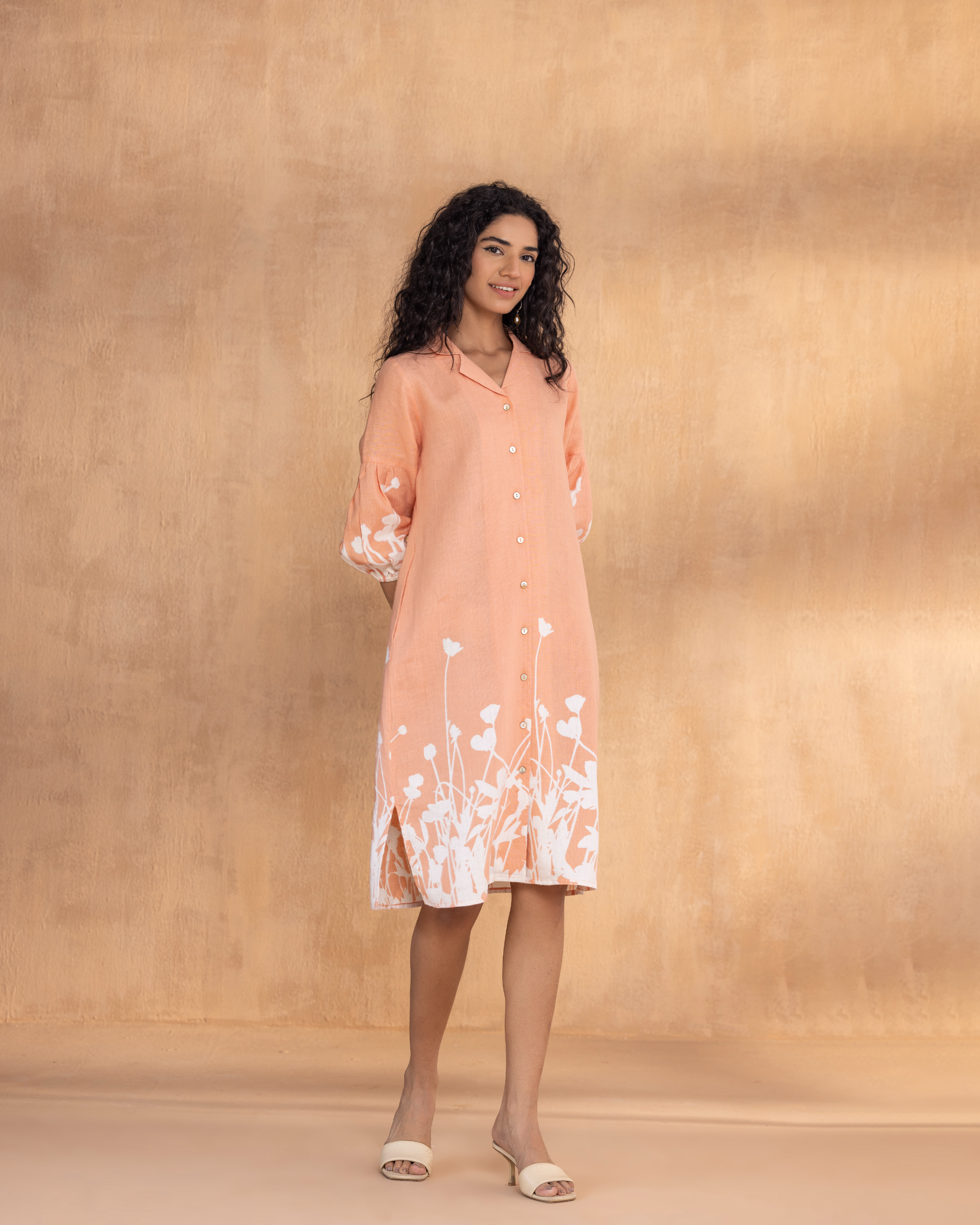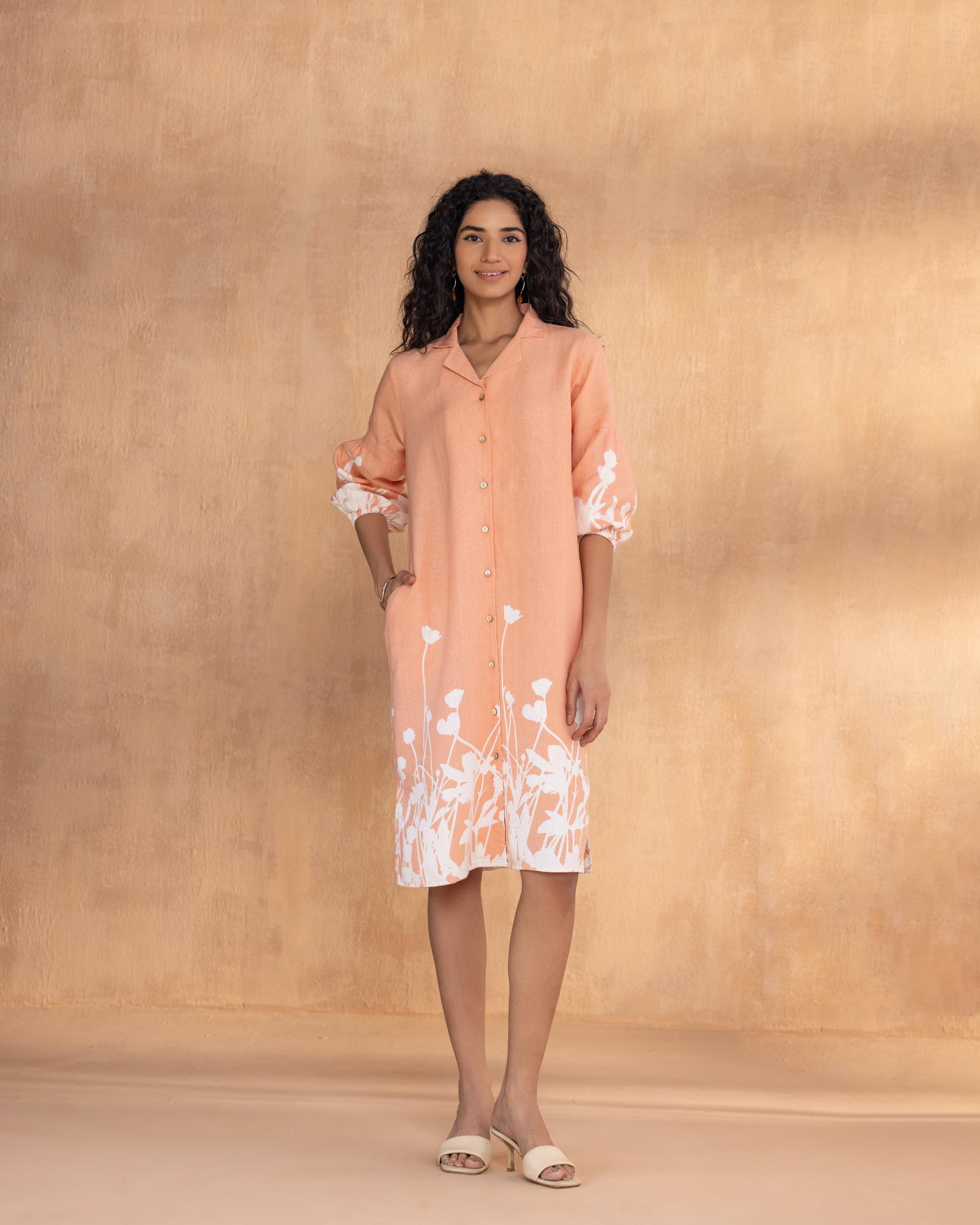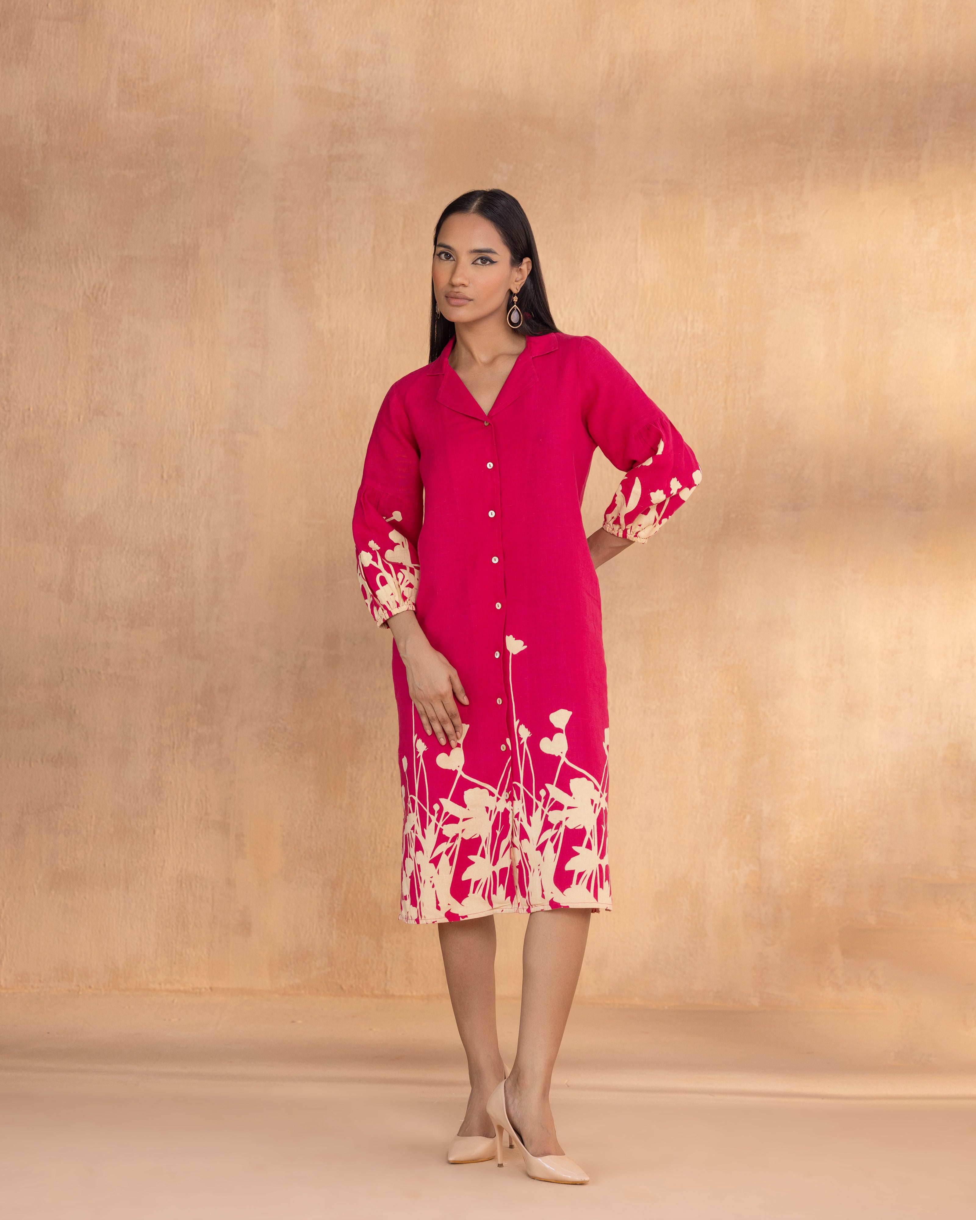 Celebrate the poetry of petals in Floral Ballet, where prints bloom like memory, evoking the moment of morning blossoms that unfold, awakening the day. The discharge mix technique continues the prints to shift subtly across the fabric, giving the illusion of painted movement rather than static motifs. A feminine cut with softly puffed sleeves, smart collars, and delicate shell buttons feels like a nod to nostalgia, reimagined for the present, making it a poetic story in motion.