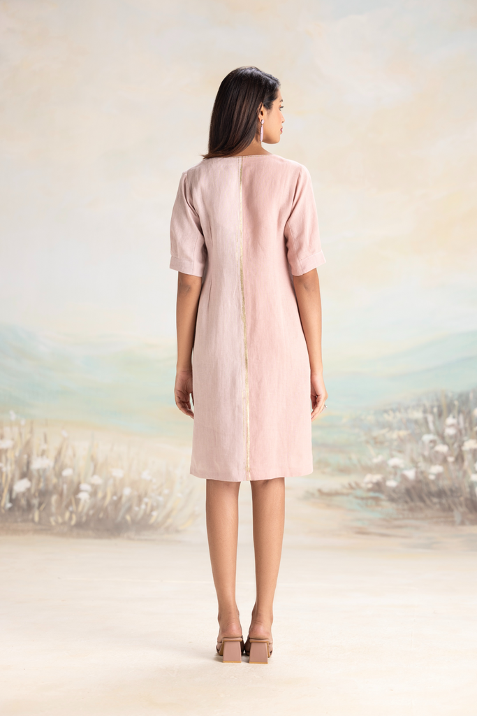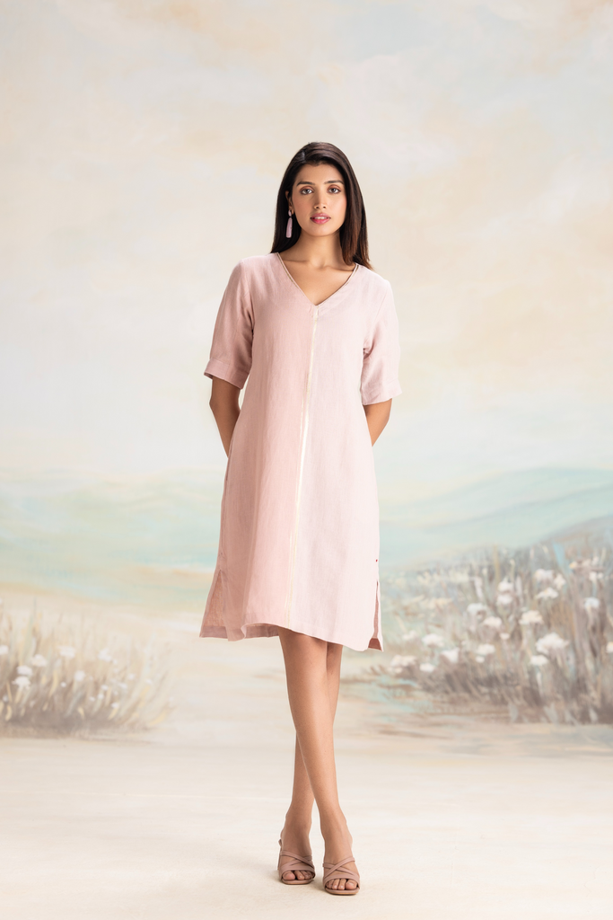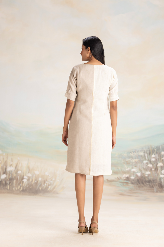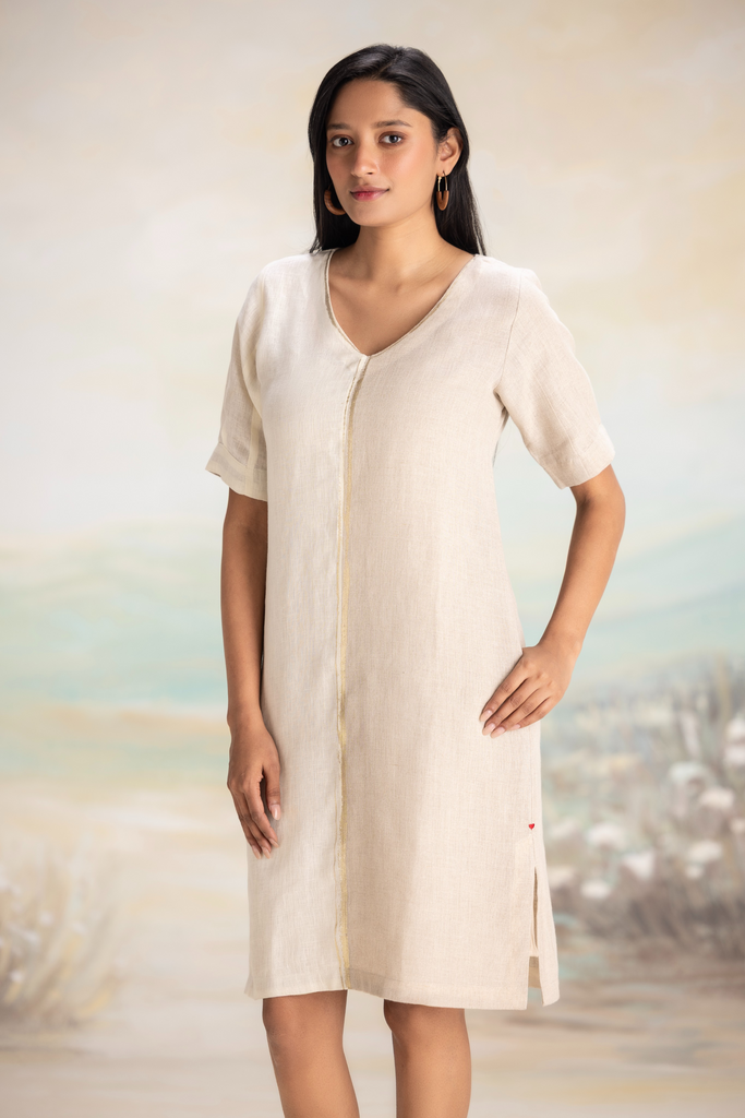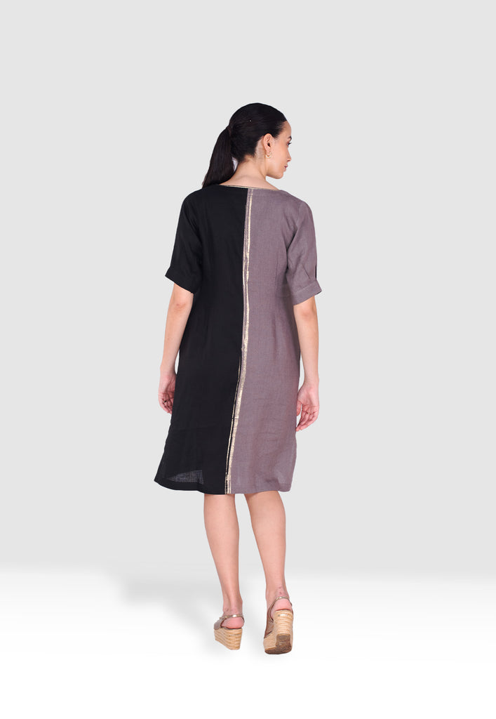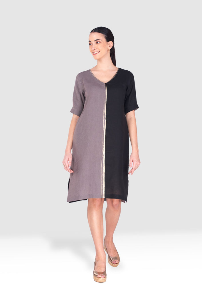 • Dress Length 42” / Model height 5'8" • A V-neck dual color paneled linen dress with patch pockets and smart 3/4th sleeves which has a comfortable relaxed fit that allows breathability and effortless movement throughout the day.
