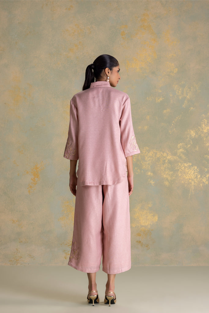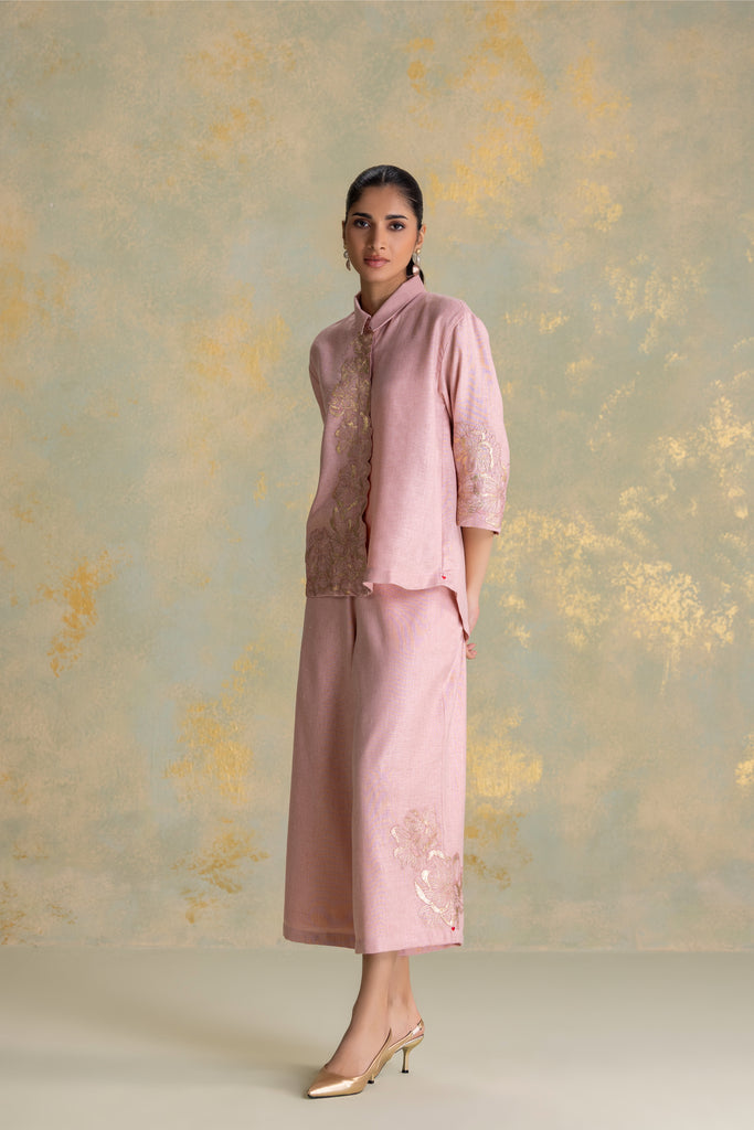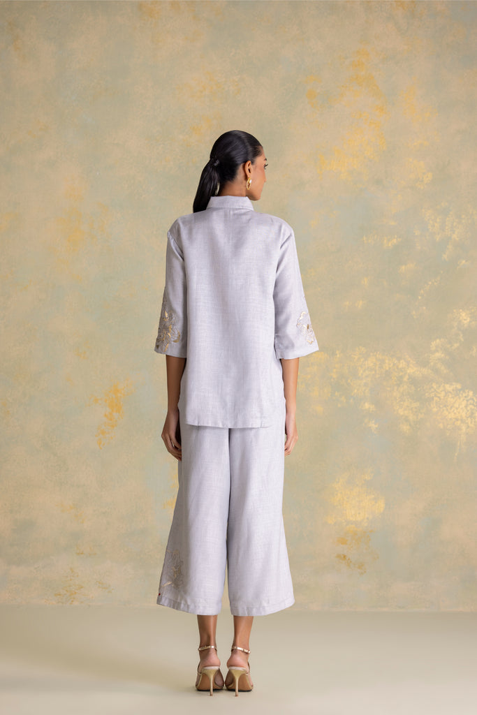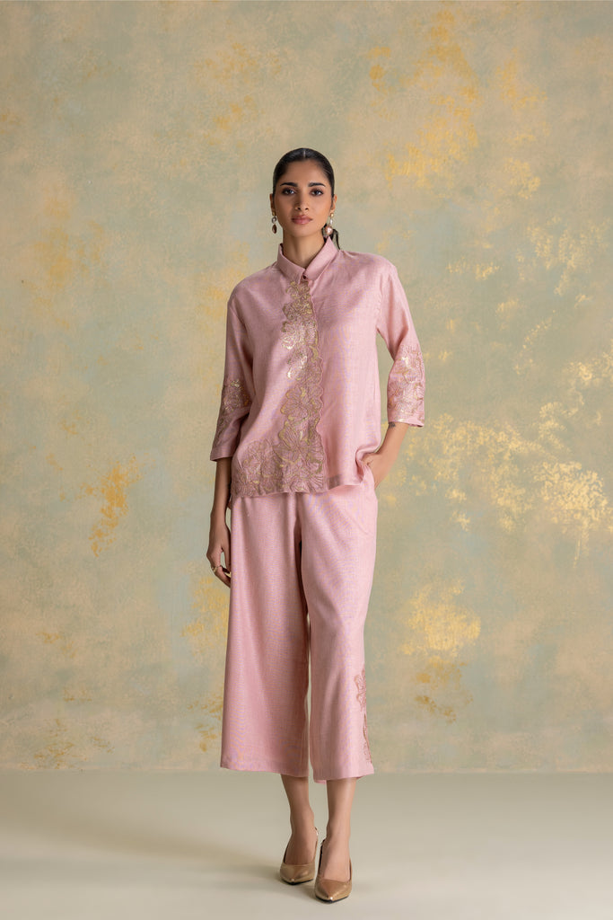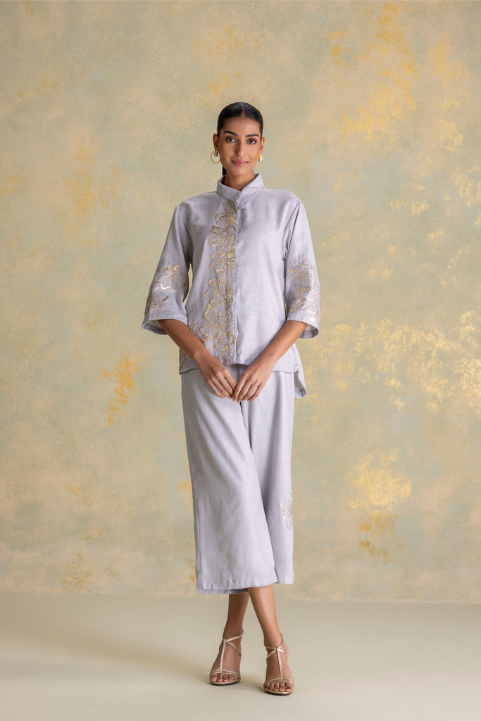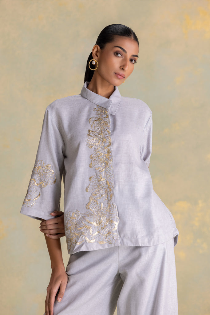 Golden Grace captures the serene radiance of sunlight as it kisses blossoms in their quietest bloom, a celebration of luminosity, delicacy, and poise. Each piece features intricate floral cotton thread embroidery touched with a gentle veil of gold shimmer, creating a soft interplay of light and texture. Presented in two graceful colourways, Blush and Smoke, the collection embodies handcrafted artistry with modern refinement, a timeless ode to nature’s gentle glow and the grace that lingers long after the moment has passed.