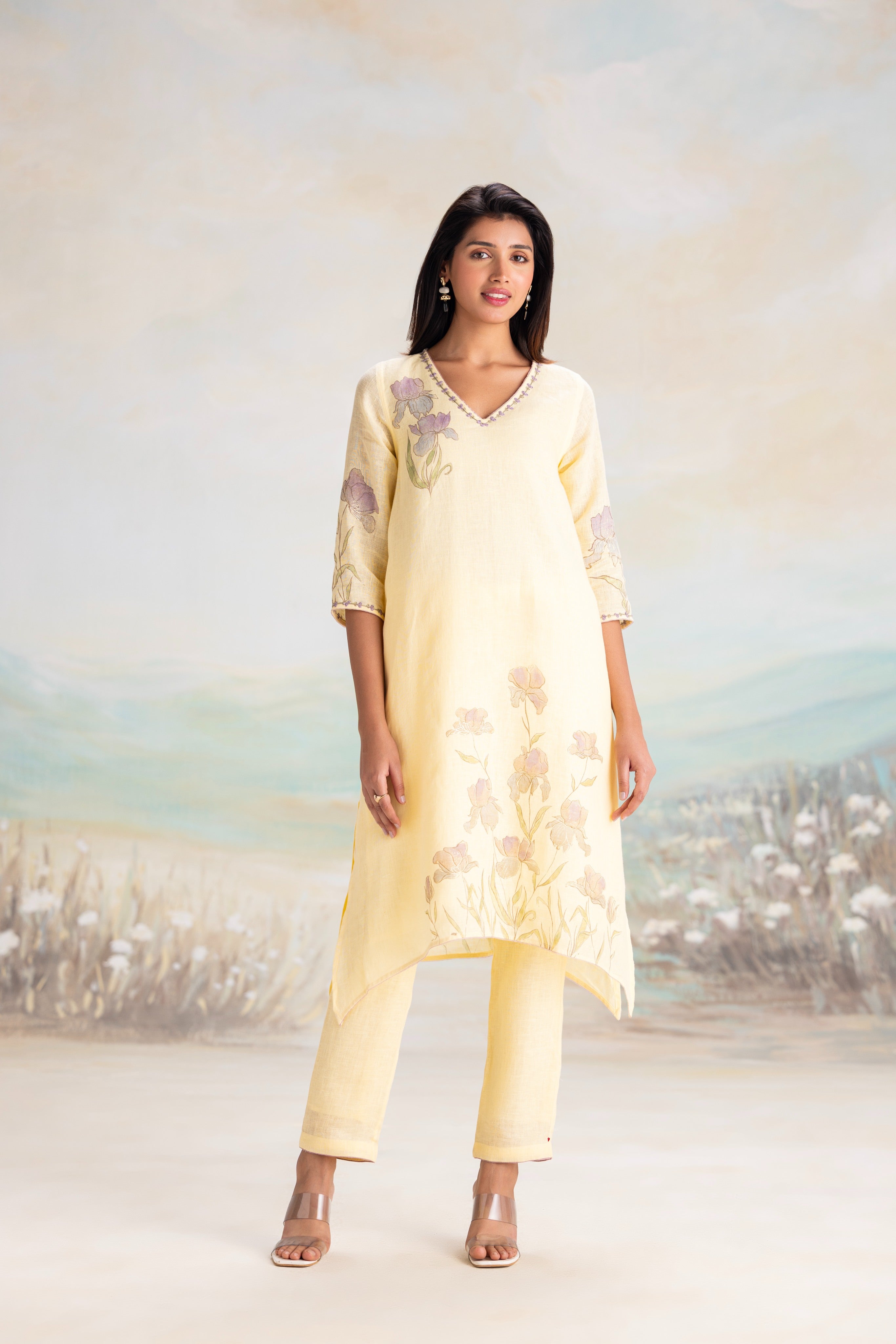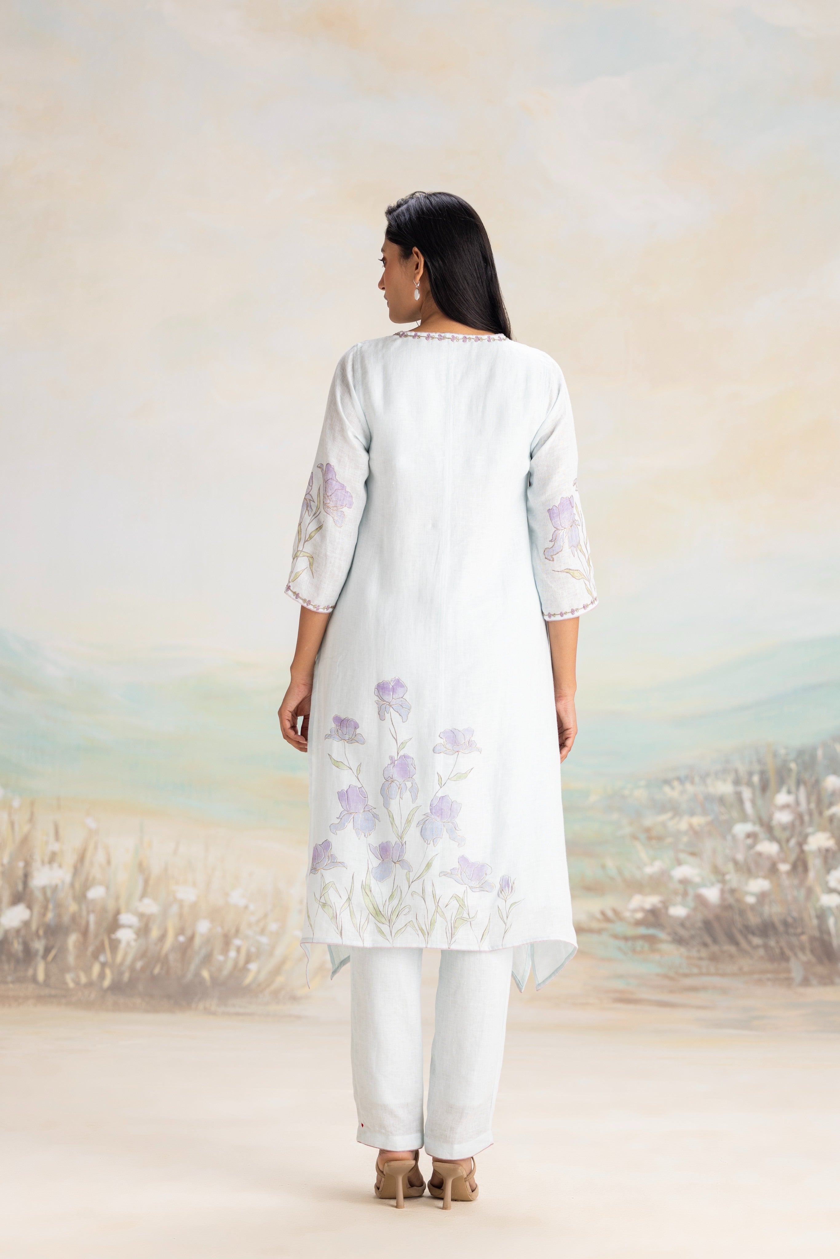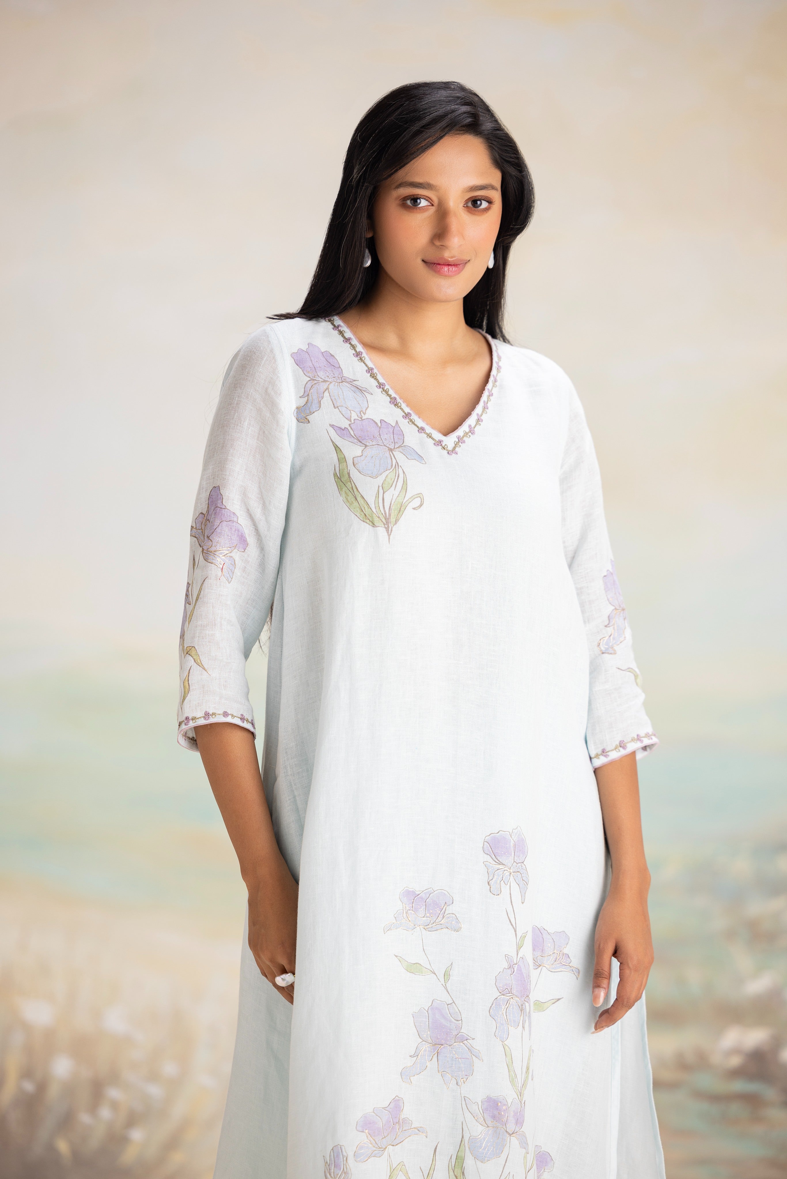 Inspired by the delicate purple iris that graces the English countryside, this collection embodies timeless beauty and is a testament to exquisite craftsmanship. Hand-sketched in the style of vintage botanical illustrations, the floral motifs are meticulously hand screen-printed on luxurious linen- their soft strokes akin to watercolours on paper. Thoughtfully placed, these blooms unfold with graceful femininity, further enhanced by shimmering gold foil artwork that shines with your every move. The elegance of each piece is elevated by our beloved hand-embroidered tassels.