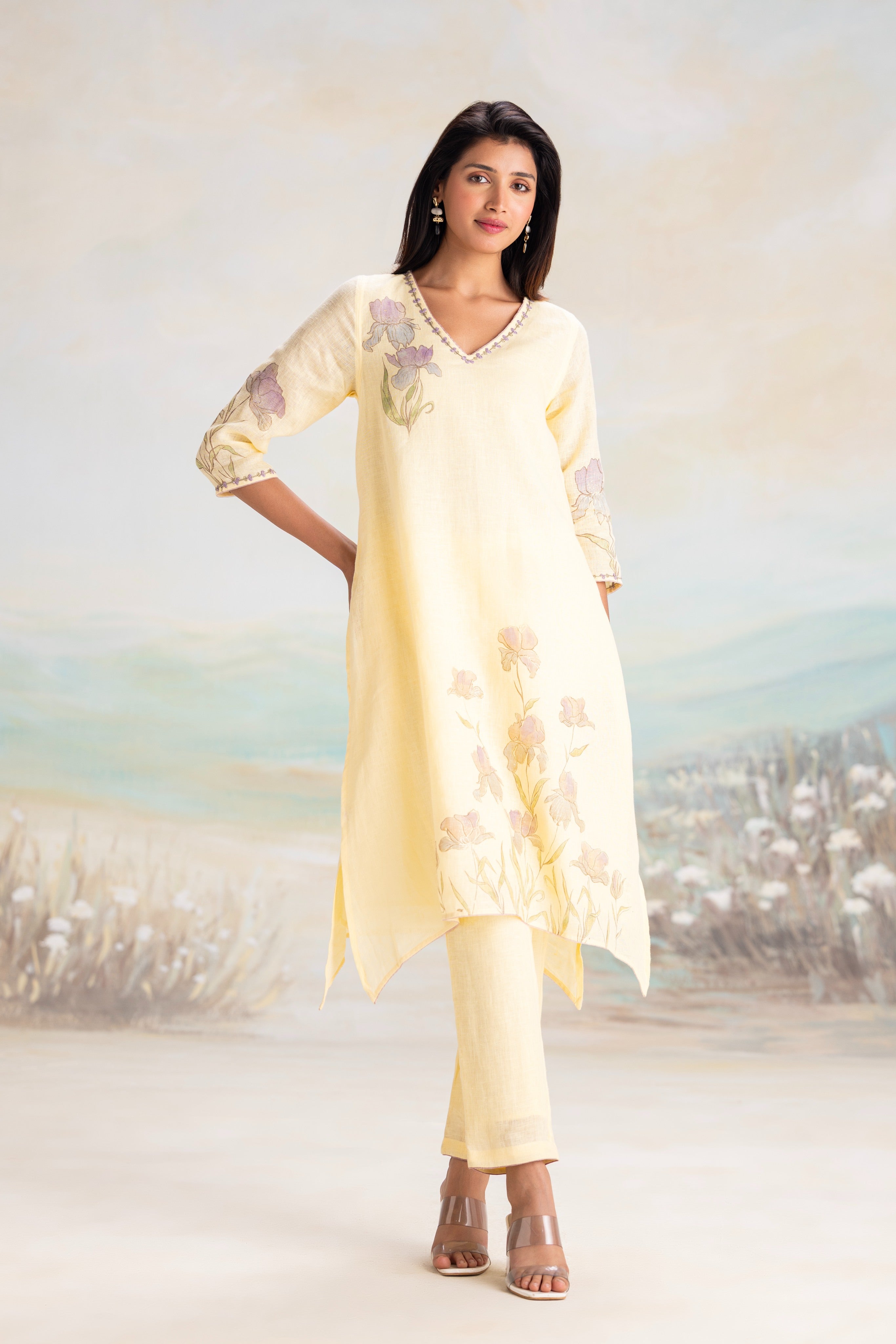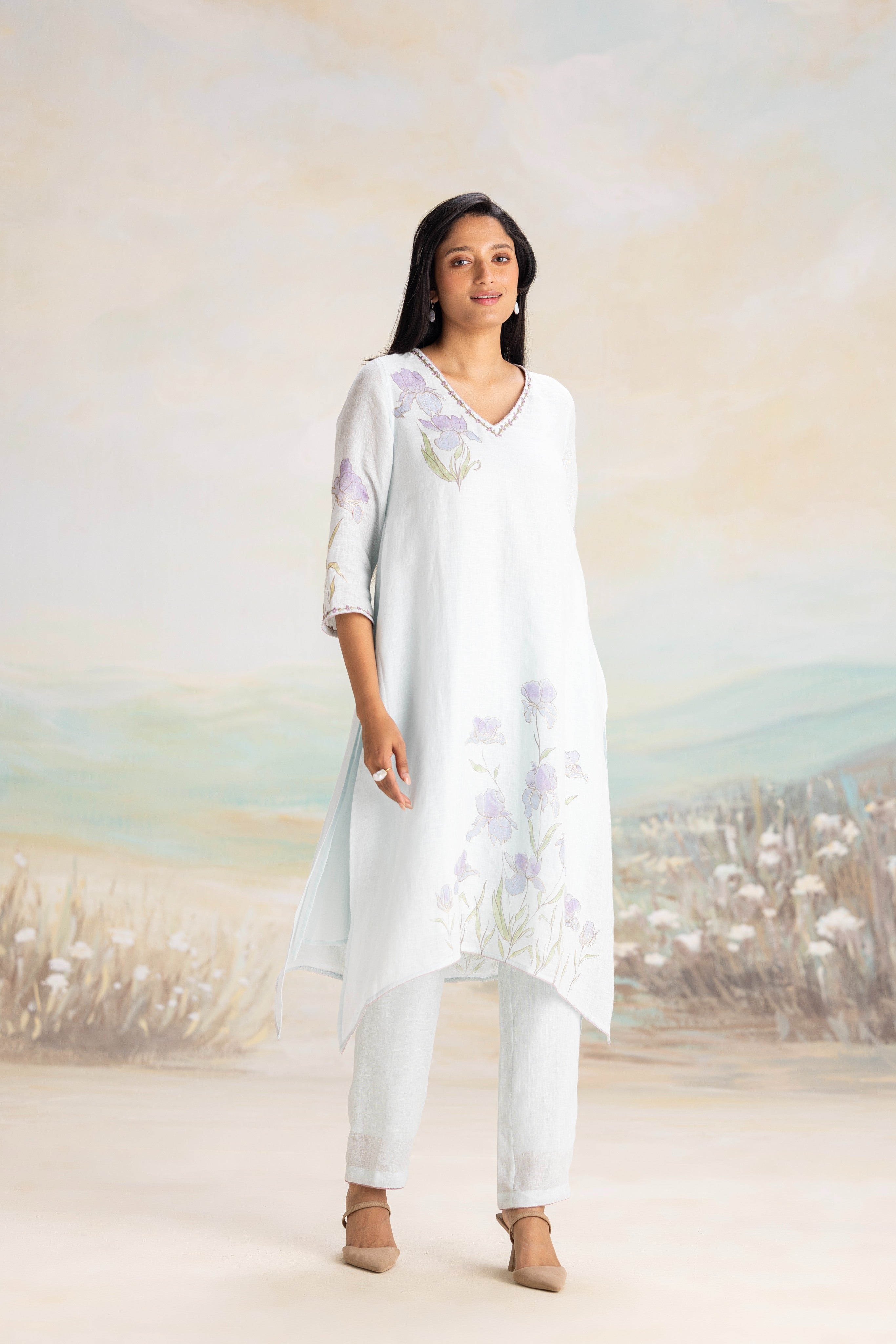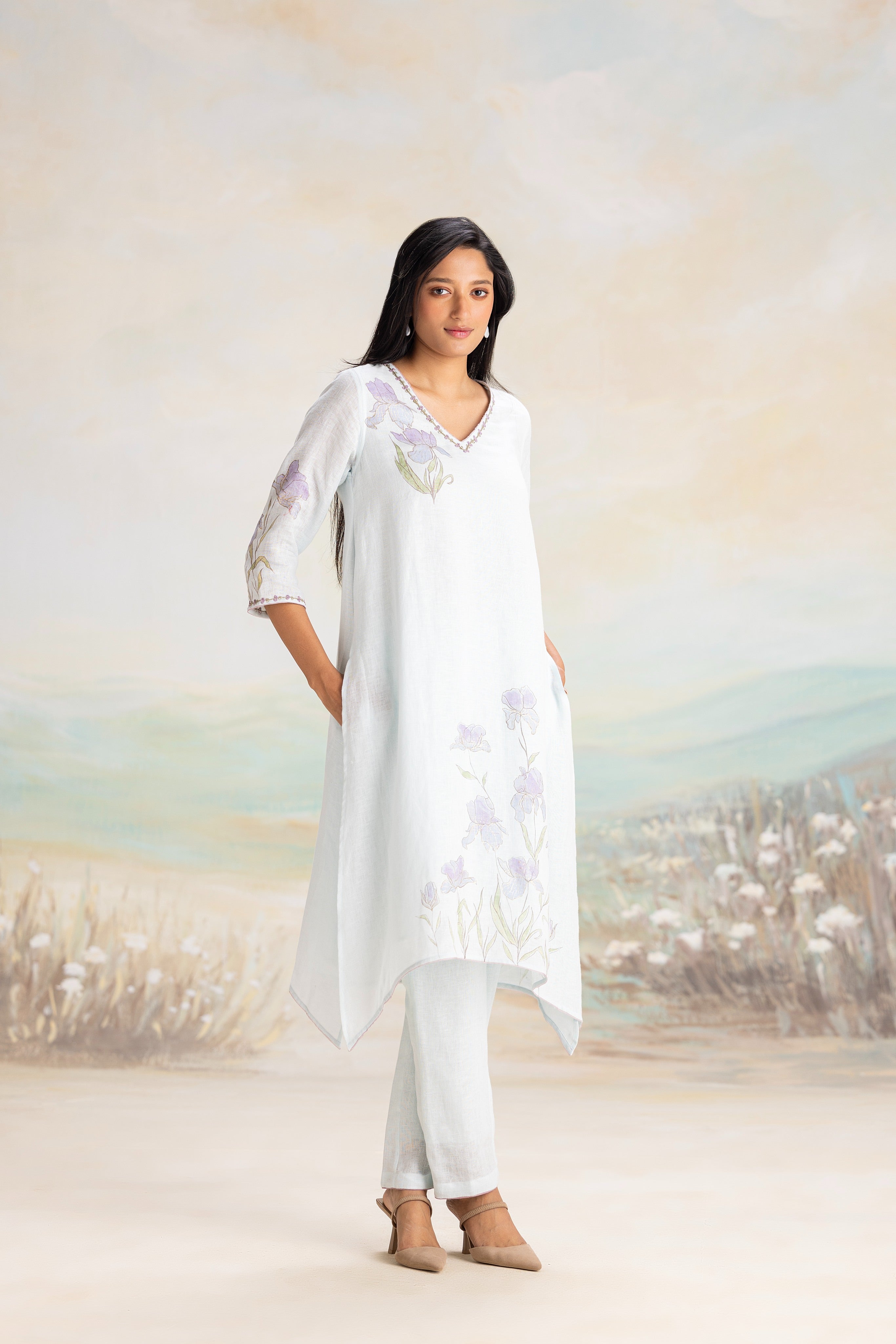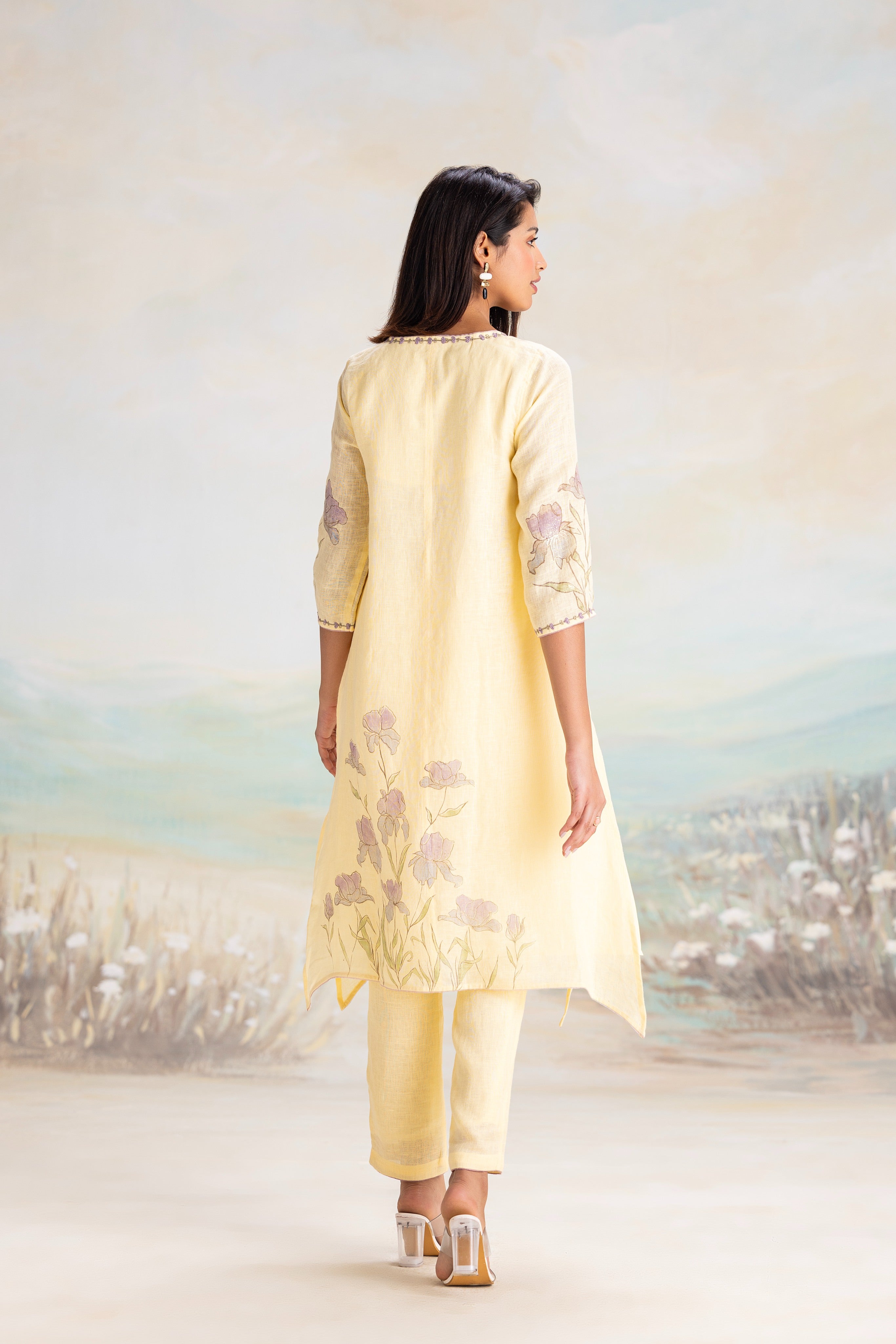 Inspired by the delicate purple iris that graces the English countryside, this collection embodies timeless beauty and is a testament to exquisite craftsmanship. Hand-sketched in the style of vintage botanical illustrations, the floral motifs are meticulously hand screen-printed on luxurious linen- their soft strokes akin to watercolours on paper. Thoughtfully placed, these blooms unfold with graceful femininity, further enhanced by shimmering gold foil artwork that shines with your every move. The elegance of each piece is elevated by our beloved hand-embroidered tassels.