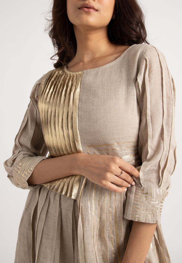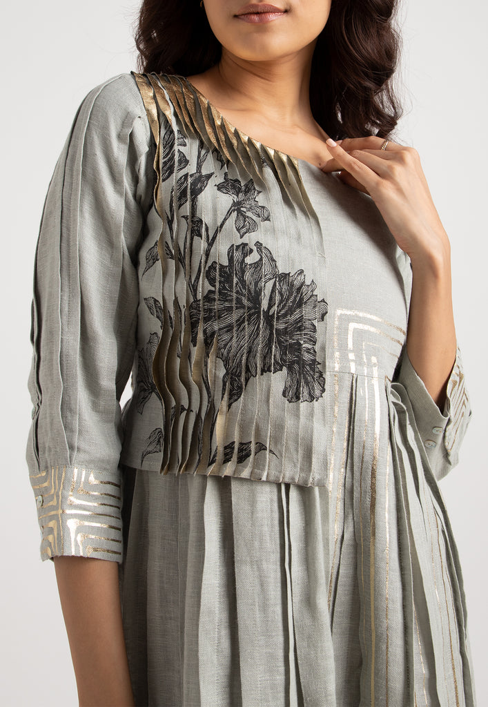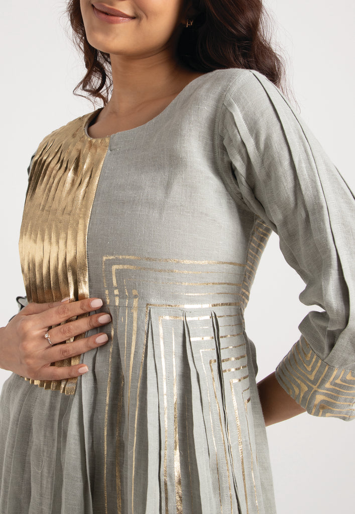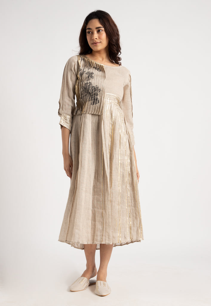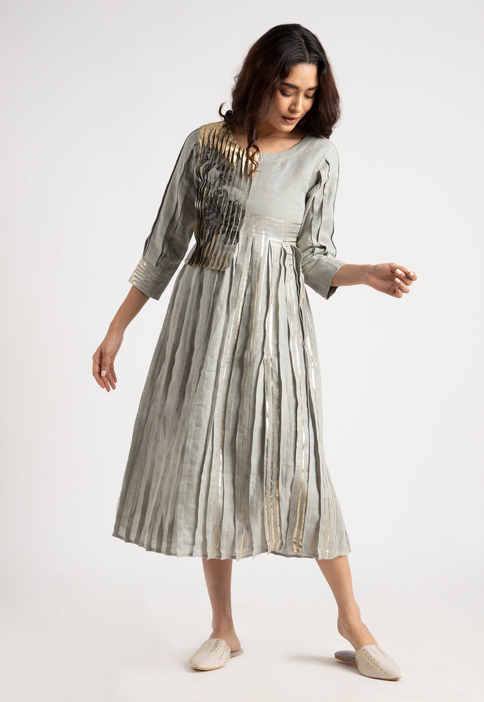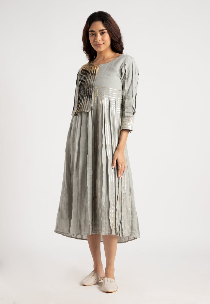 • A beautiful round neck dress adorned with hand screen printed motifs and pixelated illusion effect.
