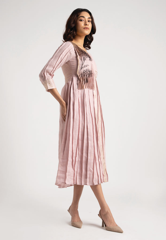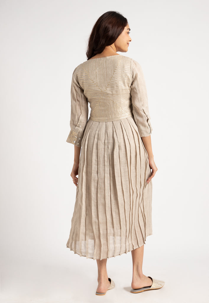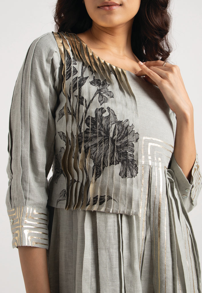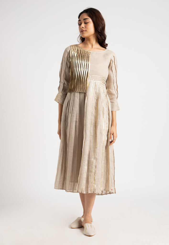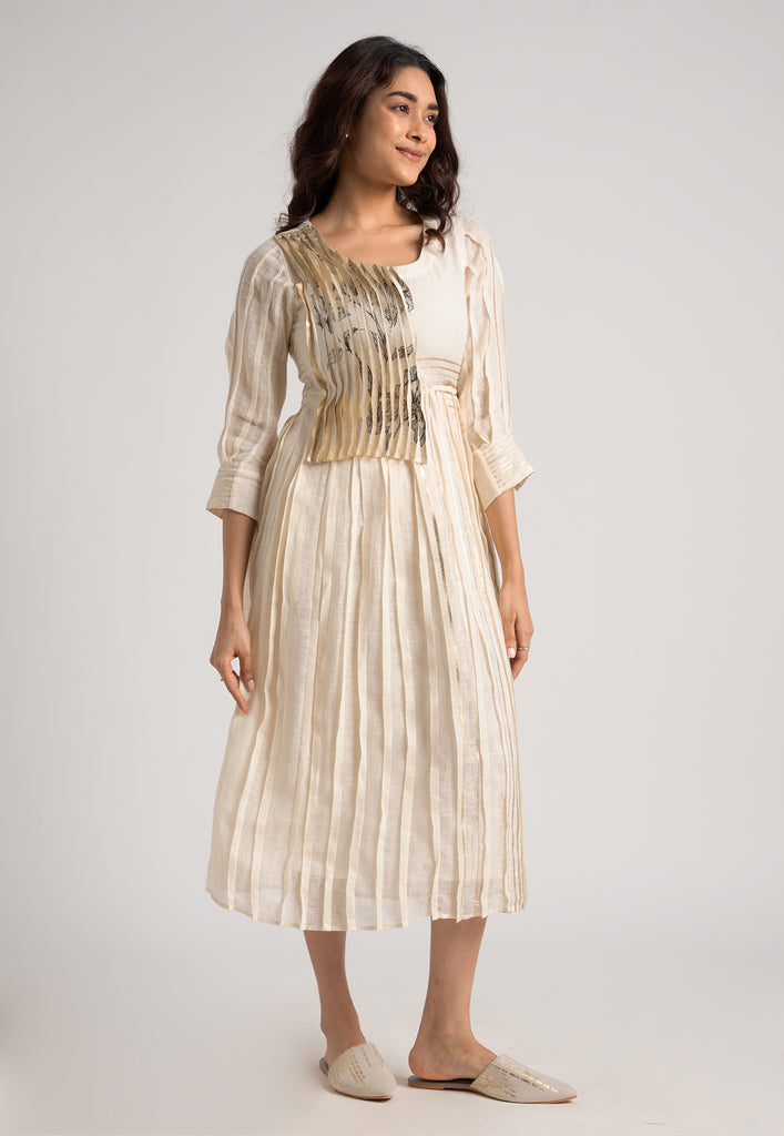 • A beautiful round neck dress adorned with hand screen printed motifs and pixelated illusion effect.