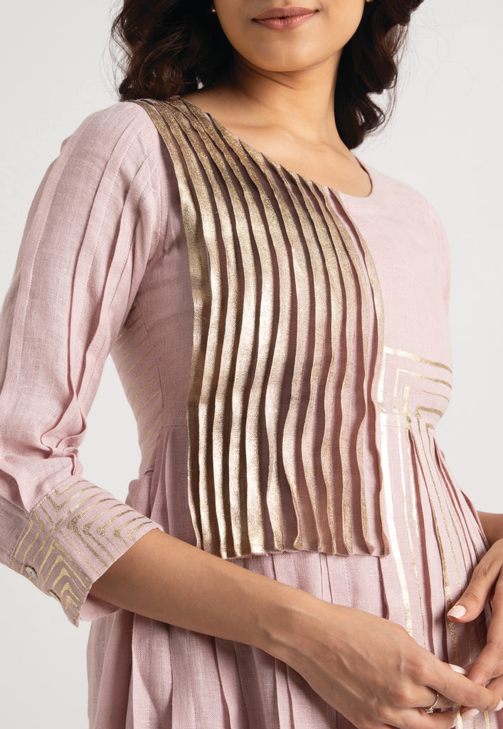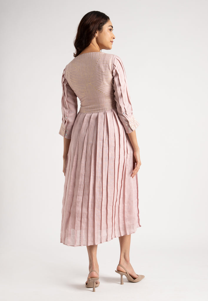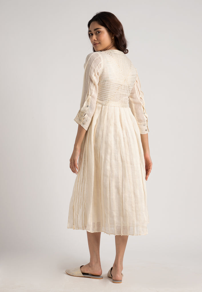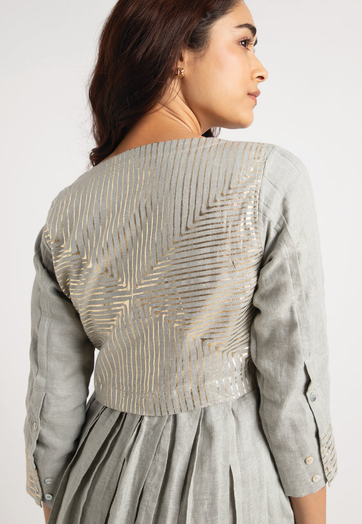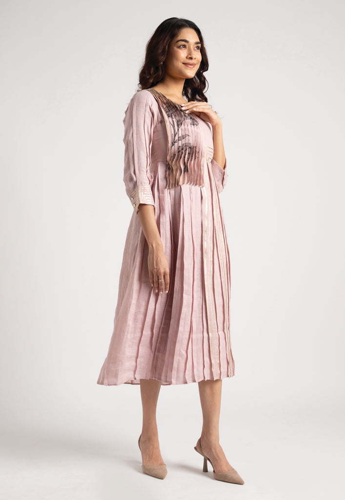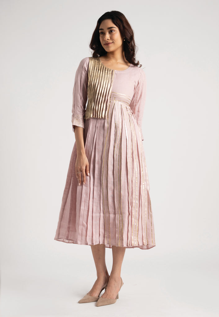 • A beautiful round neck dress adorned with hand screen printed motifs and pixelated illusion effect.