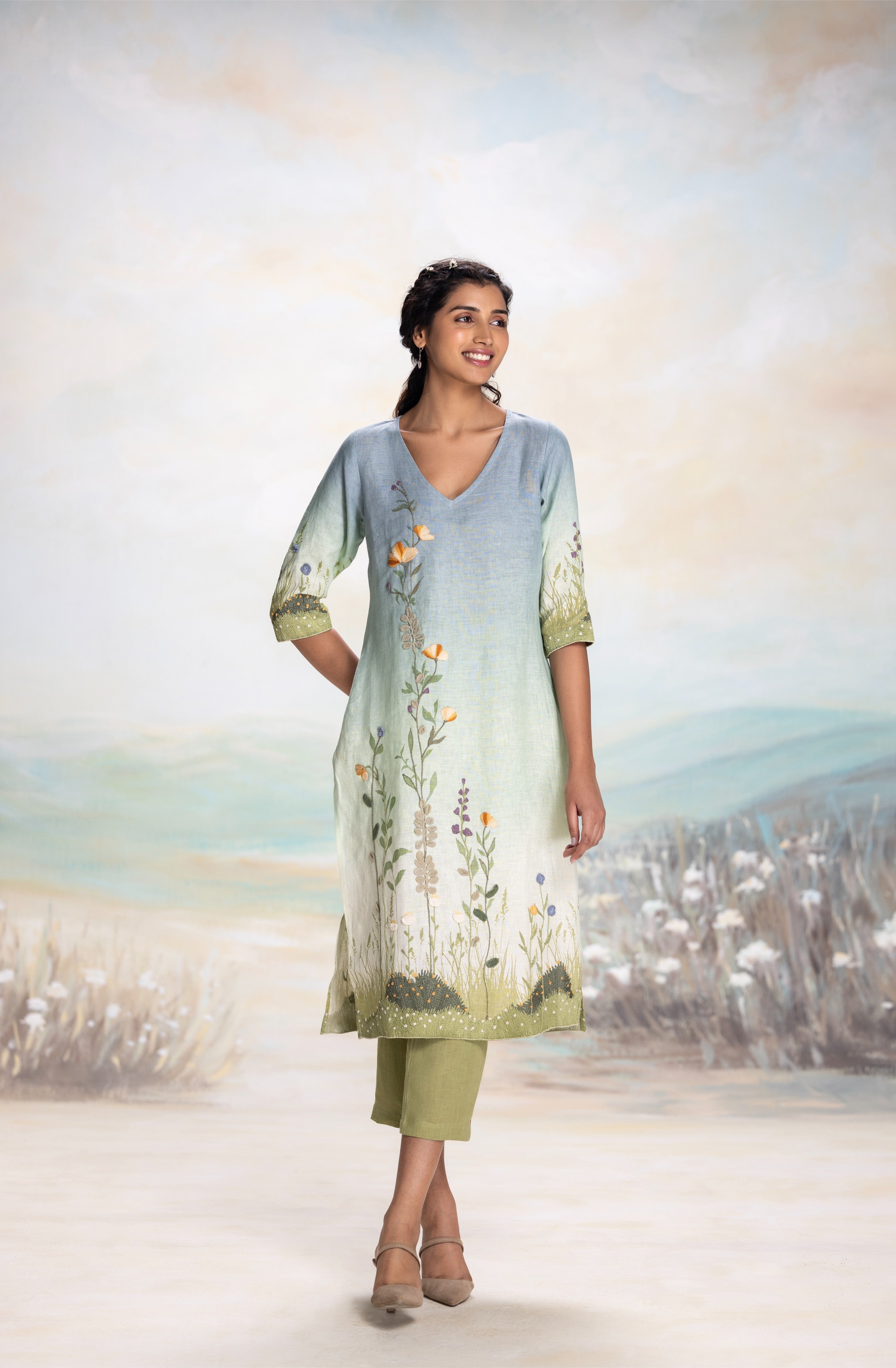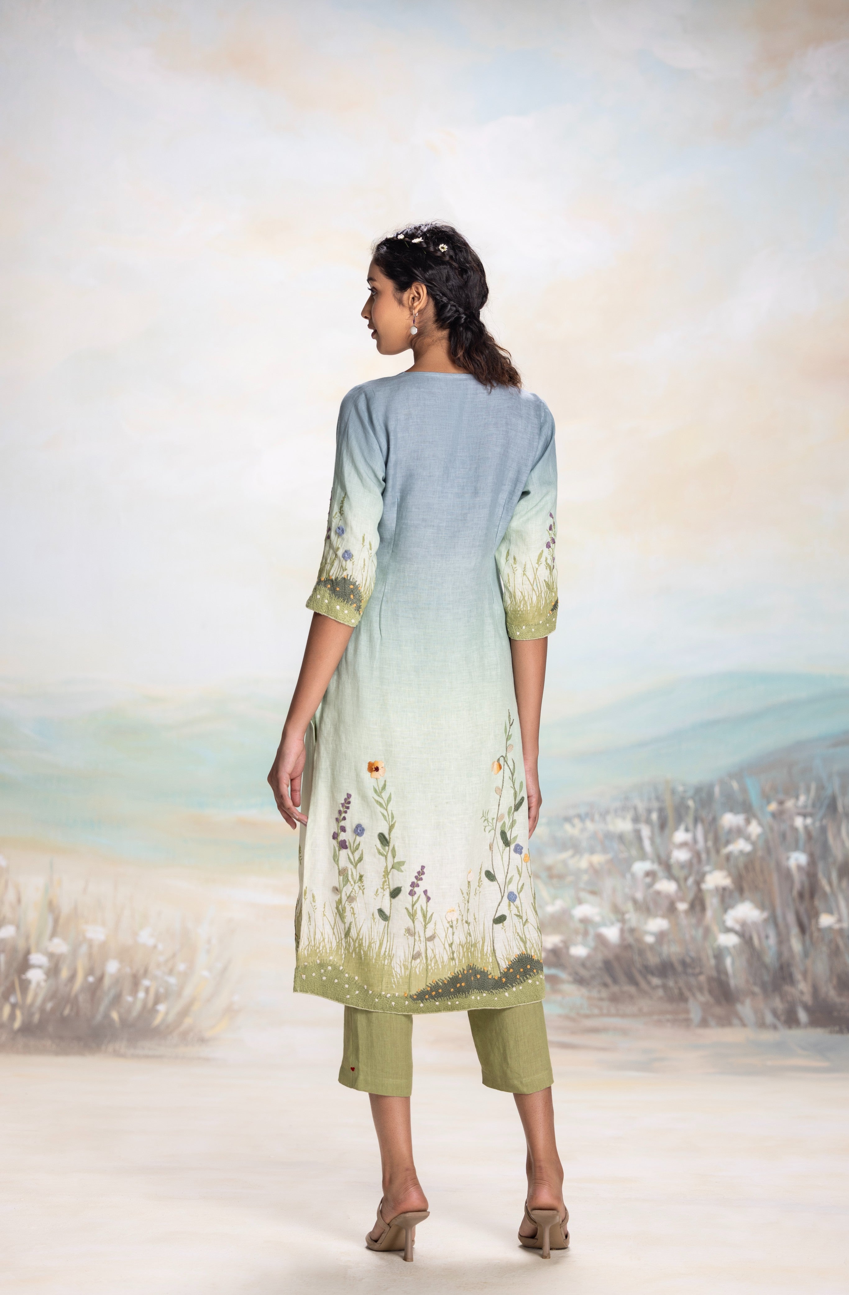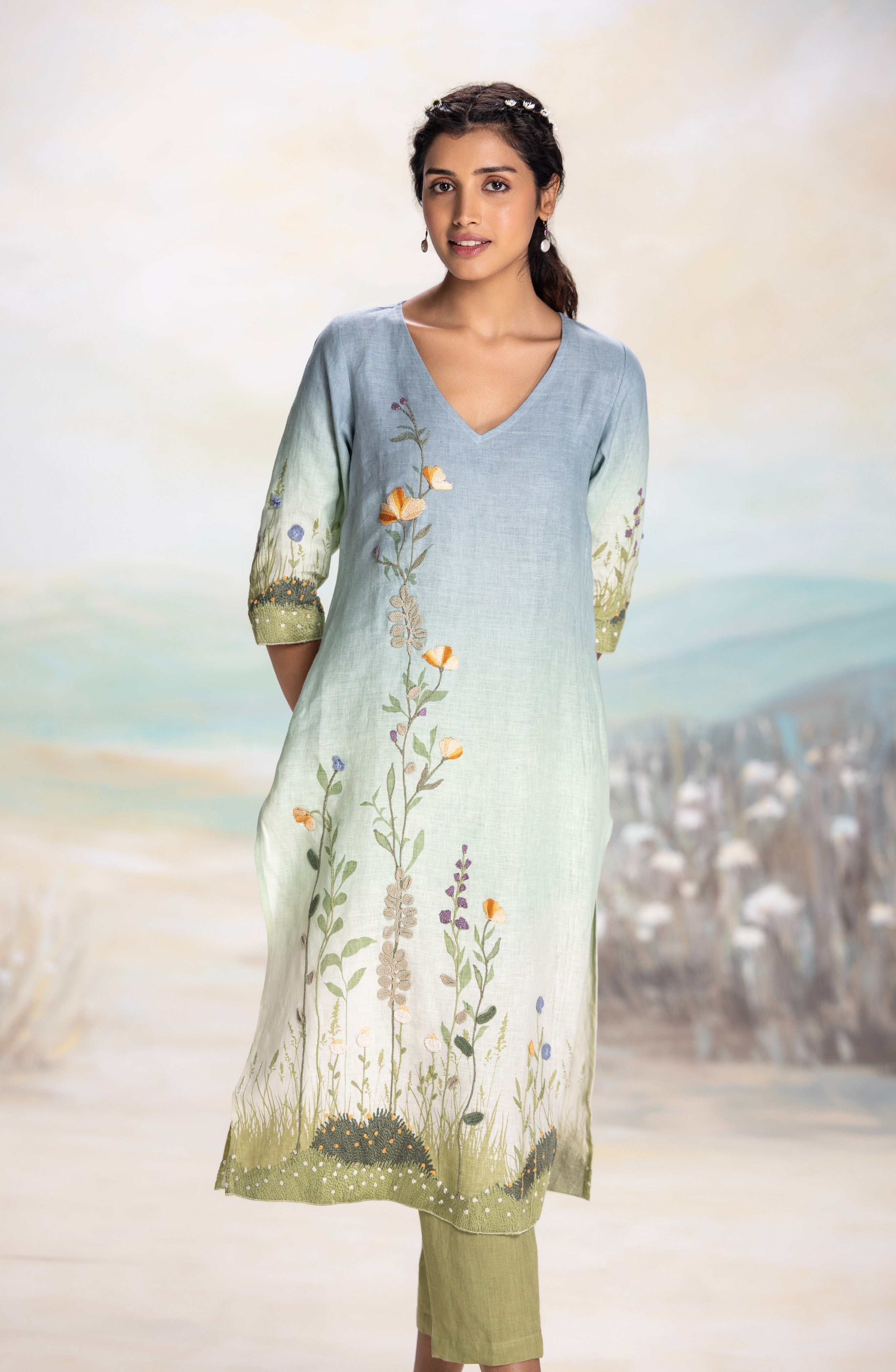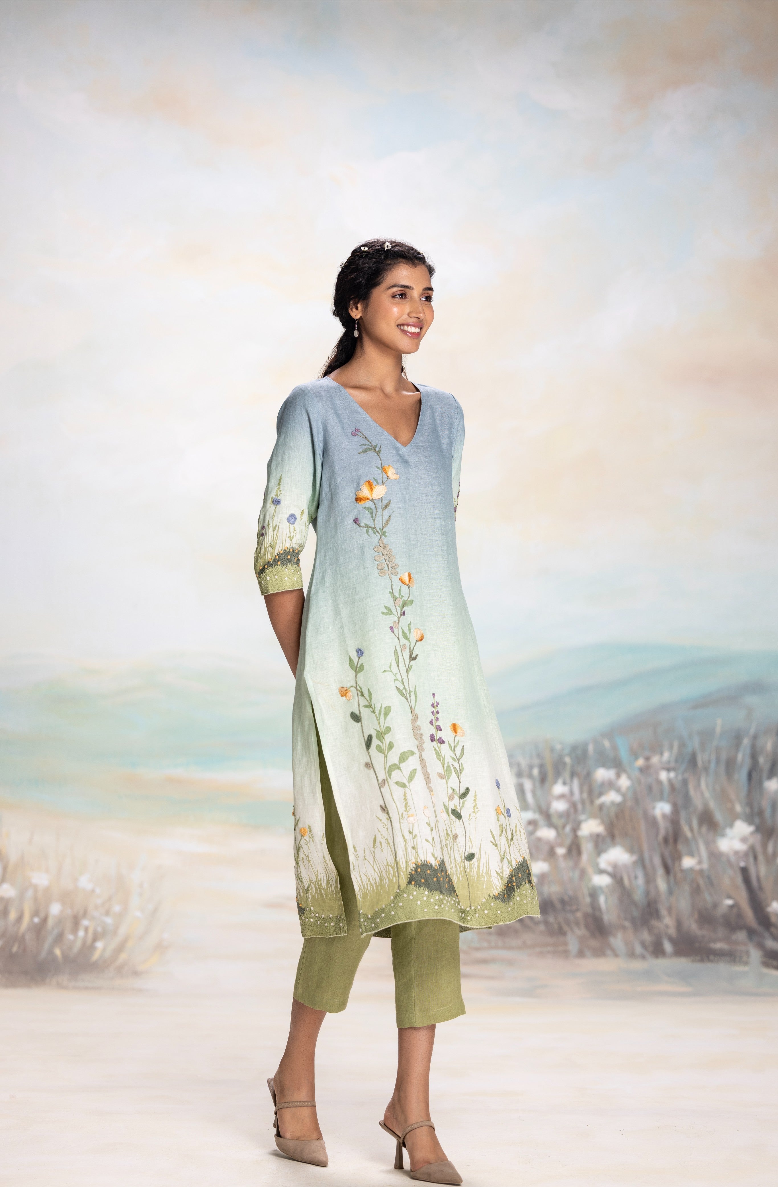 Escape to tranquil outdoors with the poetic decadence of Landscape . A breathtaking collection that captures a sunny afternoon or sun-kissed horizons at sunset in luxurious linen. Each piece is bathed in soothing tonal ombre dip-dyed shades, enriched layer by layer with handmade crochet embroidery, screen printed and shadow painted flora and fauna. Intricate cotton thread embroidery buoyantly moves across the fabric adding depth and dimension to a picturesque meadow. Perfect choice for evening soirées or special occasions, these elegant styles honour craftsmanship at its finest- celebrating artistry and you.
