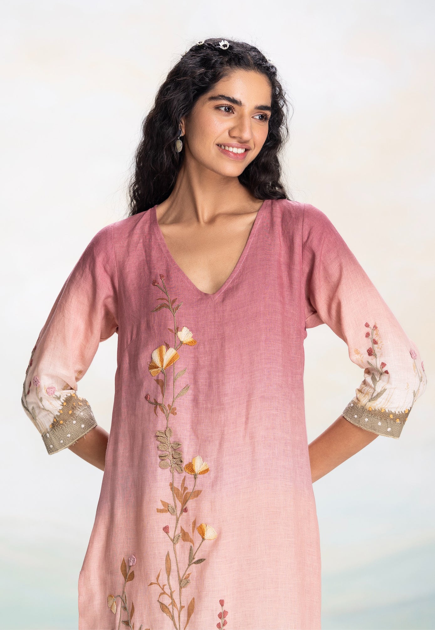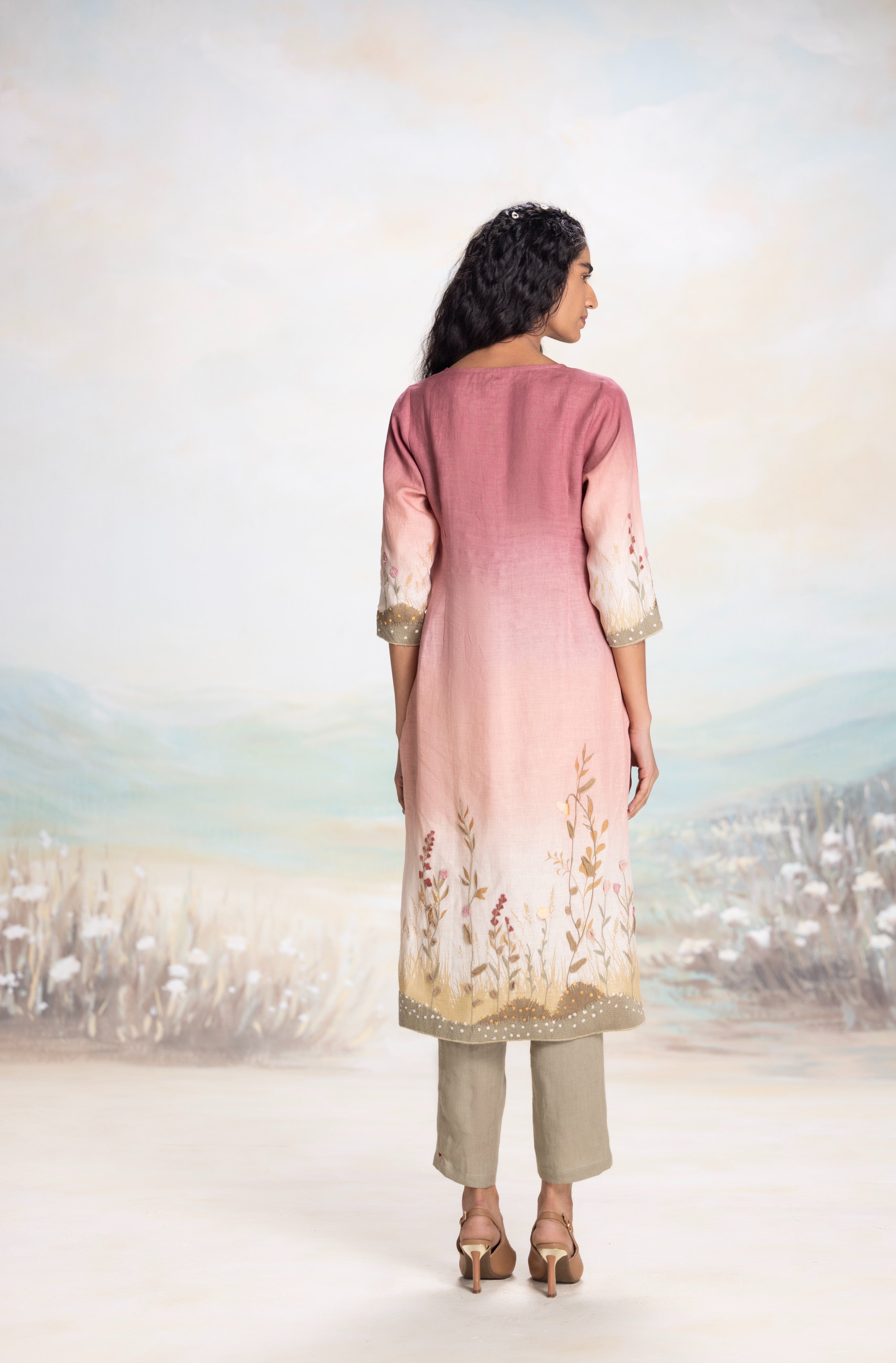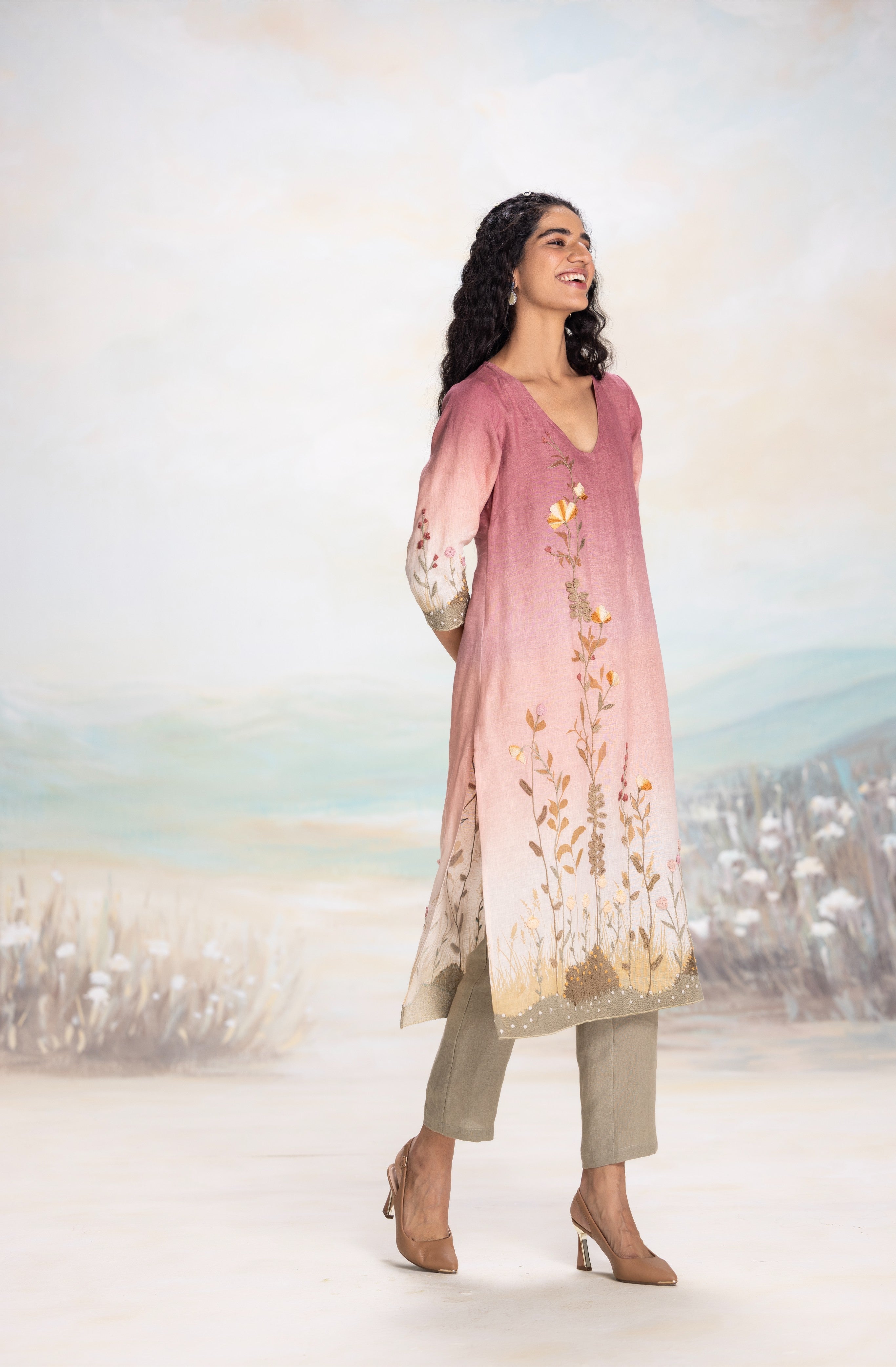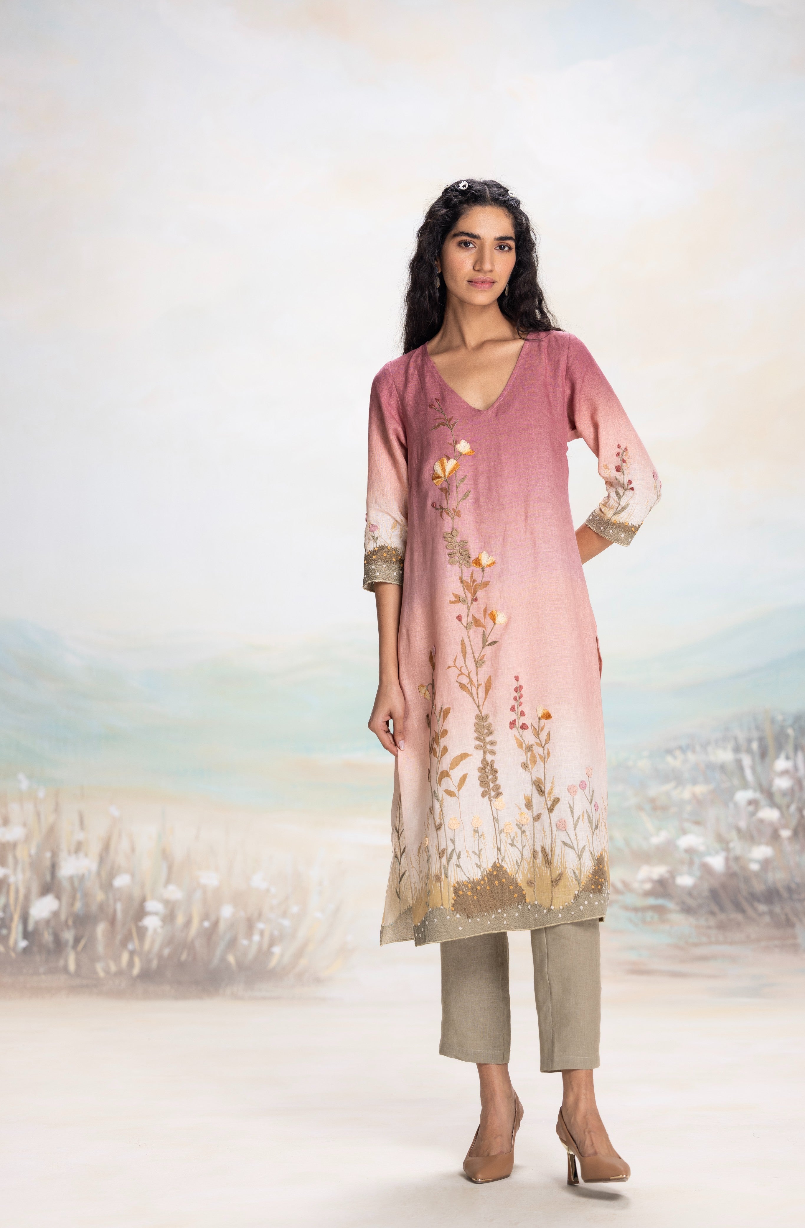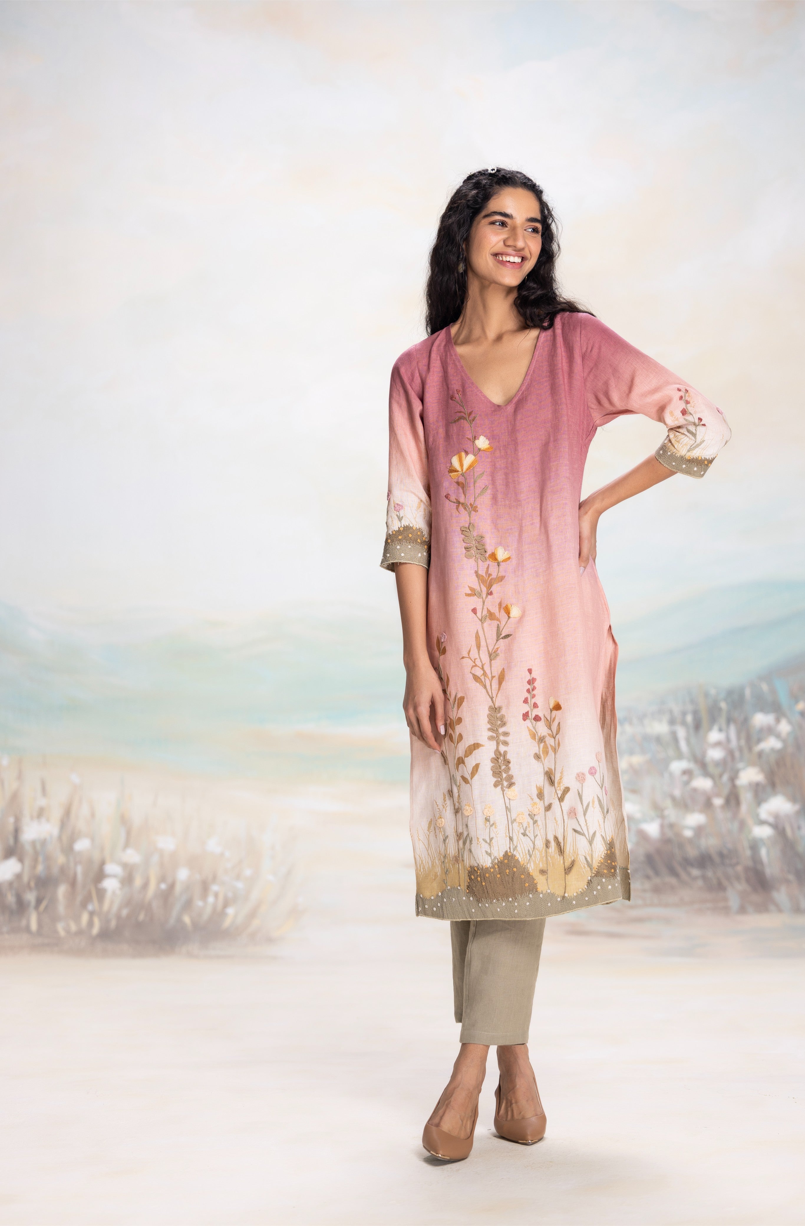Escape to tranquil outdoors with the poetic decadence of Landscape . A breathtaking collection that captures a sunny afternoon or sun-kissed horizons at sunset in luxurious linen. Each piece is bathed in soothing tonal ombre dip-dyed shades, enriched layer by layer with handmade crochet embroidery, screen printed and shadow painted flora and fauna. Intricate cotton thread embroidery buoyantly moves across the fabric adding depth and dimension to a picturesque meadow. Perfect choice for evening soirées or special occasions, these elegant styles honour craftsmanship at its finest- celebrating artistry and you.