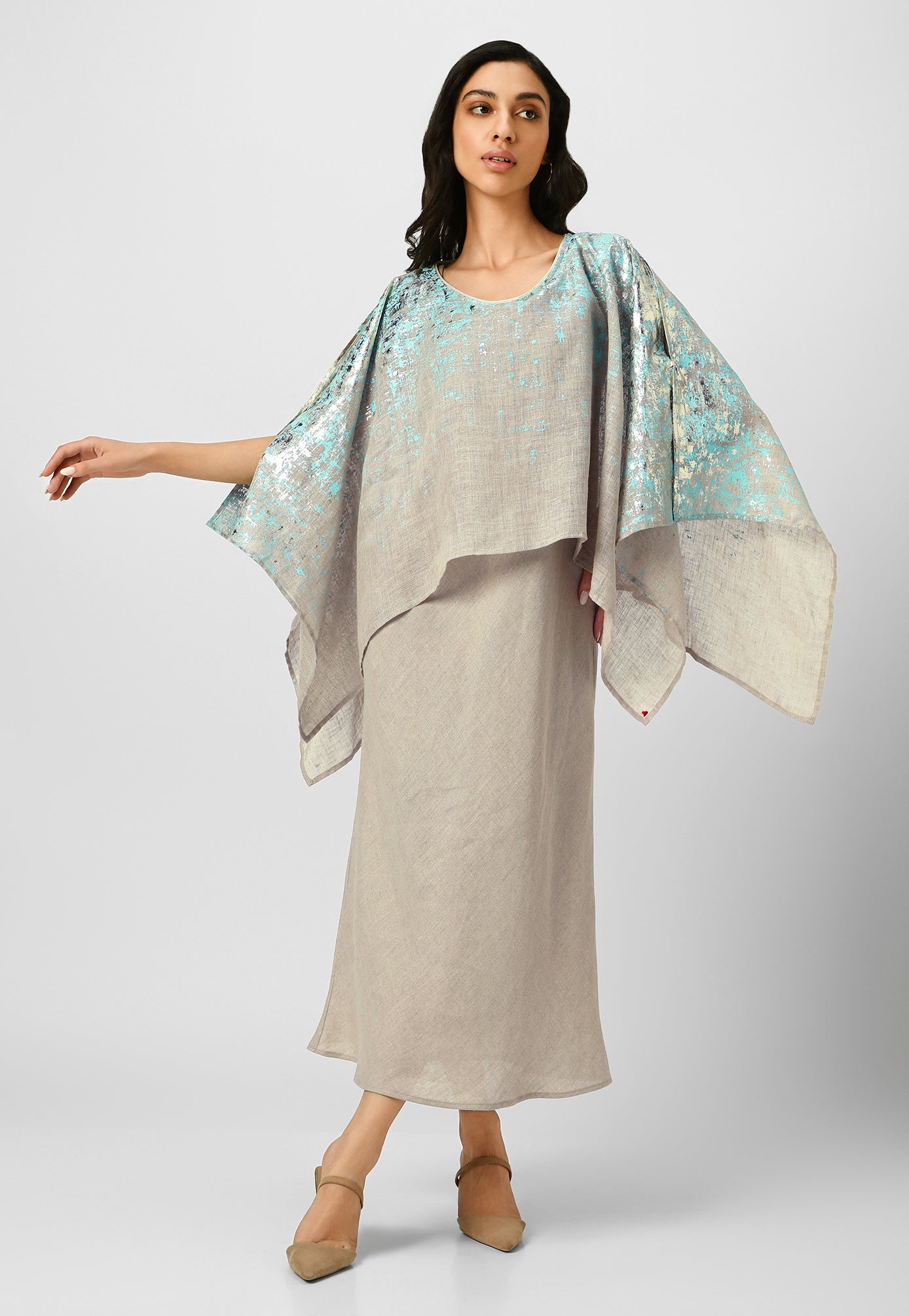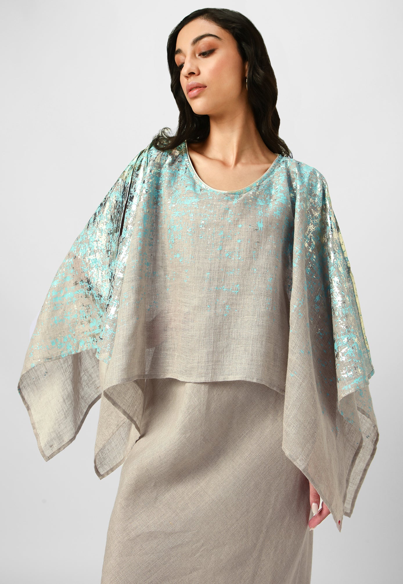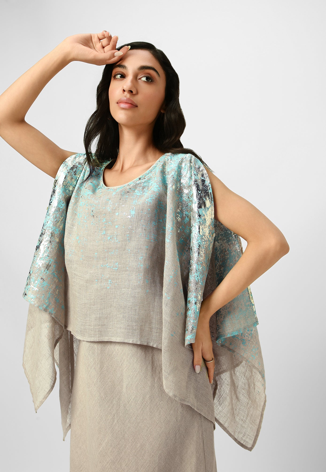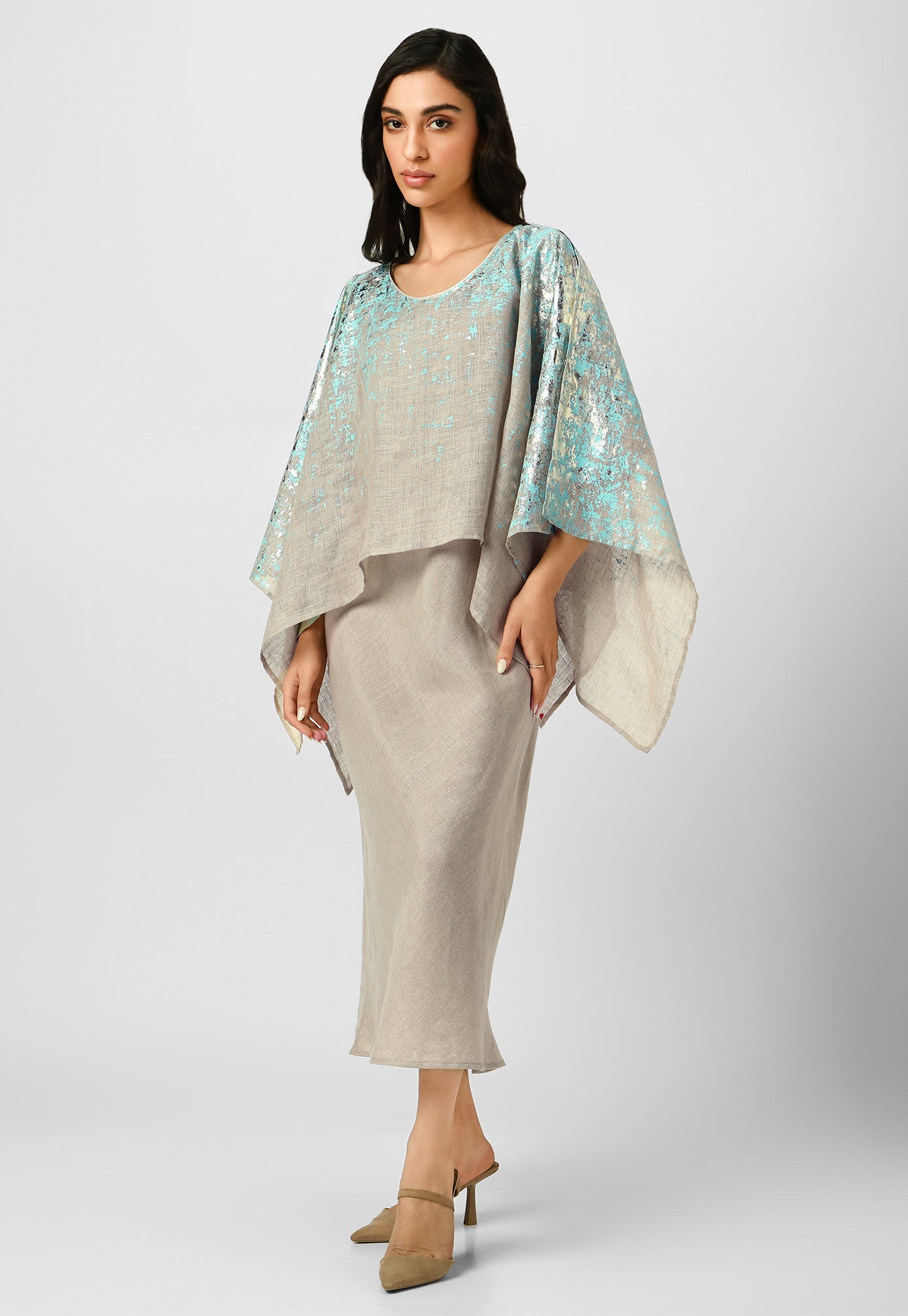 Step into paradise in a breezy work of art inspired by the rustic charm of Venetian walls. Crafted from the purest linen fabric in comfortable, angled silhouettes that beautifully curve on your body for your next getaway, this collection is masterfully shaded with captivating strokes and a touch of gold- using an amalgamation of foil and pigment- adding colour, depth and intrigue. Choose from a breathtaking combination of shades from neon-offwhite, natural-lagoon and lagoon-offwhite.
